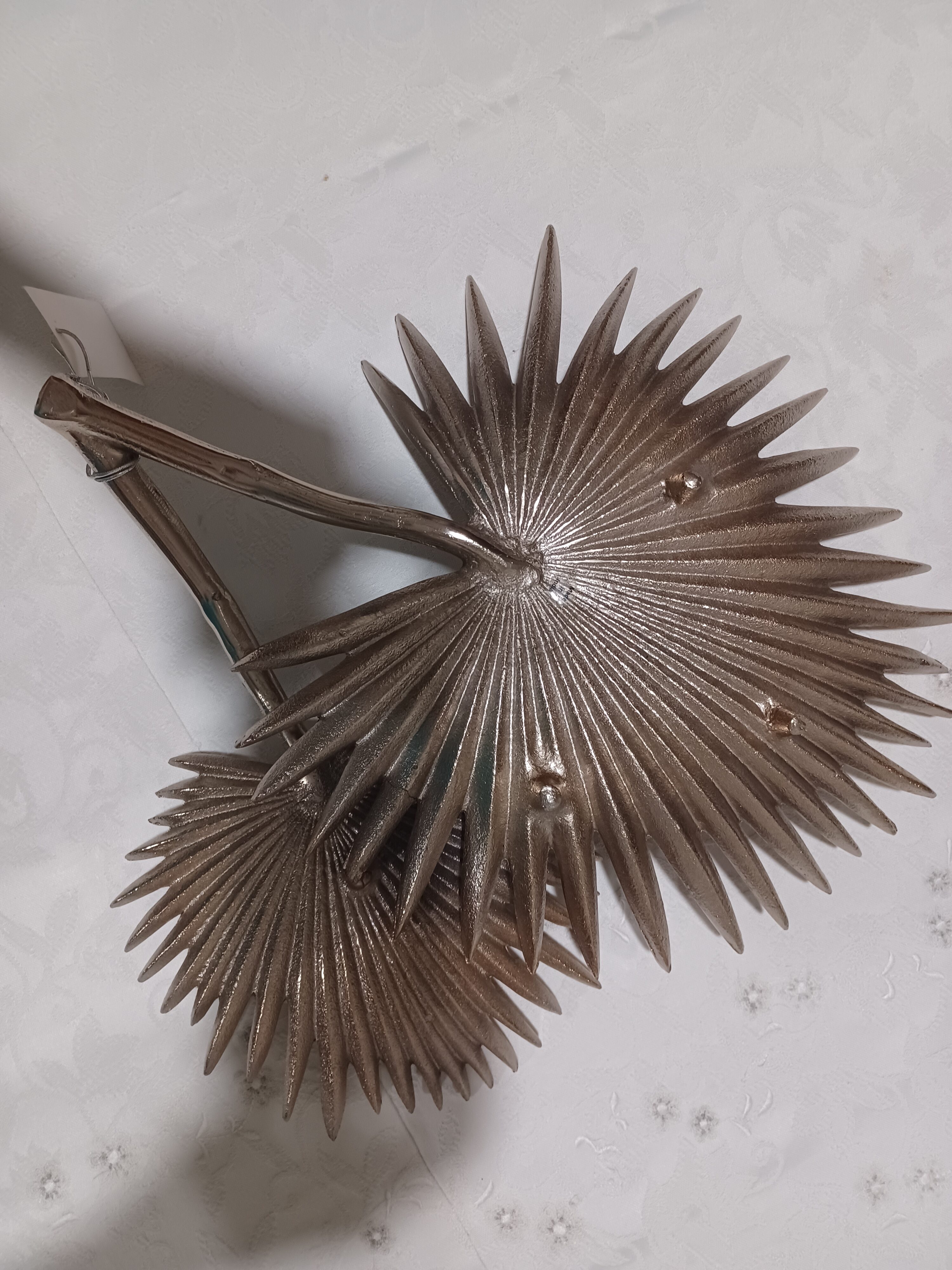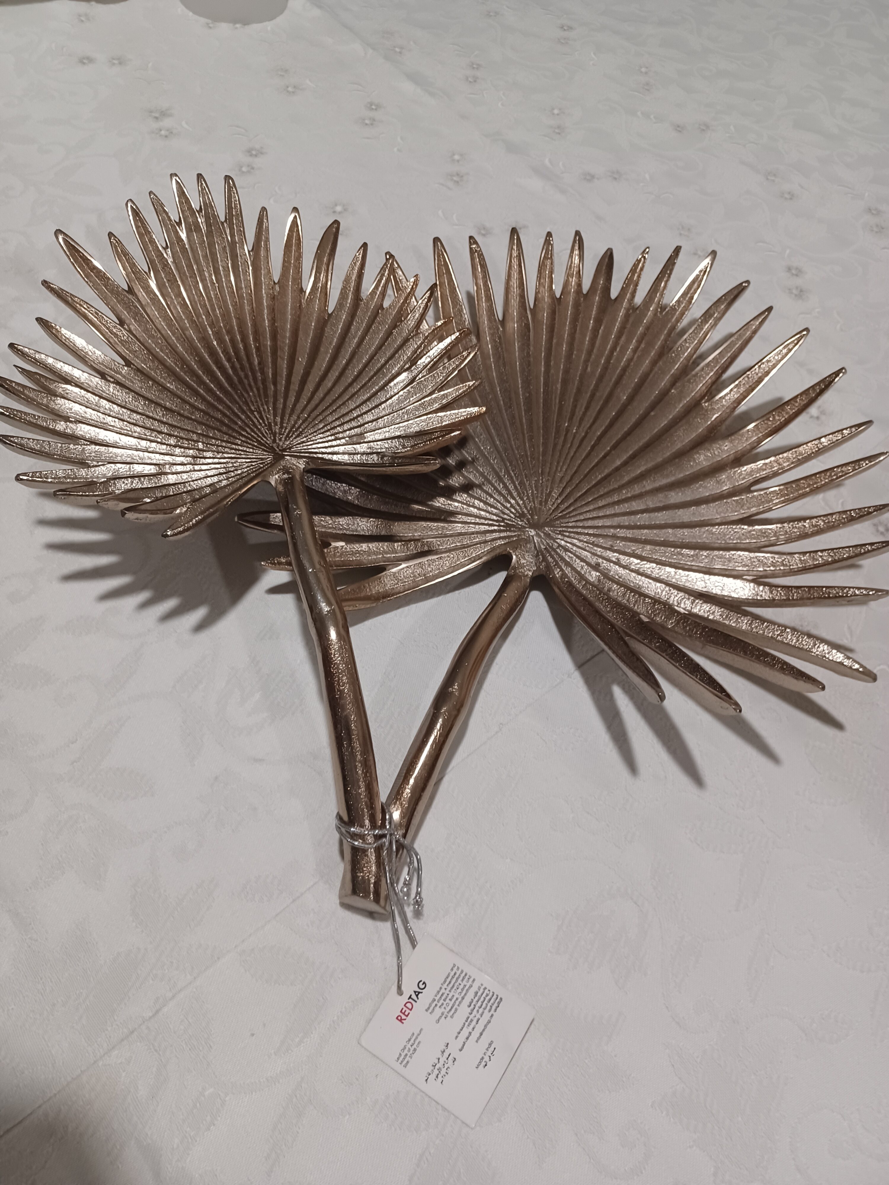 Imported decoration of 2 palm leaves made in metal with dull gold finish. Place these on a table or hang on the wall. Perfect for indoor or outdoor decoration.