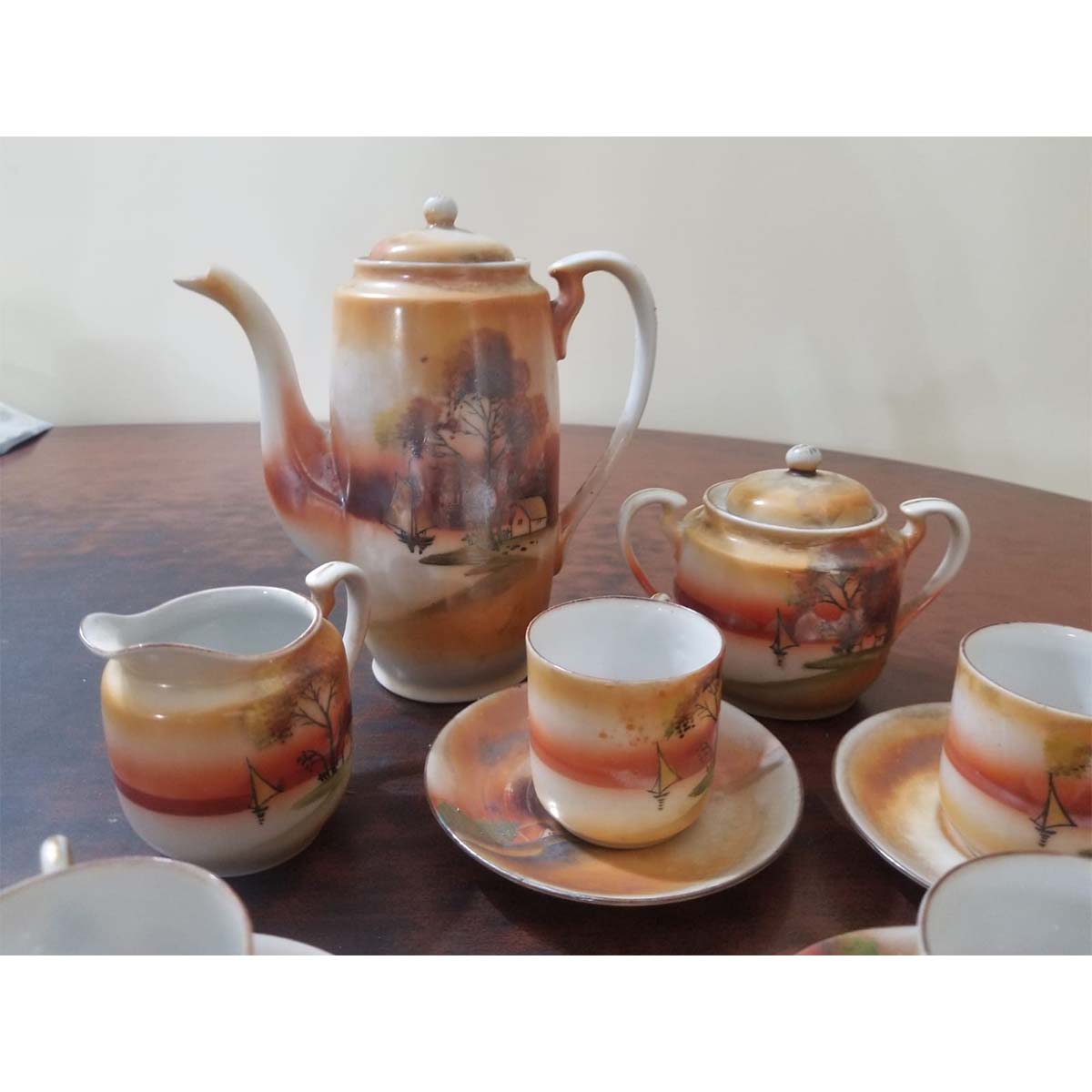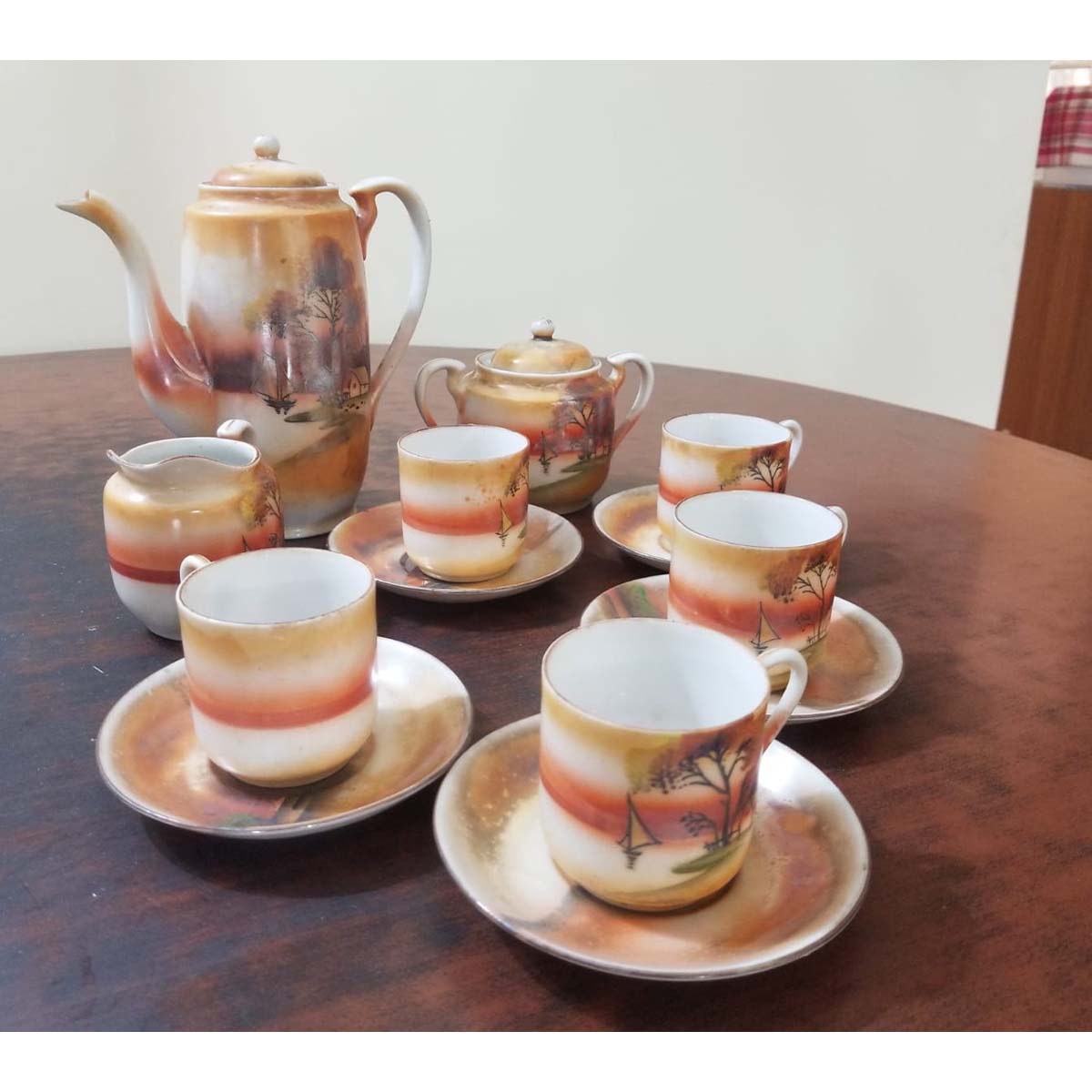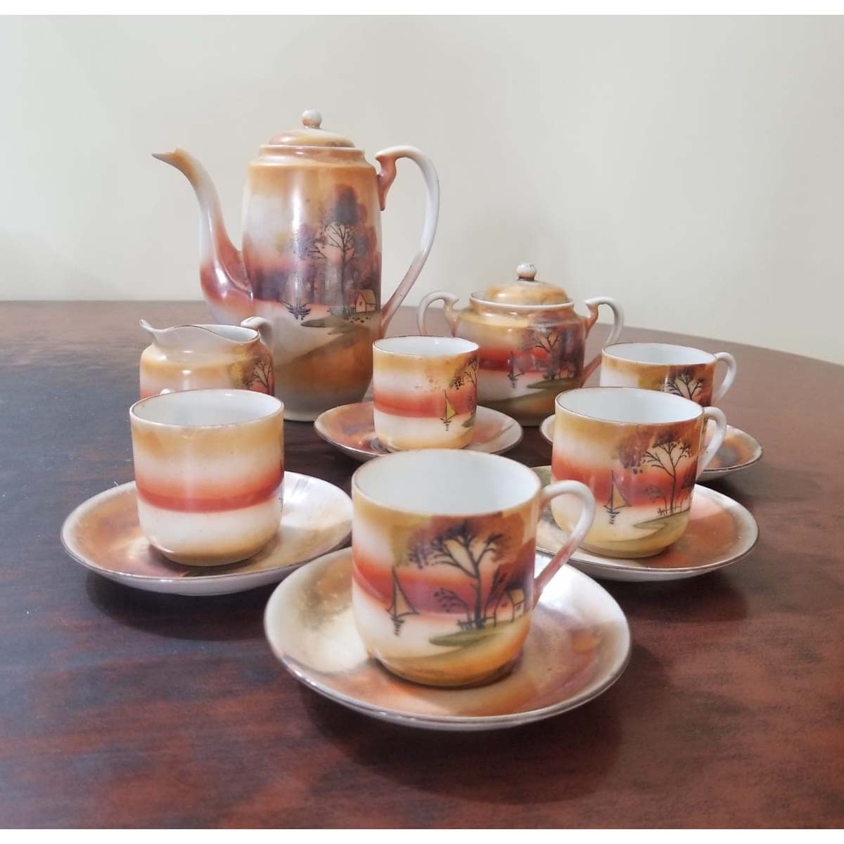 Japanese hand painted coffee set with sunrise/sunset Japanese landscape. Coffee set includes 5 cups and saucers, teapot, milk jar and sugar pot.