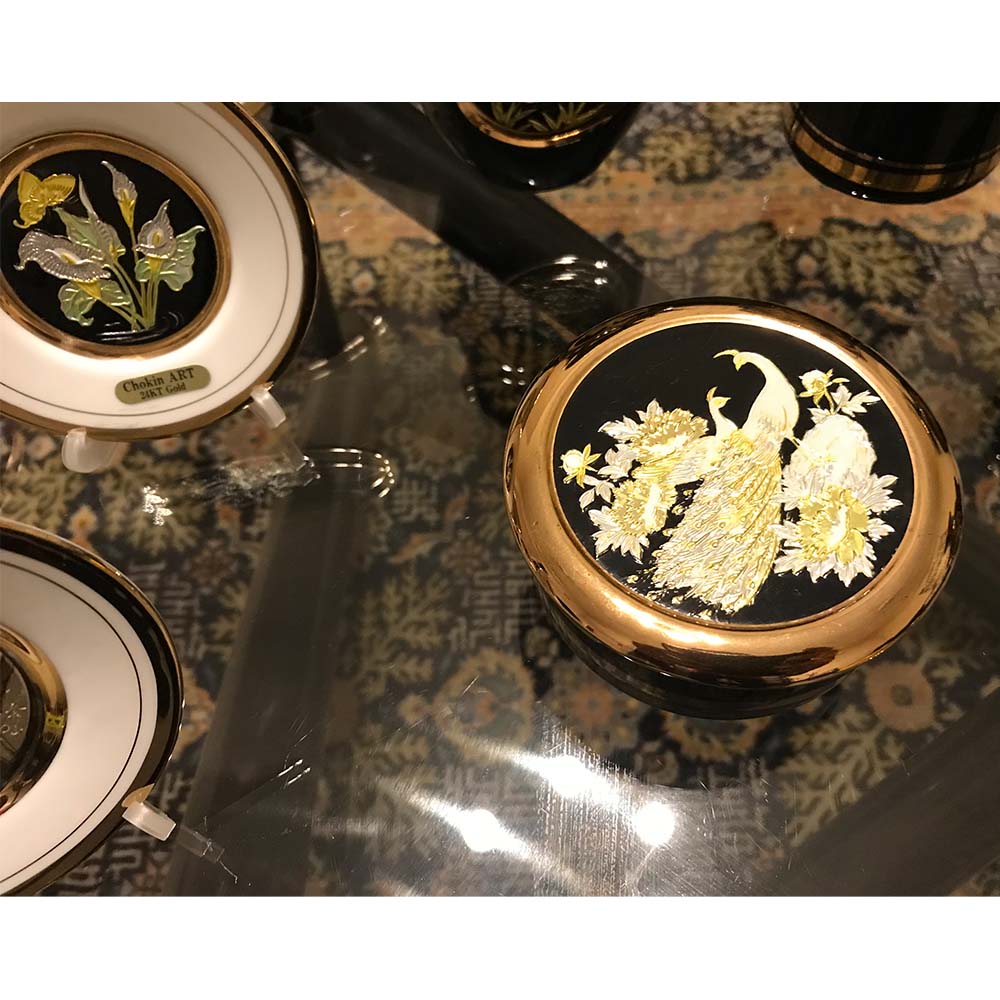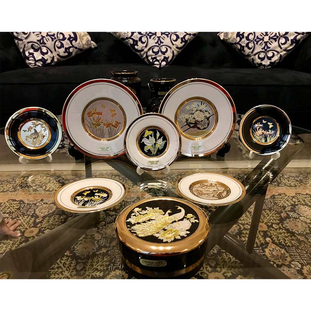 Vintage Japanese porcelain decor set in 24k Gold finish includes 5 (4 inch) plates, 2 (6 inch) plates, 1 (4 inch) box, 2 (4.5 inches) vases, 1 (6 inch) vase and 1 (5.5inch) vase.