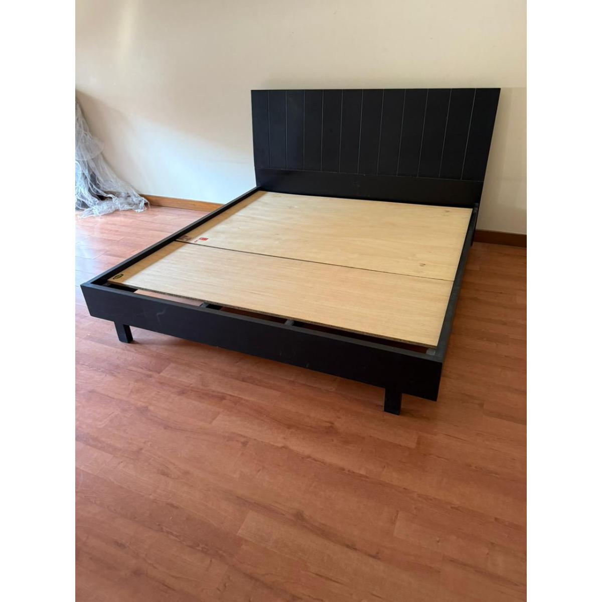 Wood and MDF king-size bed in matte black deco finish, originally purchased from Habitt. Comes with a matching pair of bedside tables. Classic, minimal design with panel headboard.