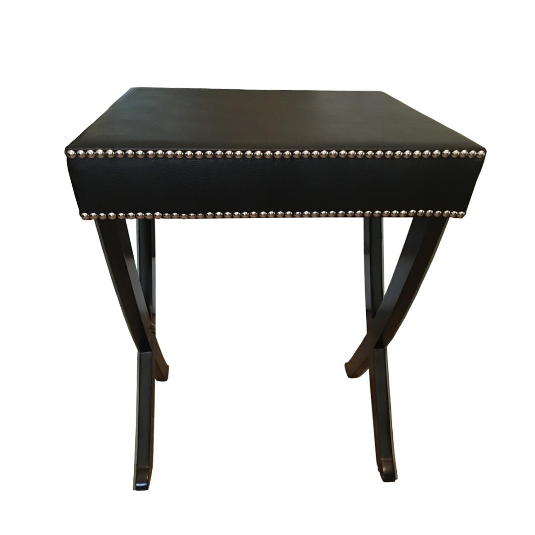 A fully covered leatherette side table, finished with antique studs and mirrored cross legs.