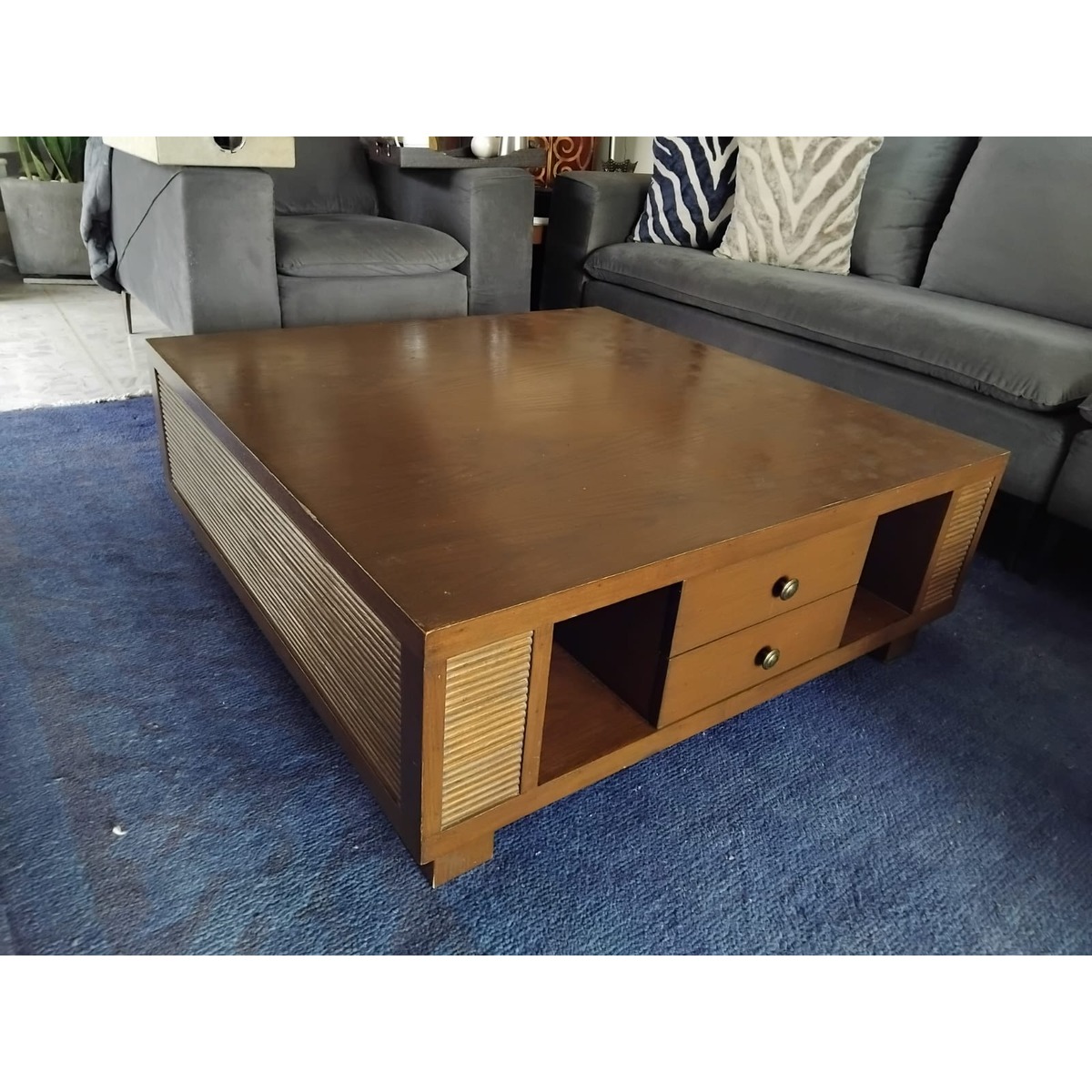 Center table in an ochre polish shade with drawers and shelves at the base to store remotes, coasters, etc. This is the perfect center table for a casual lounge.