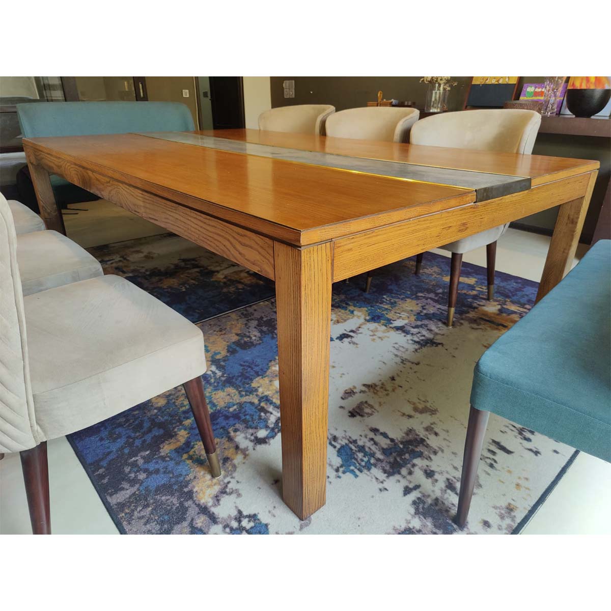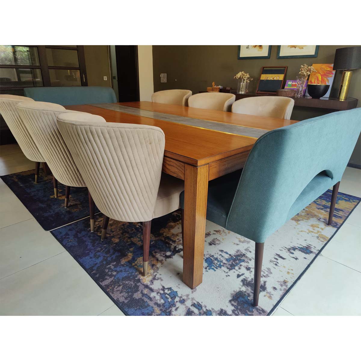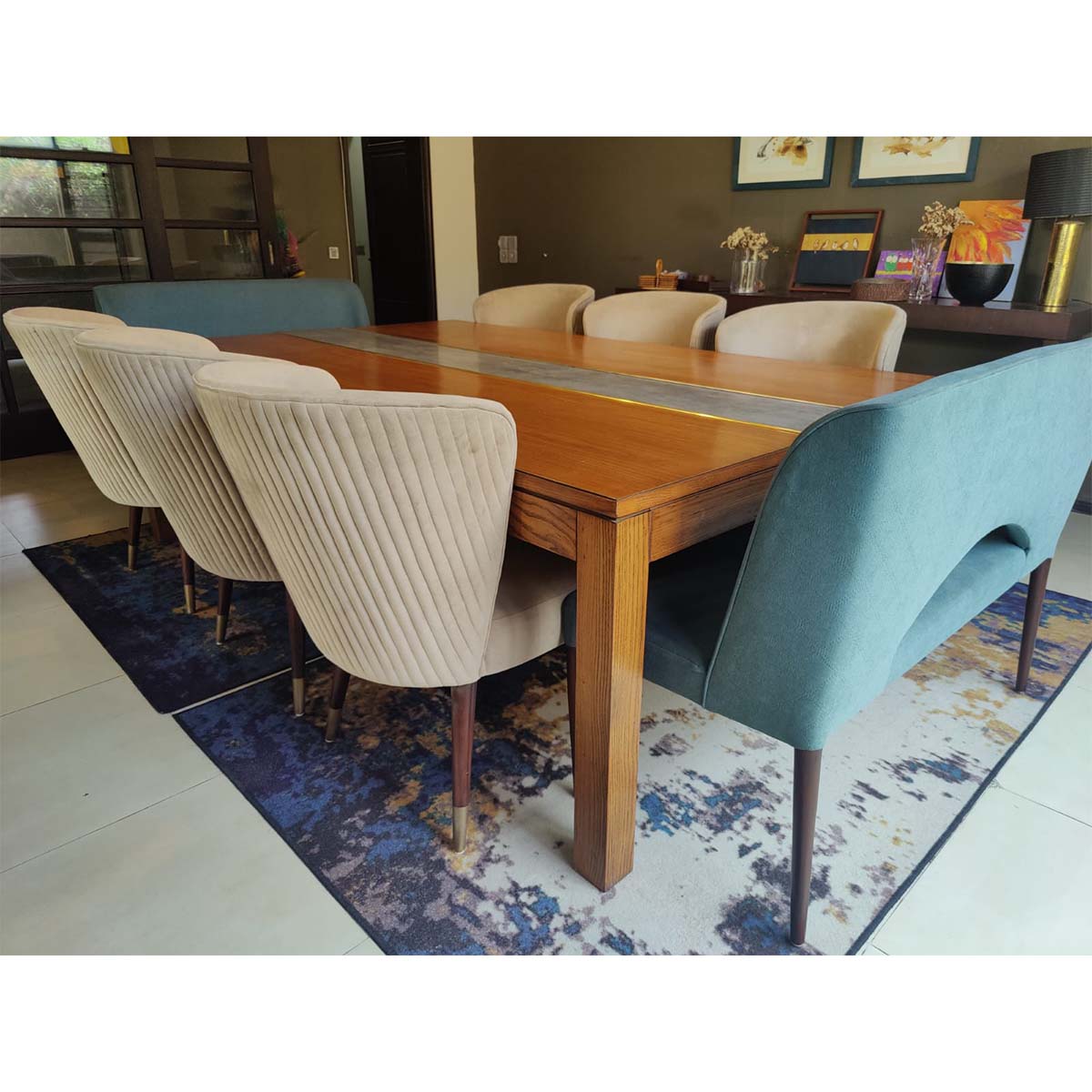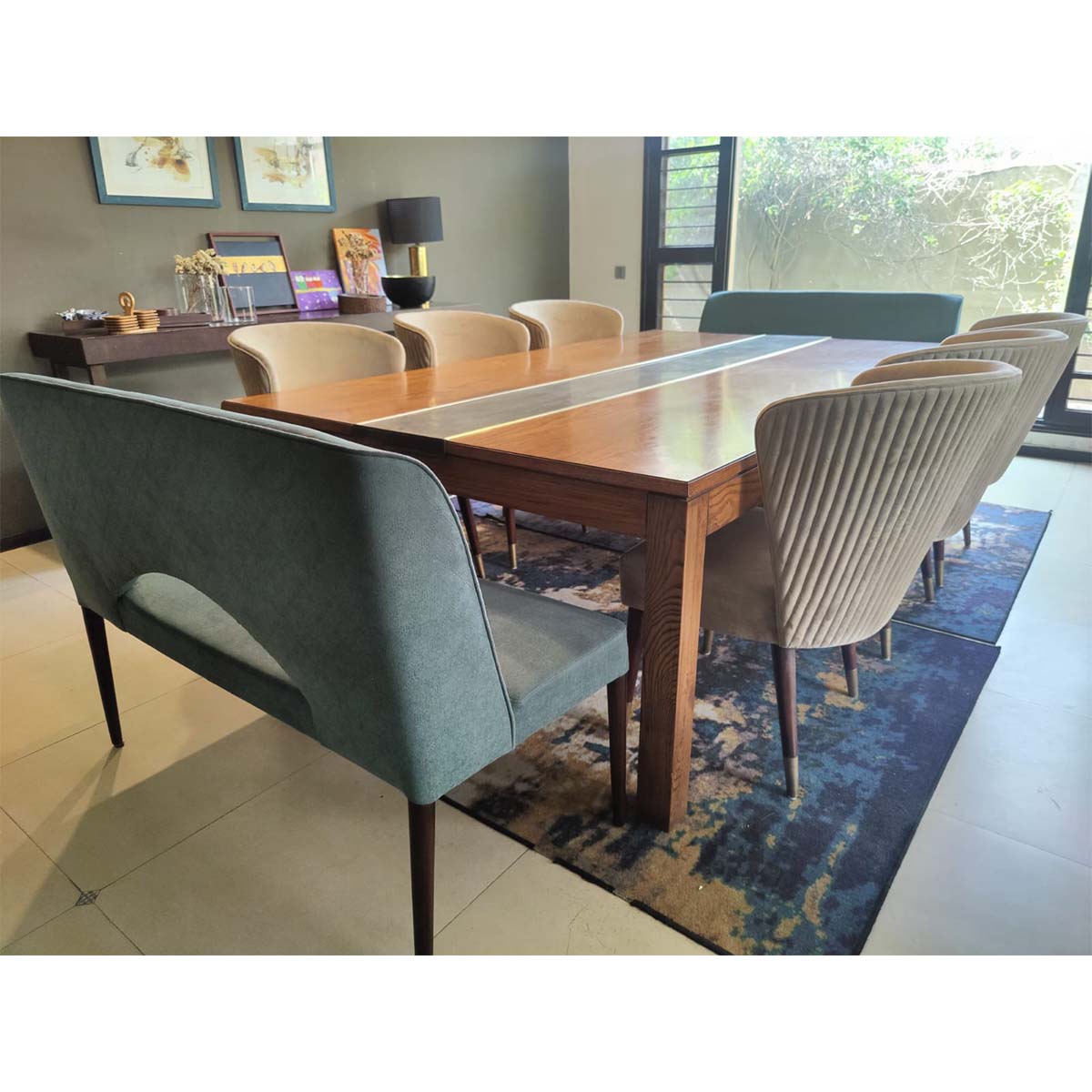 Modern dining table set includes a spacious rectangular dining table with a unique stone inlay stripe running in the middle for a touch of elegance, pair of benches in powder blue soft suede easily seating two on each , 6 bucket shaped chairs in dual cream suede, brass tips adorn these chairs’ legs for refinement. This set seats a total of 10.