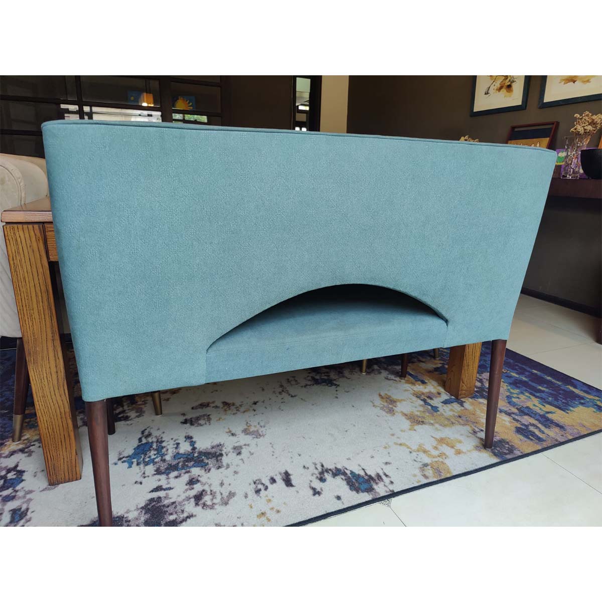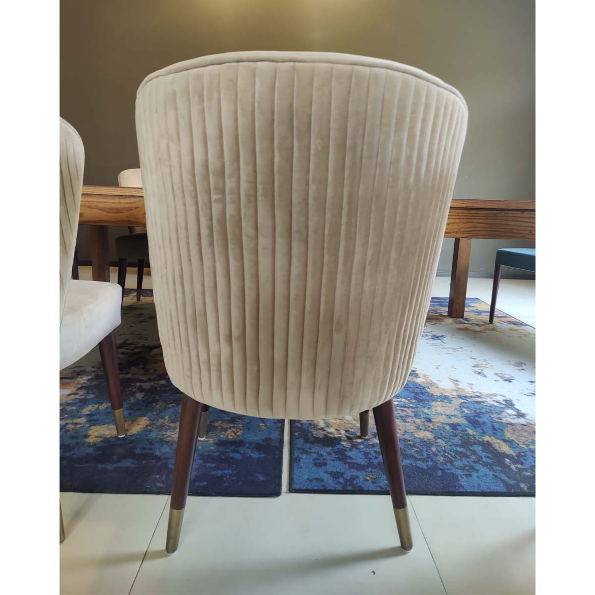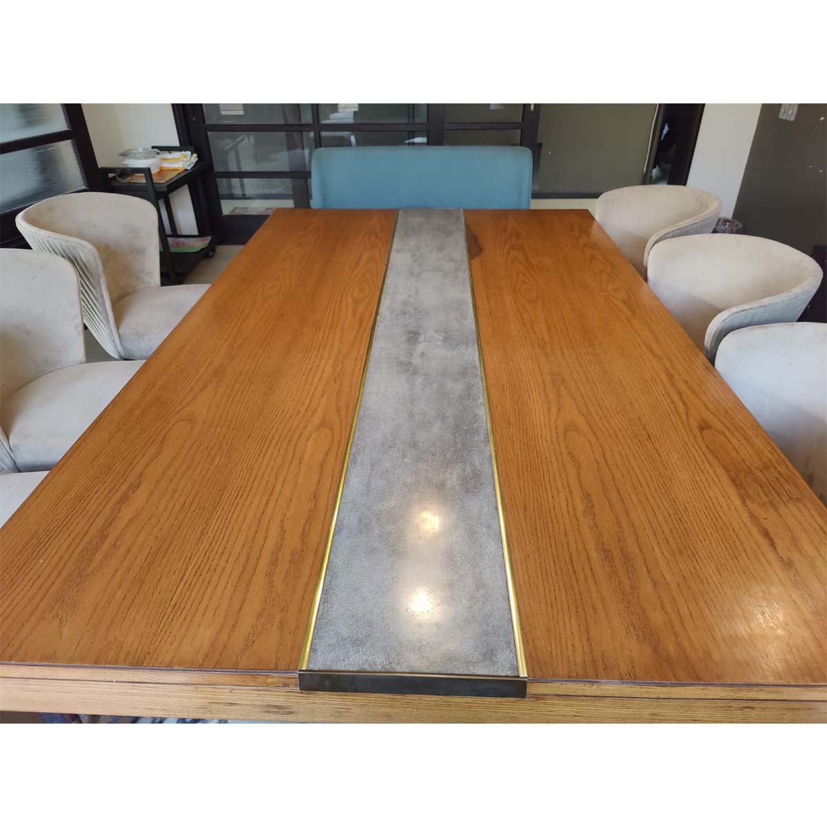 Modern dining table set includes a spacious rectangular dining table with a unique stone inlay stripe running in the middle for a touch of elegance, pair of benches in powder blue soft suede easily seating two on each , 6 bucket shaped chairs in dual cream suede, brass tips adorn these chairs’ legs for refinement. This set seats a total of 10.
