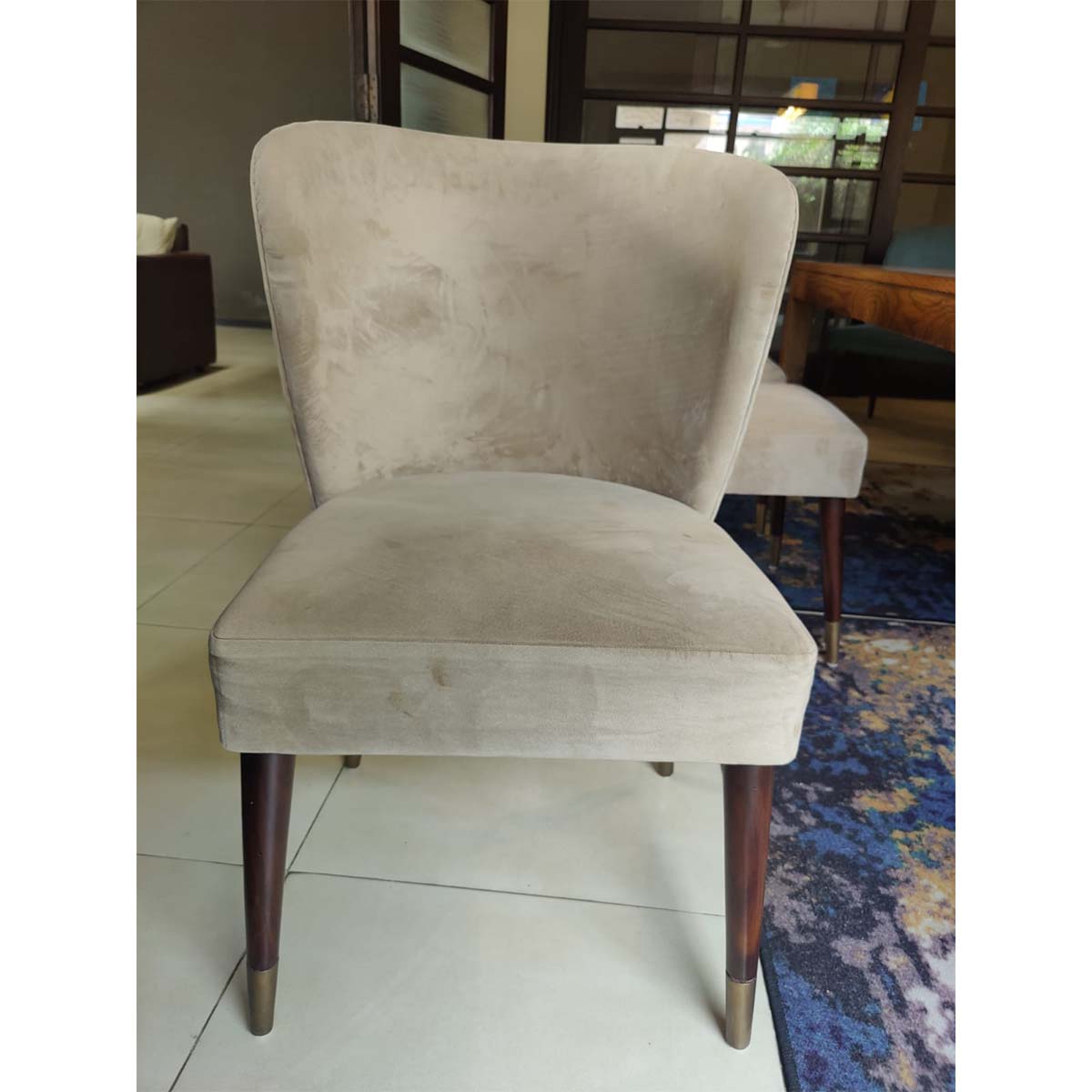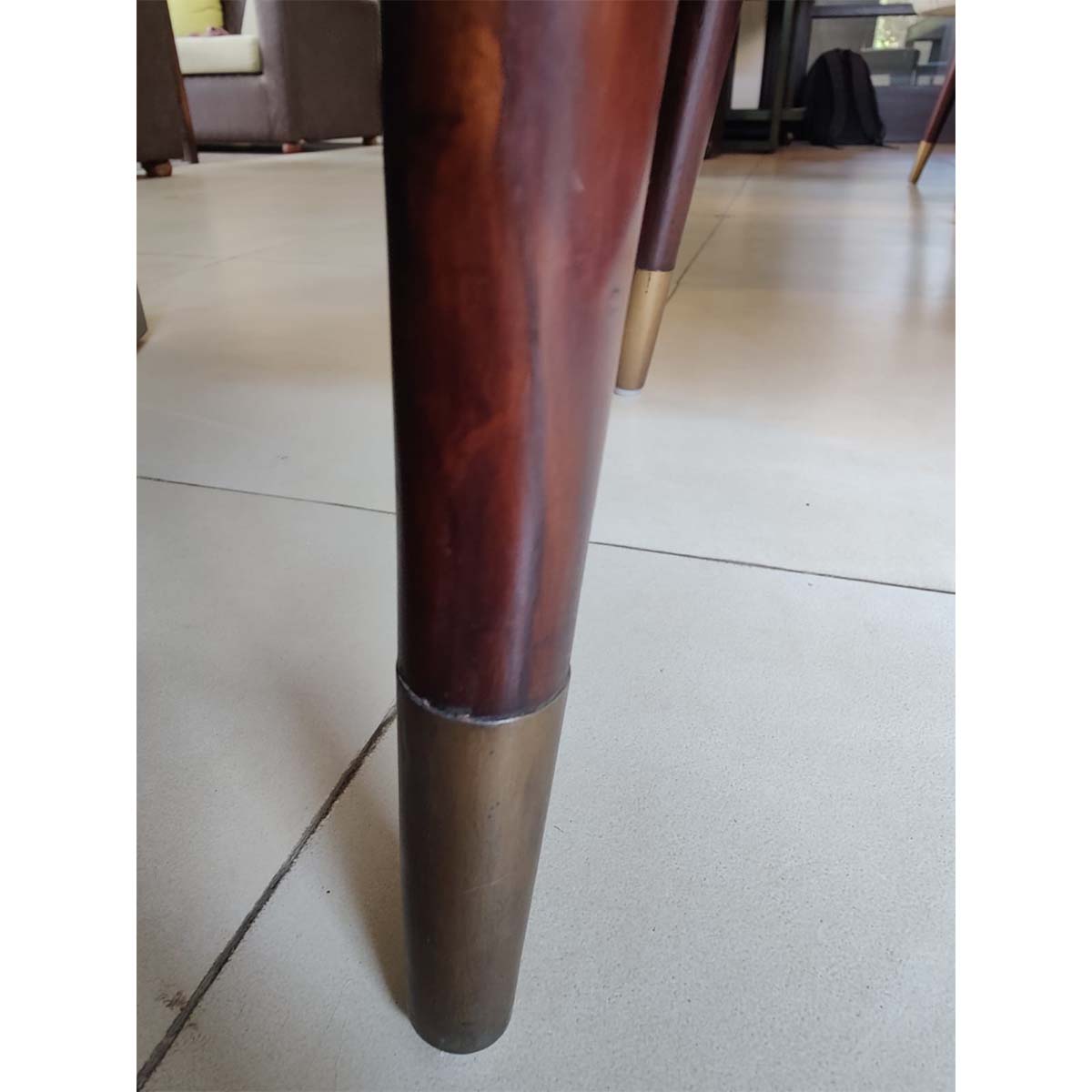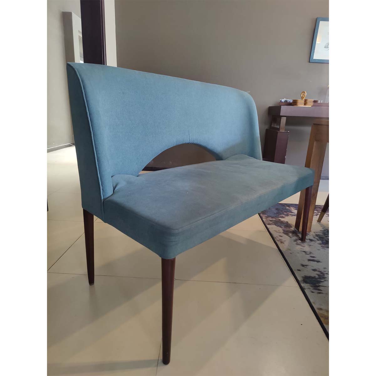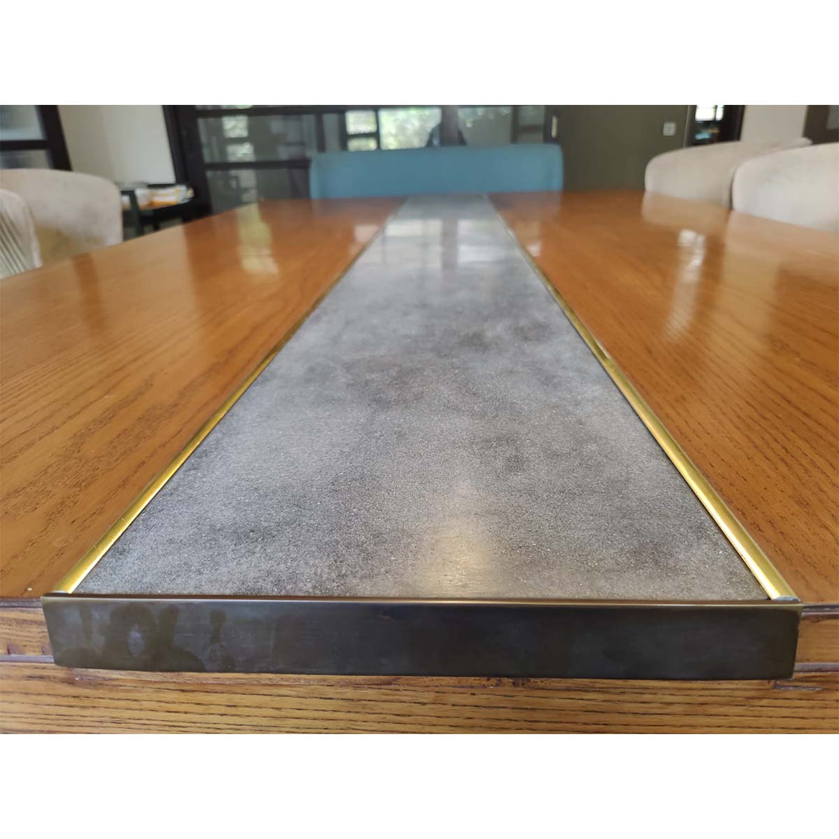 Modern dining table set includes a spacious rectangular dining table with a unique stone inlay stripe running in the middle for a touch of elegance, pair of benches in powder blue soft suede easily seating two on each , 6 bucket shaped chairs in dual cream suede, brass tips adorn these chairs’ legs for refinement. This set seats a total of 10.