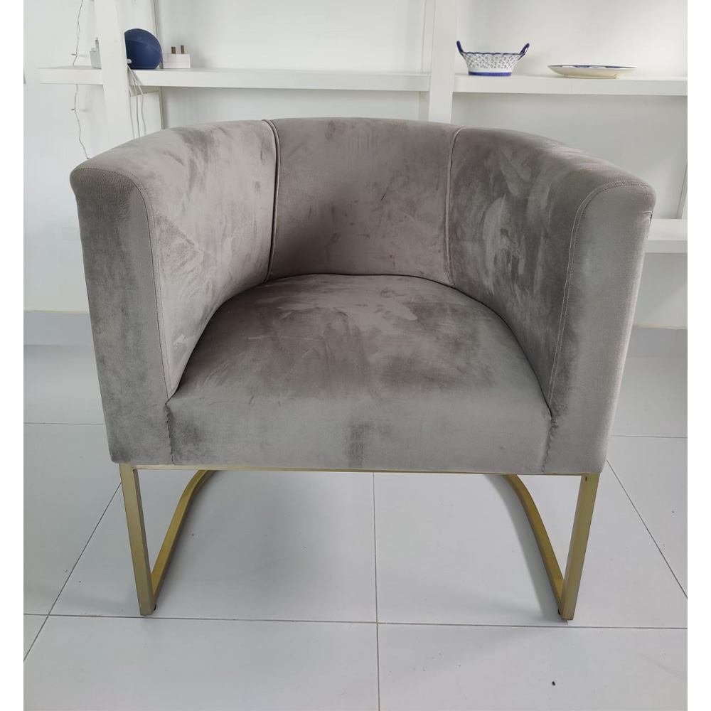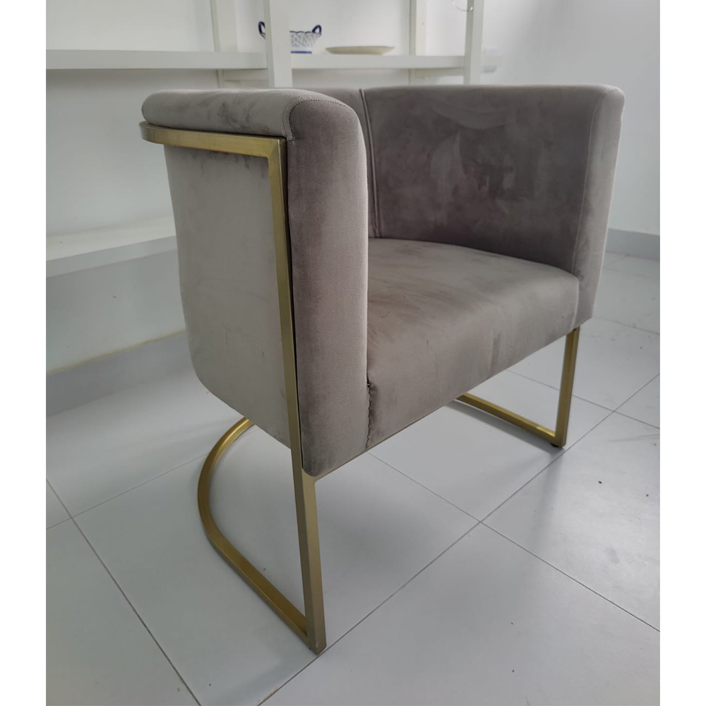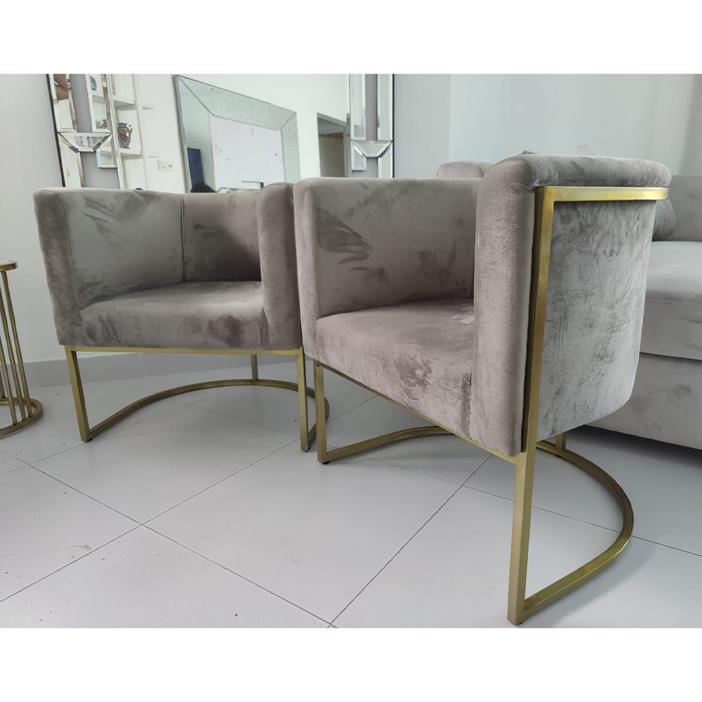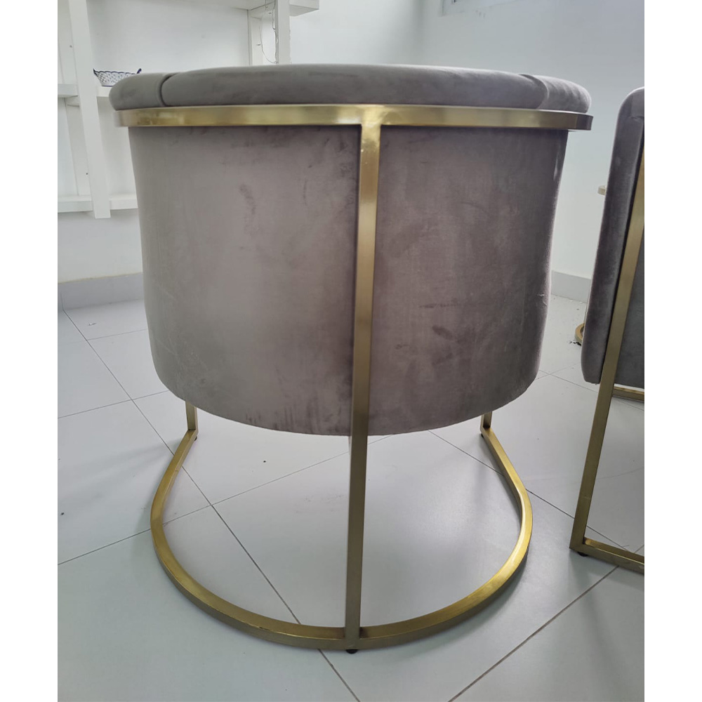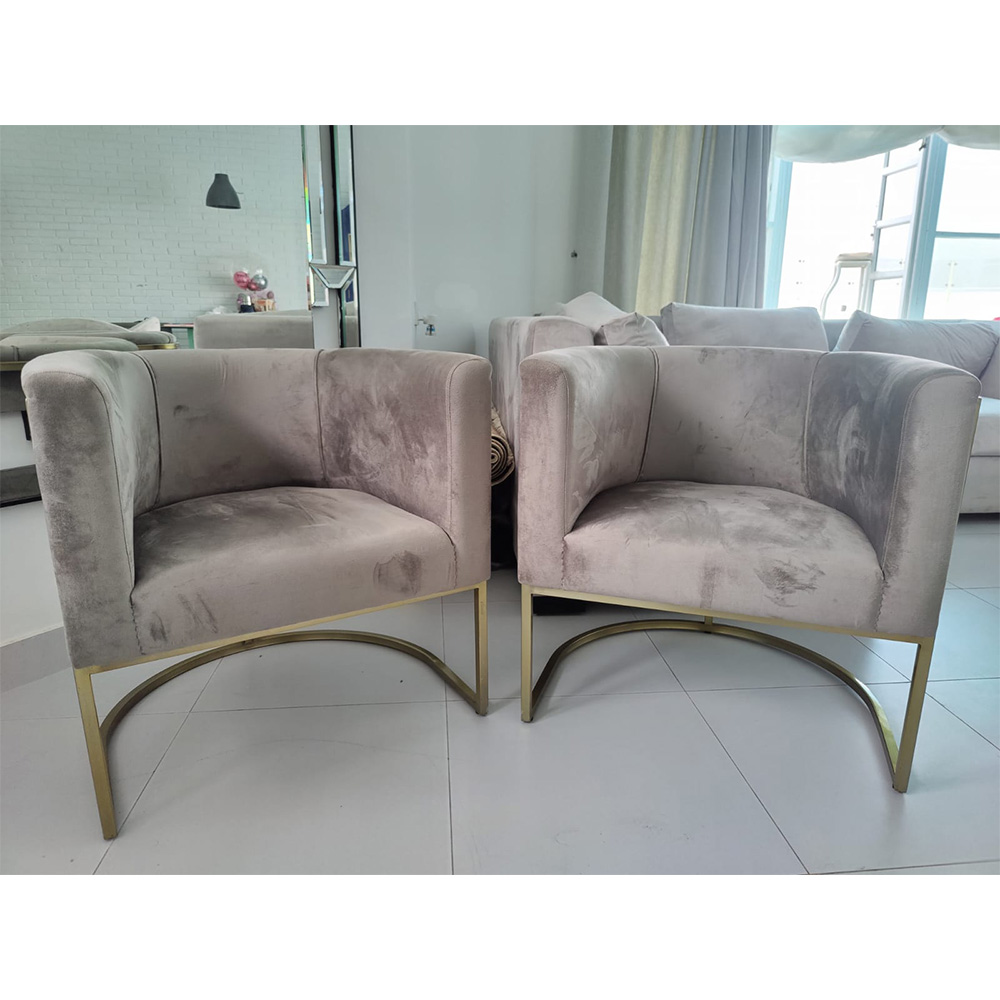 Pair of chairs with barrel shaped back and upholstered in soft suede with with solid stainless steel brush brass finished base that adds luxurious look to these chairs designed by Beena Amin Furniture.