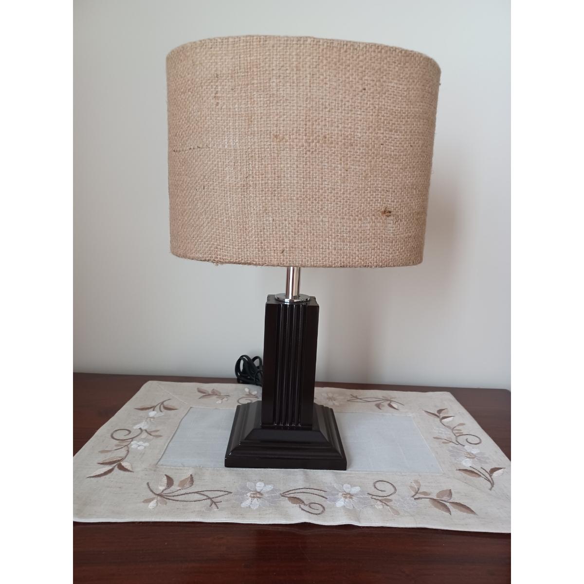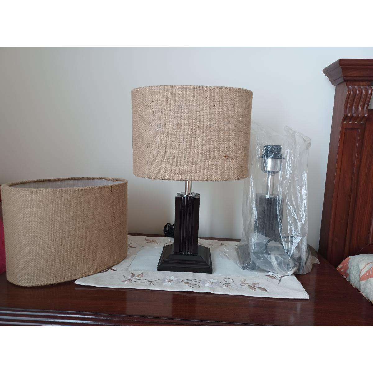 Brand new, never been used pair of lamps in wood with a neutral cotton jute fabric shade that will suit any bedroom or lounge.