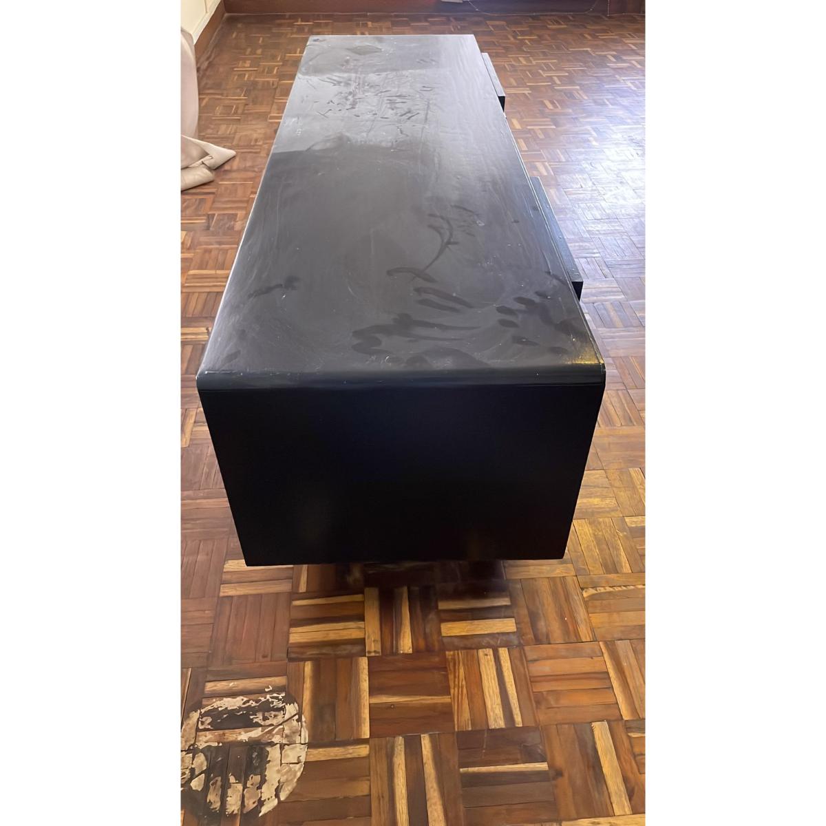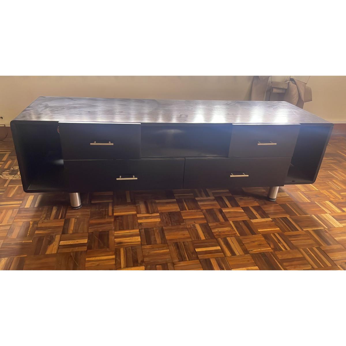This sleek and sturdy TV console is perfect for any modern living room featuring 4 drawers and two open side compartments for ample storage of electronics, accessories, or decor.