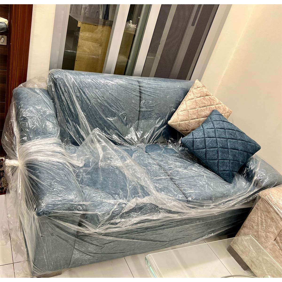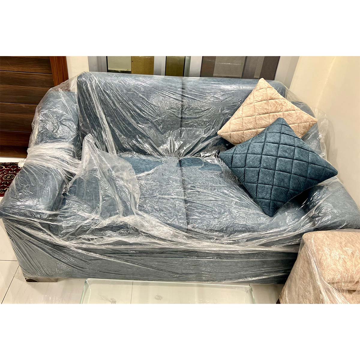 Brand new custom ordered 2 seater sofa upholstered in imported Turkish fabric, comes with matching cushions.