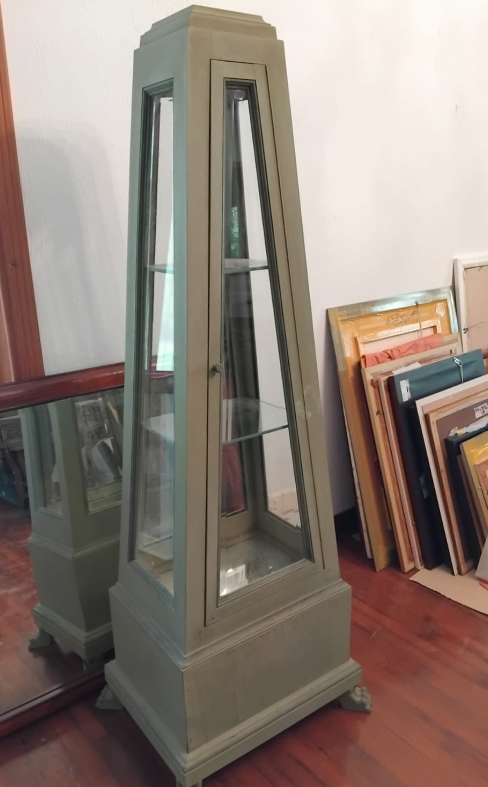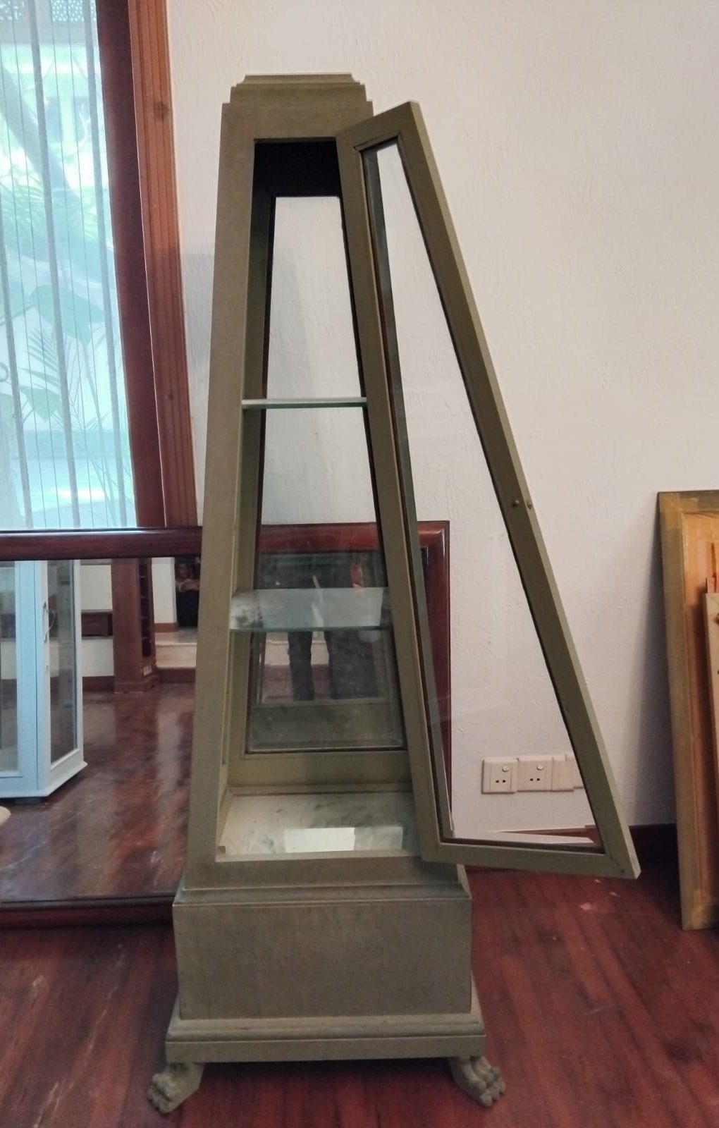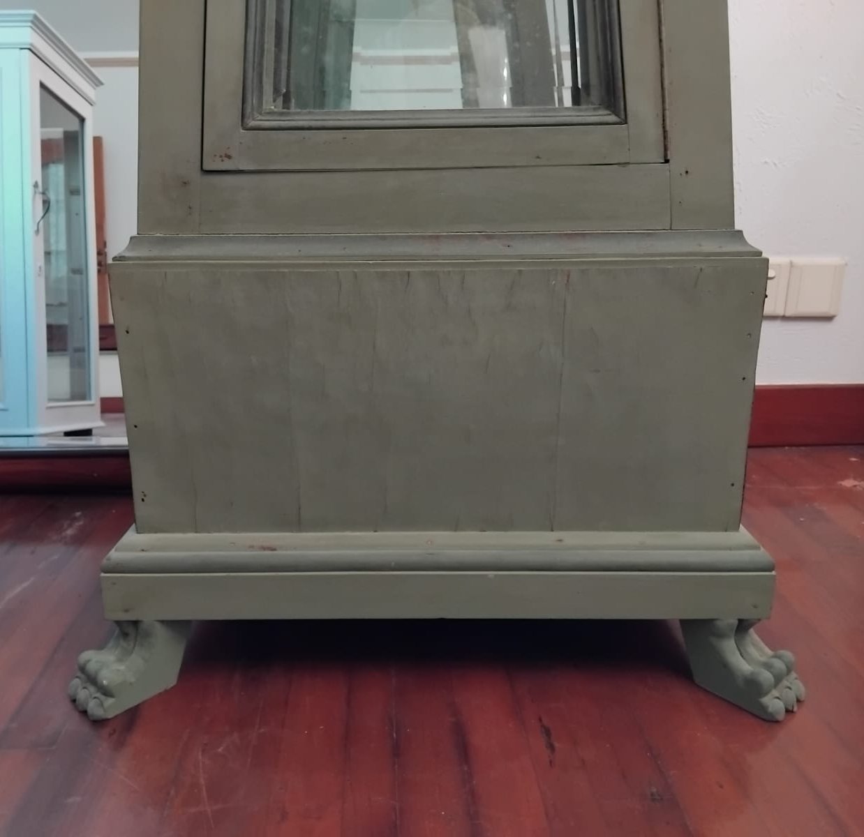 Make a bold statement with this striking obelisk-shaped display cabinet. Its unique rococo design with claw footed base, painted in sage green , adds a touch of drama and intrigue to any space.