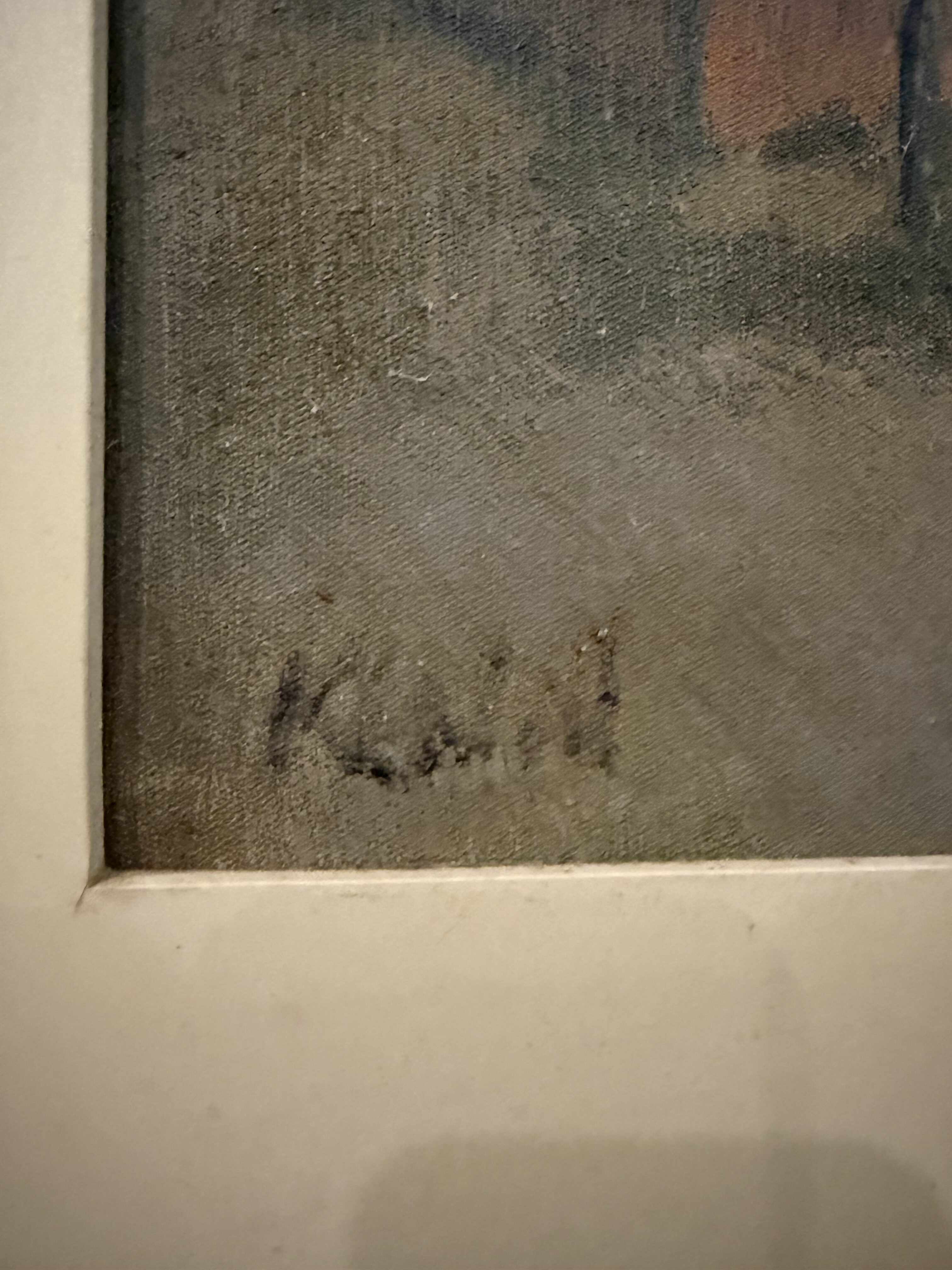 Oil painting by renowned Lahore artist Khalid, the canvas depicts a hazy village scene with several figures in motion. Signed on bottom left corner and framed.