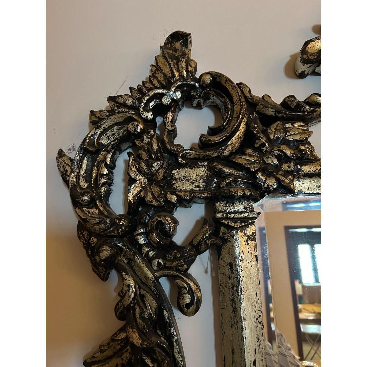 Exquisite wall mirror featuring an ornate design hand-carved wooden frame finished in a distressed gold tone. This mirror brings grandeur and vintage charm to an entrance or formal living area. The intricate craftsmanship makes it a standout décor piece.