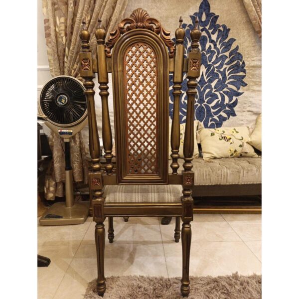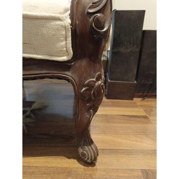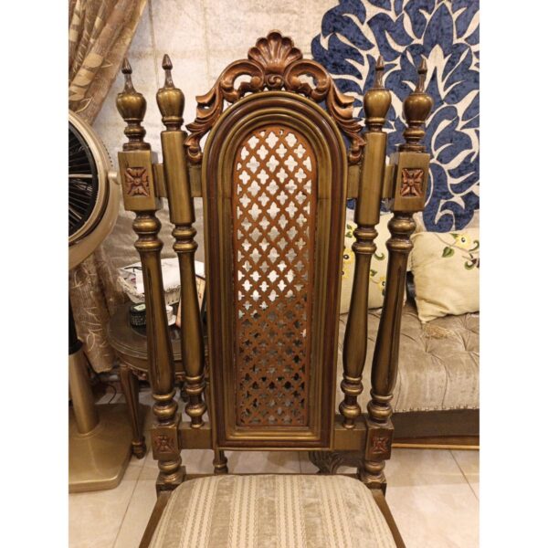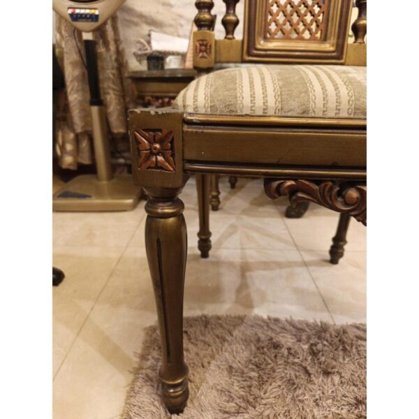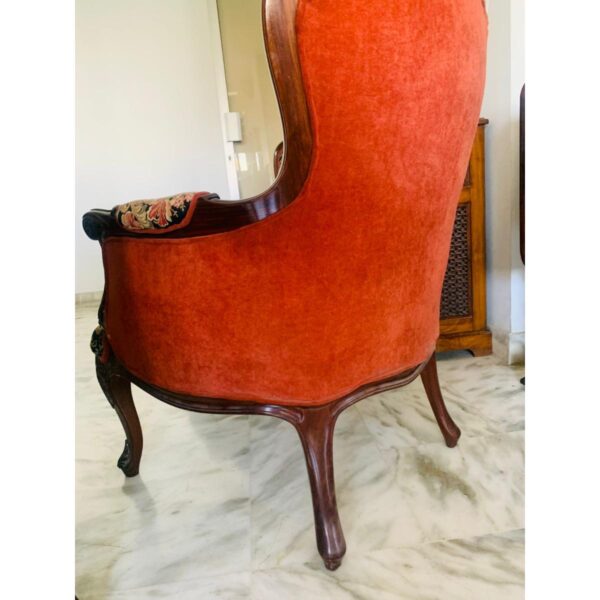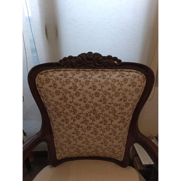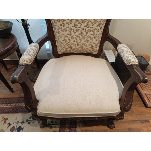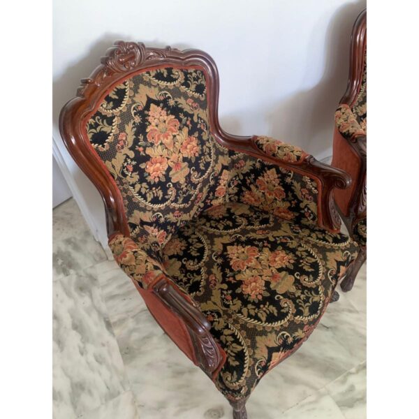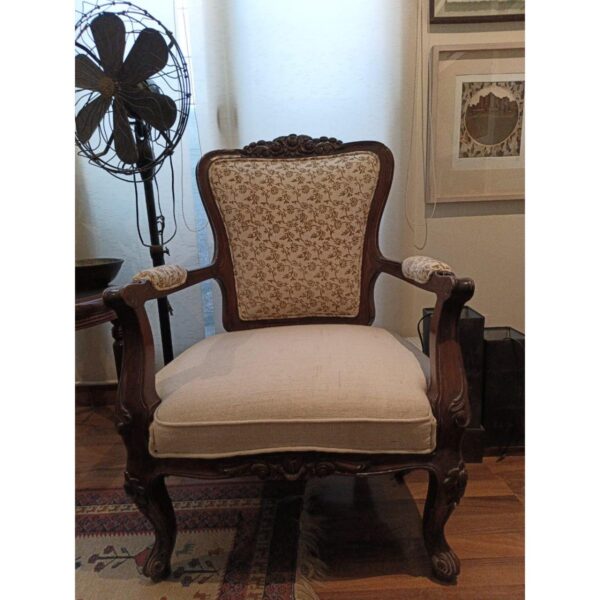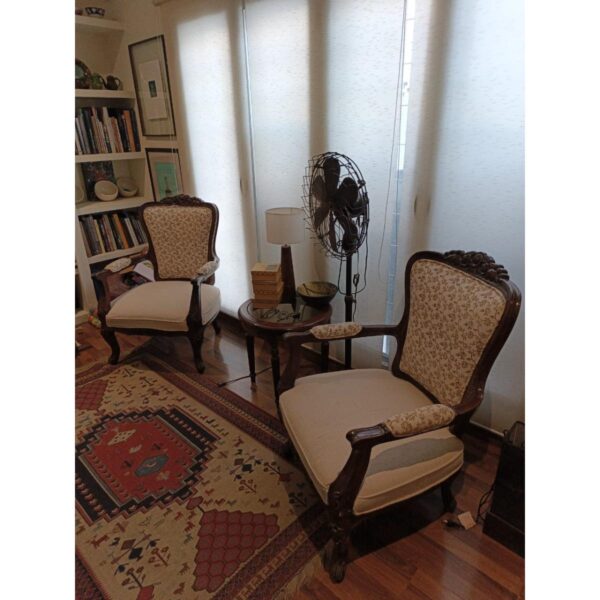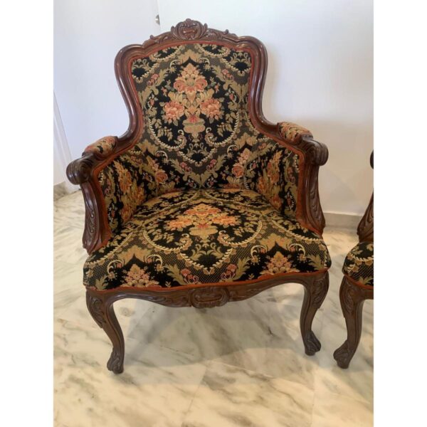 A pair of arm chairs feature classic carved frame and not only provides comfortable seating but also adds a touch of timeless elegance and craftsmanship to the space.