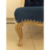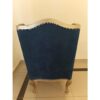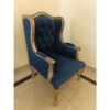 Elegant tufted wingback chairs in deep blue velvet with antique-gold Sheesham wood frames, paired with a matching round side table featuring a glass top—perfect for a formal lounge or drawing room.