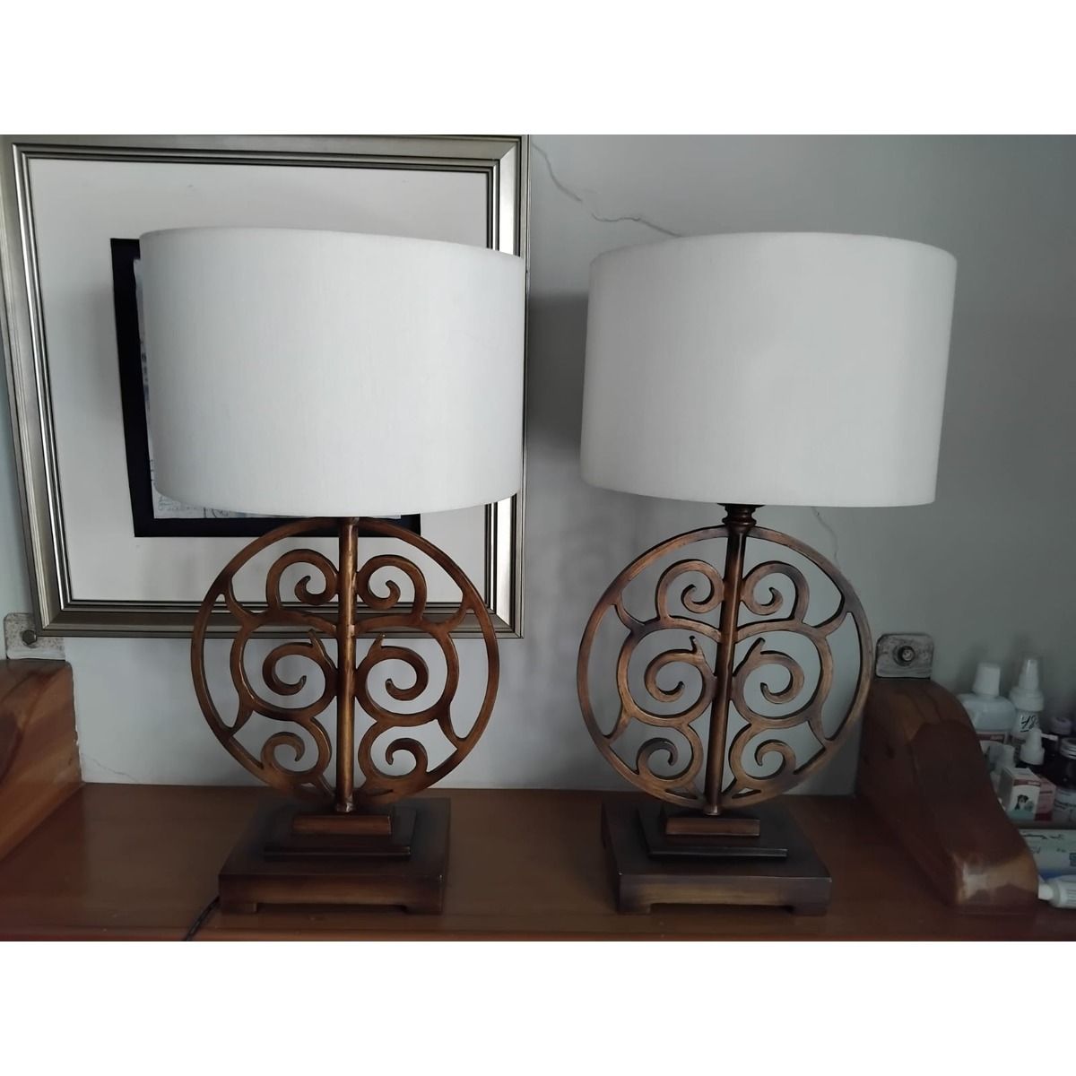 Pair of stylishly designed lamps with metal carving center standing on wooden bases, comes with fabric shades. Perfect for a formal living room or to elevate a lounge.