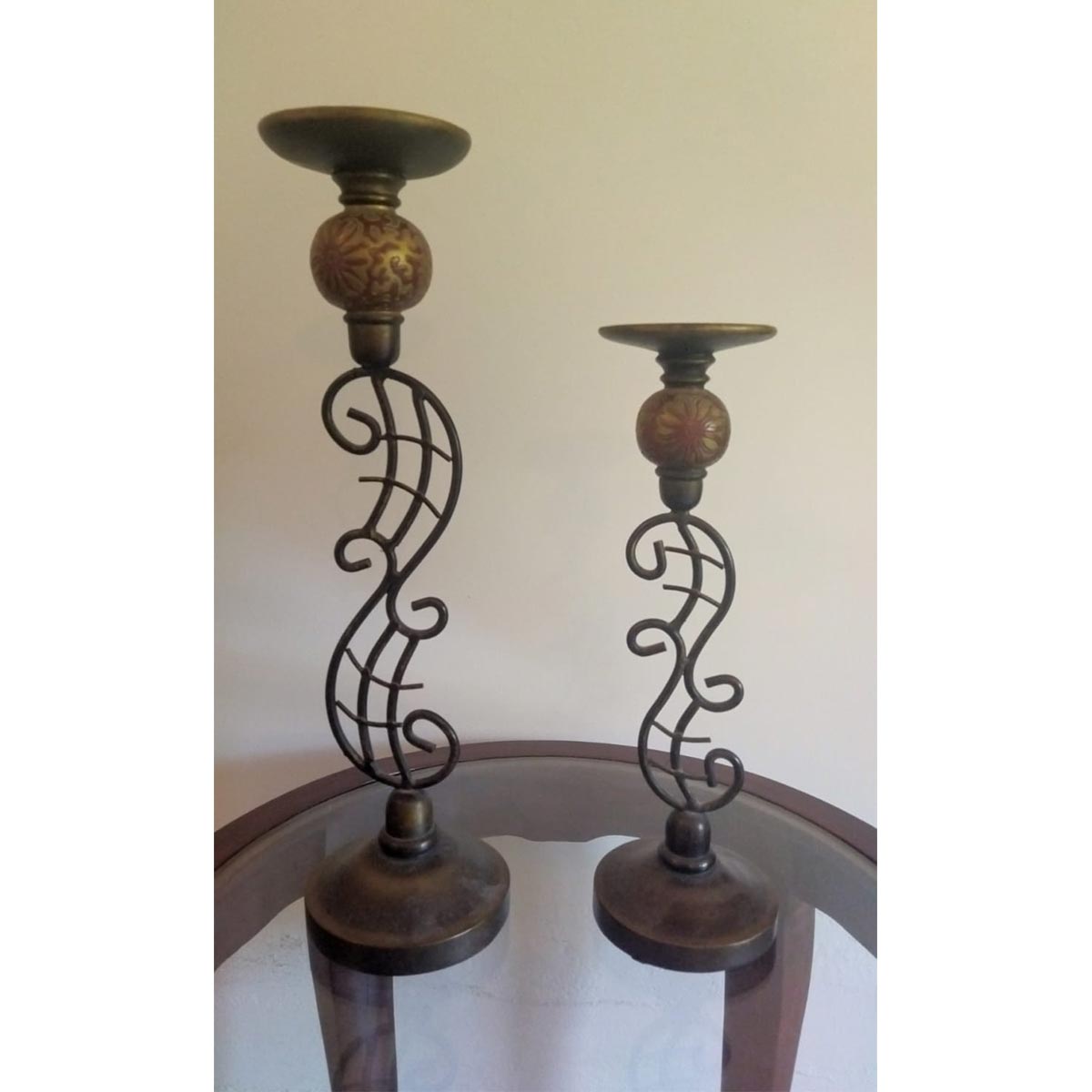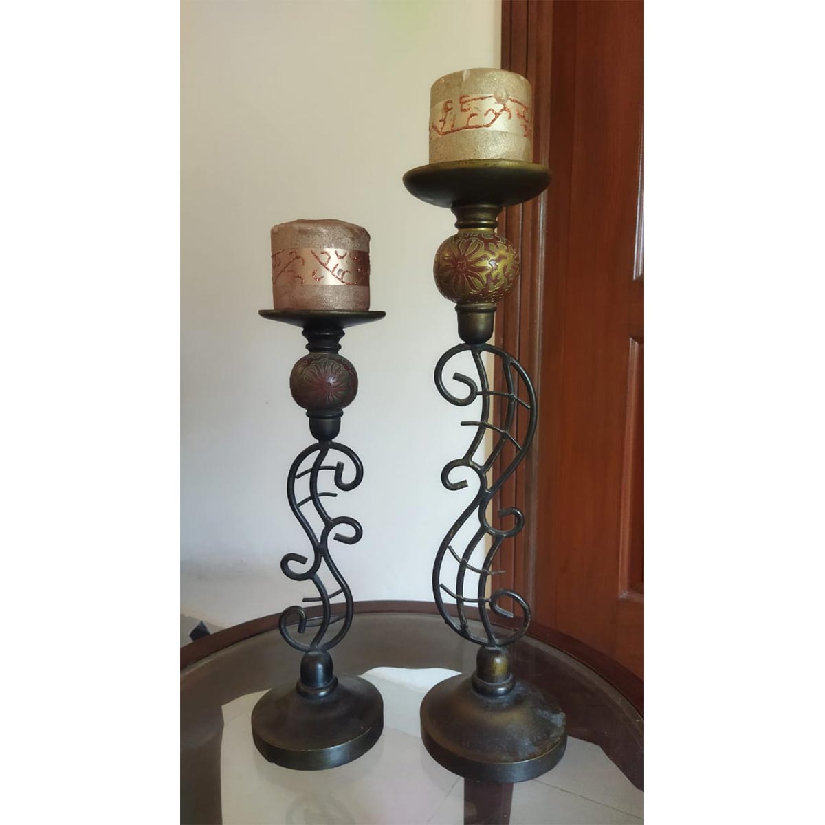 Pair of wrought iron and wooden candle stands in two different sizes.. Can be used for outdoor as well.
