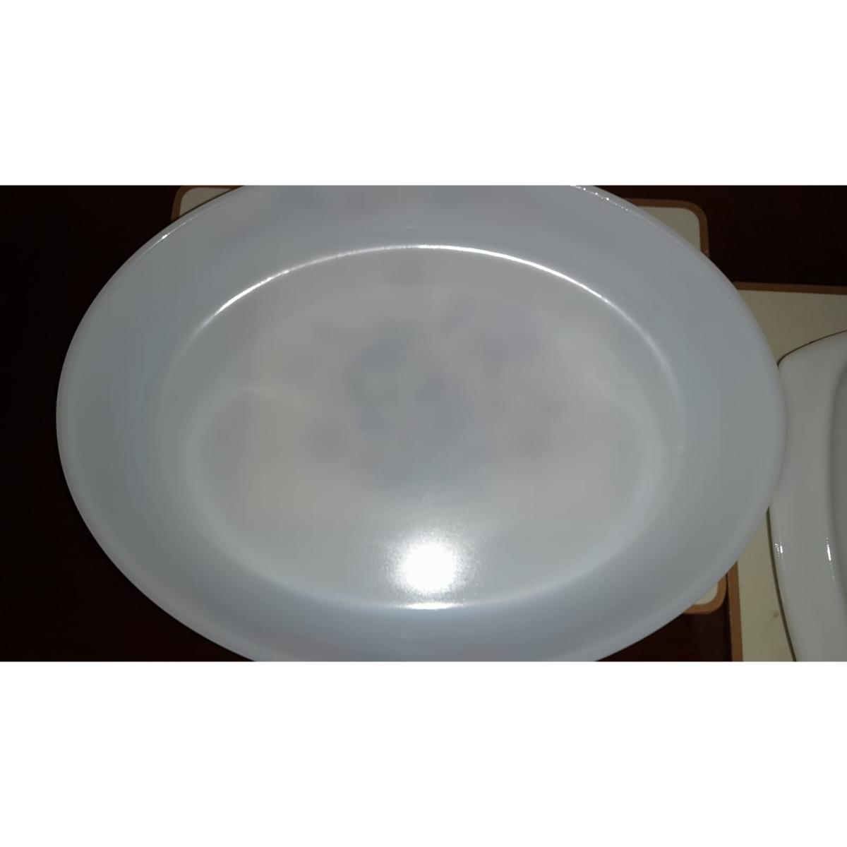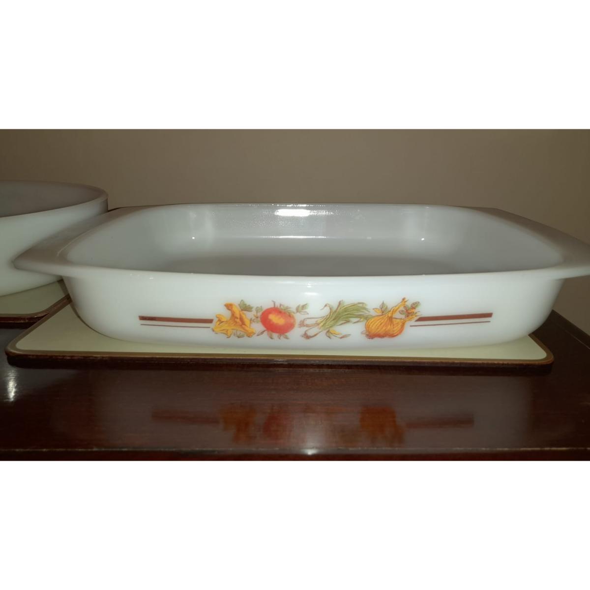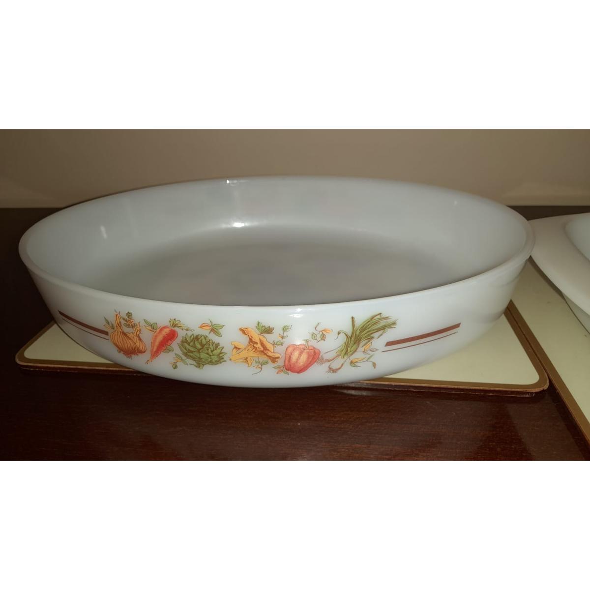 Authentic Pyrex made in England – a set of 2 durable serving dishes featuring matching vegetable-themed artwork. Includes one rectangular and one oval dish, ideal for family meals. Safe for both oven and microwave use.