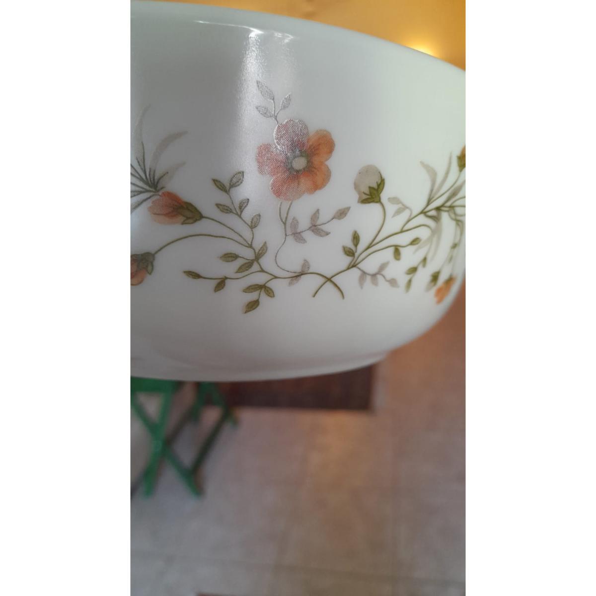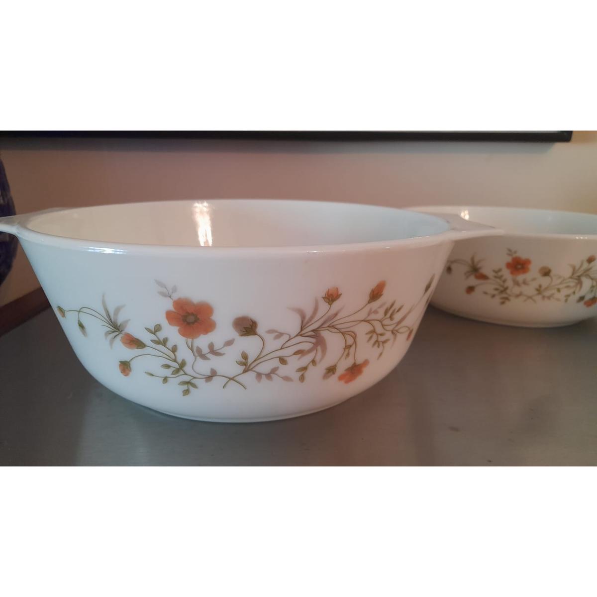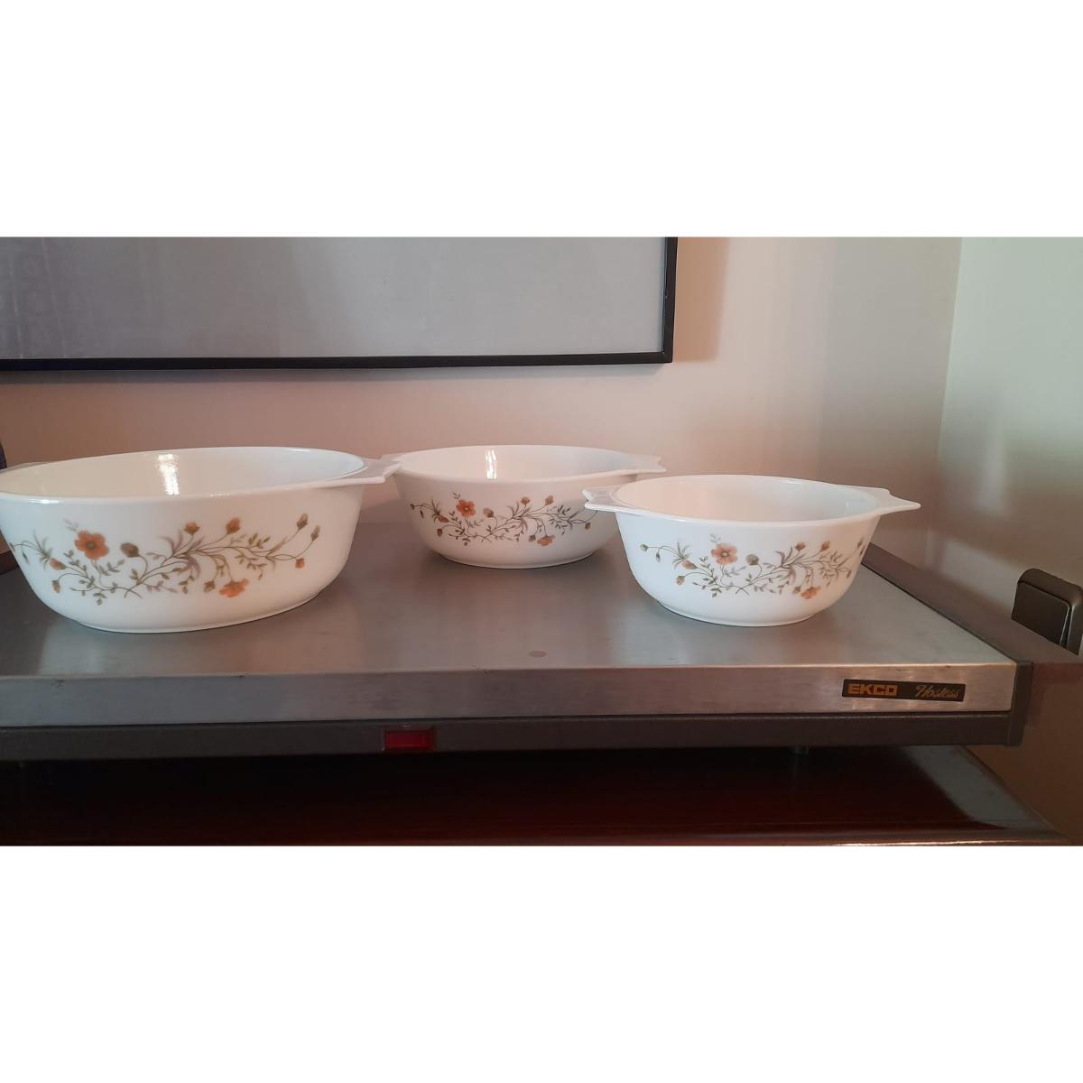 Elegant 3-piece Pyrex serving set made in England, featuring a classic floral vine design. Includes three round bowls of varying sizes with convenient side handles. Perfect for oven-to-table use — both microwave and oven safe. Ideal for formal dinners and everyday meals.