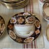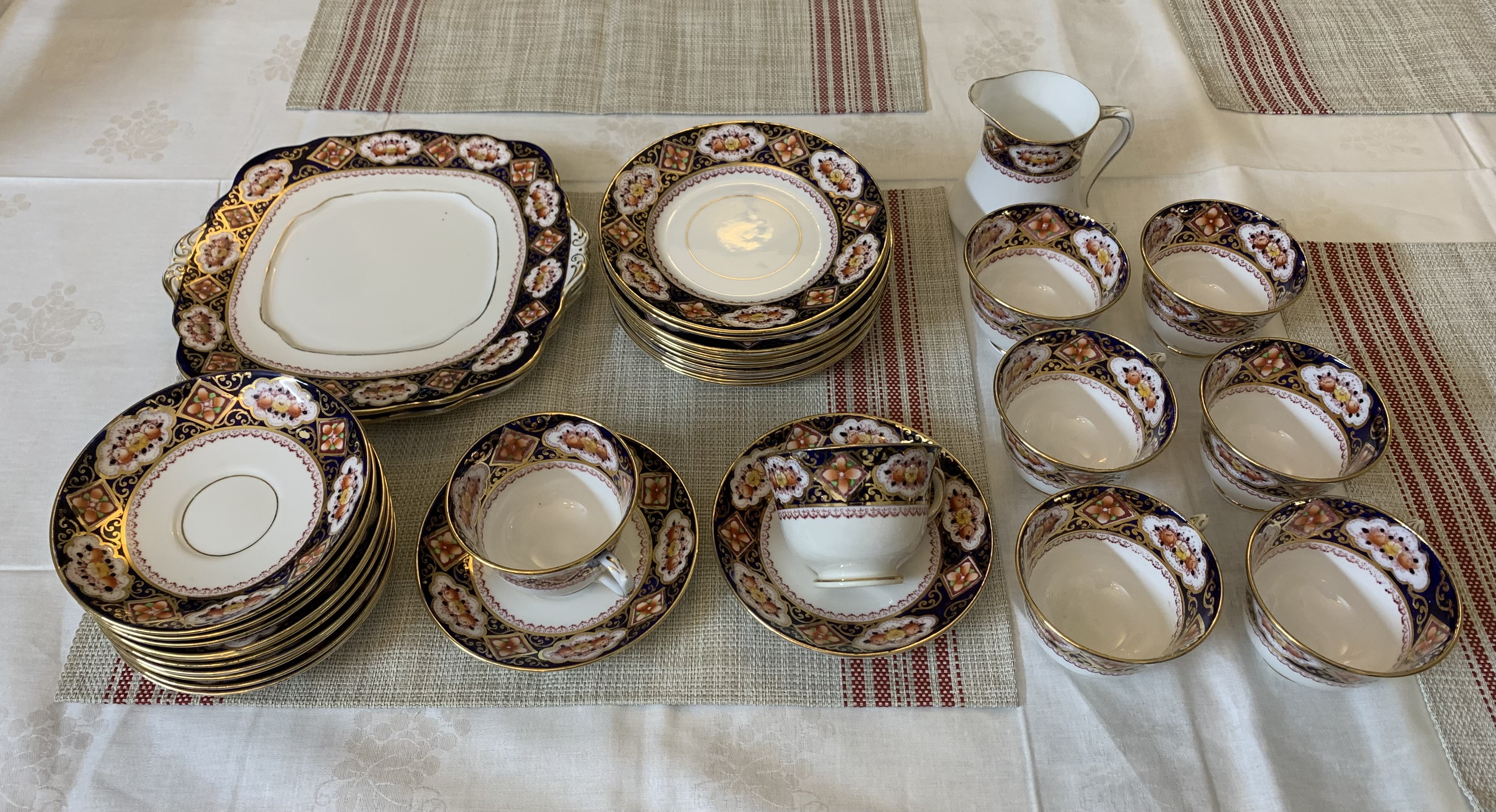 Rare antique Royal Albert Imari-style tea set for eight people from the 1920s, over a century old. Intricately decorated with cobalt blue and rust-colored flowers and heavy 22-karat gold gilding. Ideal for Royal Albert enthusiasts and collectors. There are a total of 35 pieces: 8 teacups, 12 saucers, 12 dessert plates, 2 cake plates, and a milk pot.