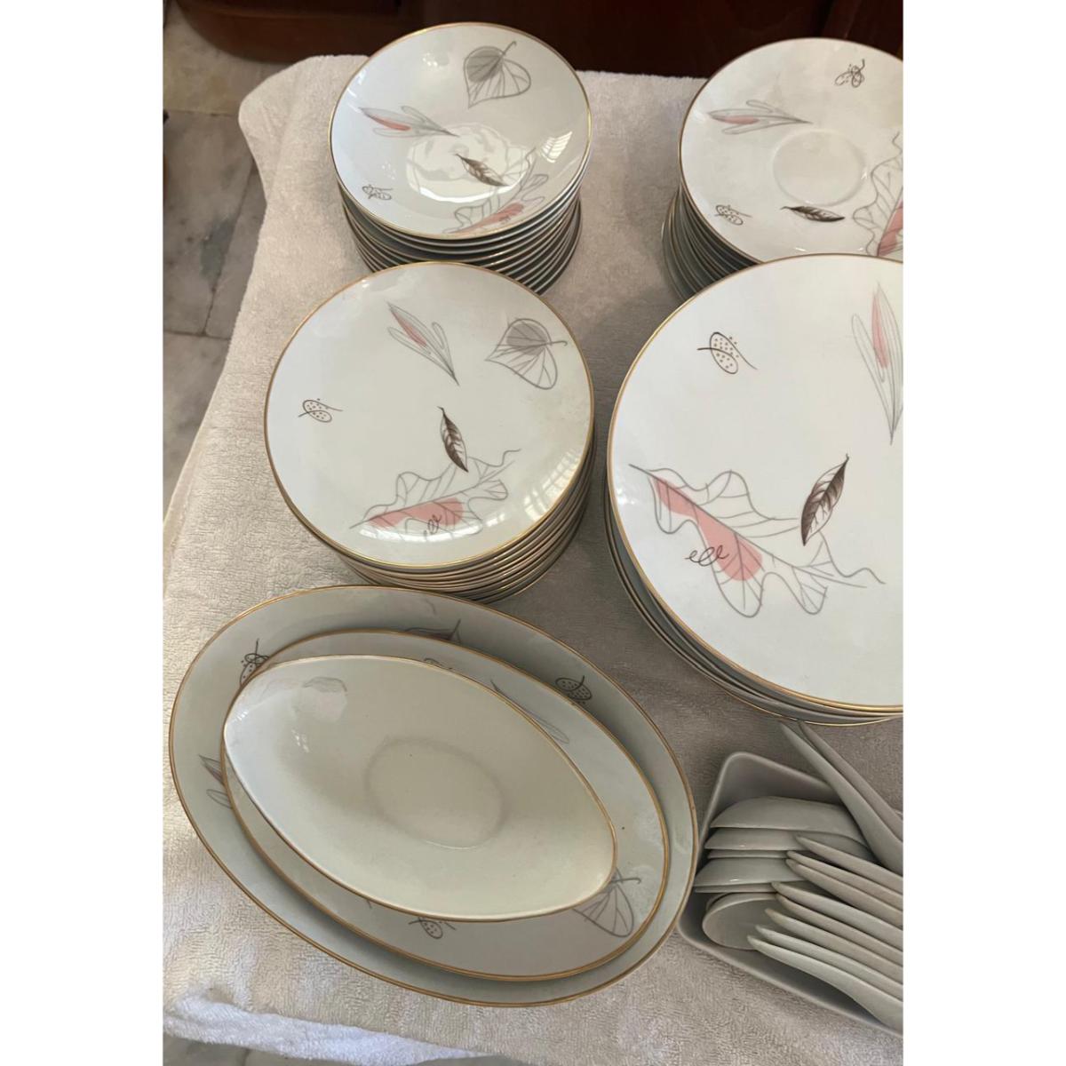 Crafted from fine porcelain, this set’s elegant design features soft, intricate floral patterns with a gold trim, giving it a refined and timeless appeal.
