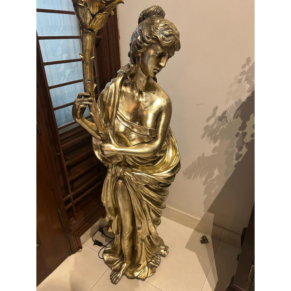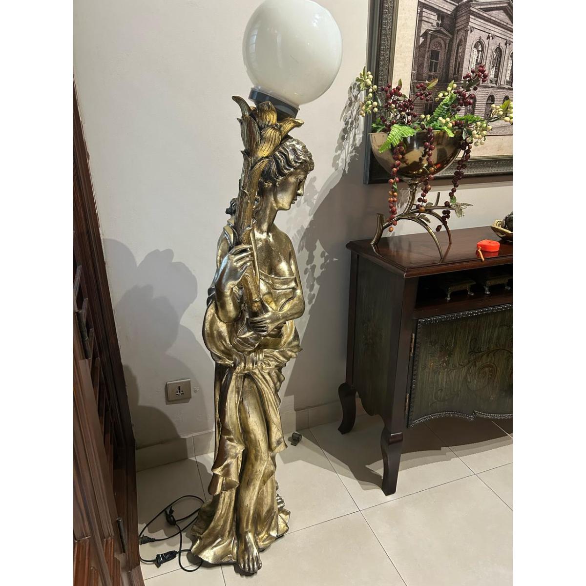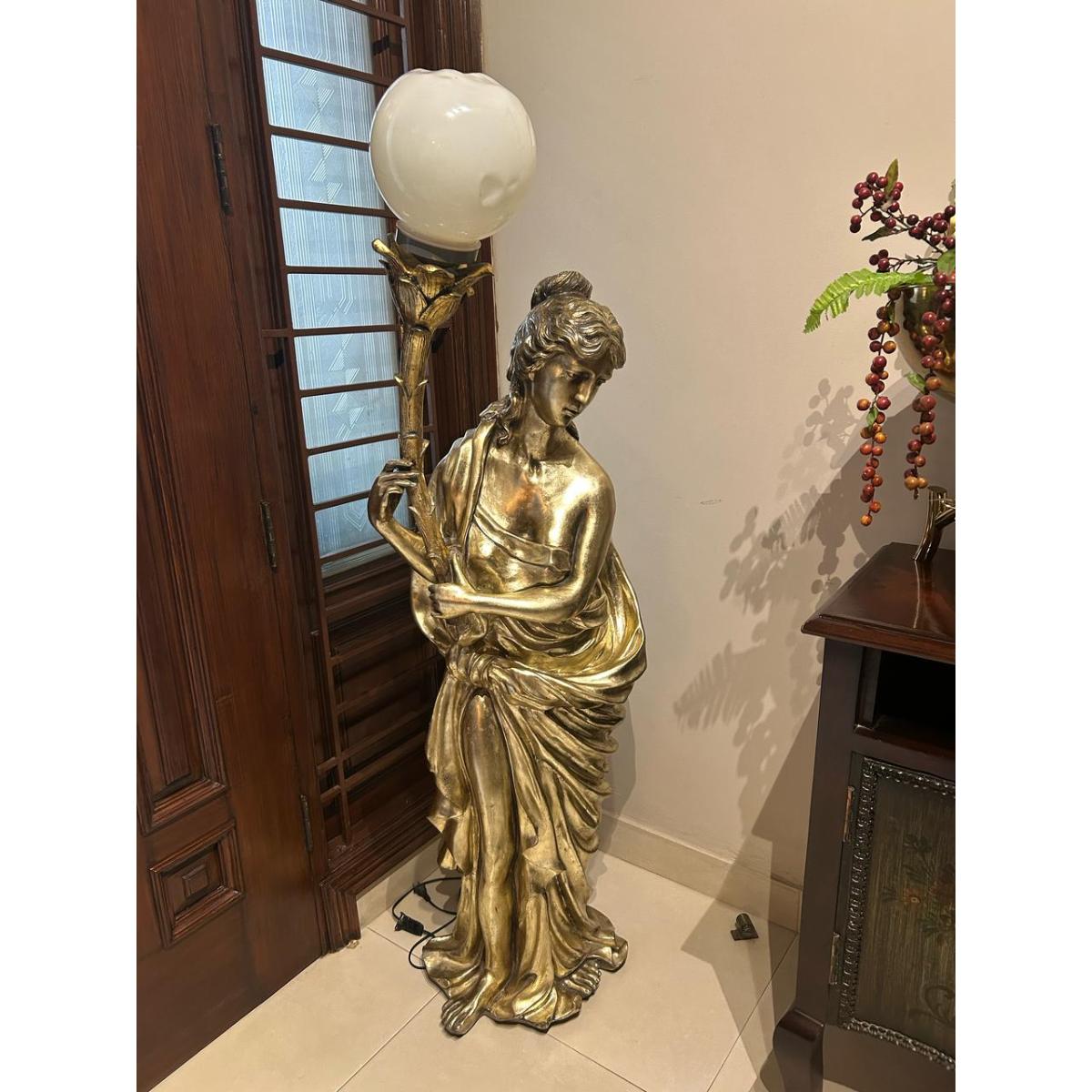 Add a touch of classical grandeur to your space with this Roman lady floor lamp. Expertly sculpted, this statement piece features a regal female figure in flowing drapery, holding a torch-style lamp with a frosted globe light.
