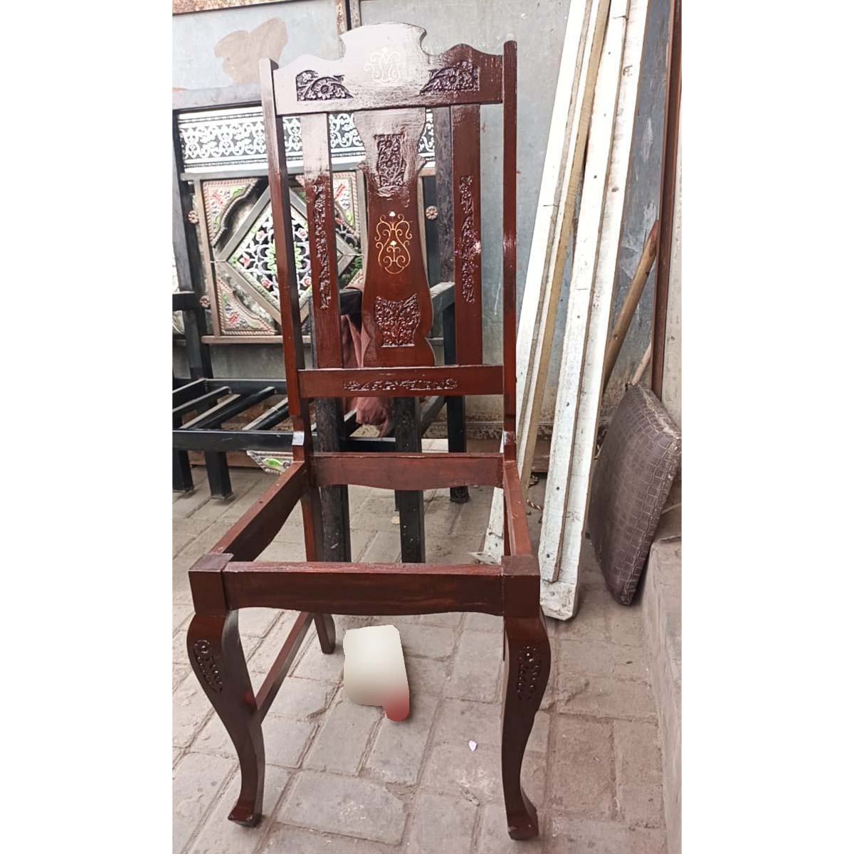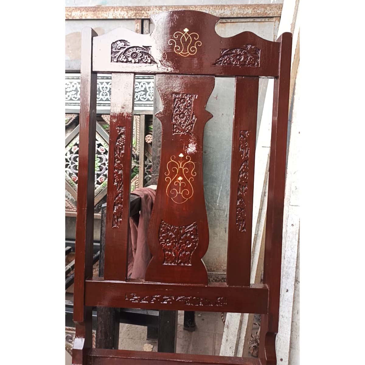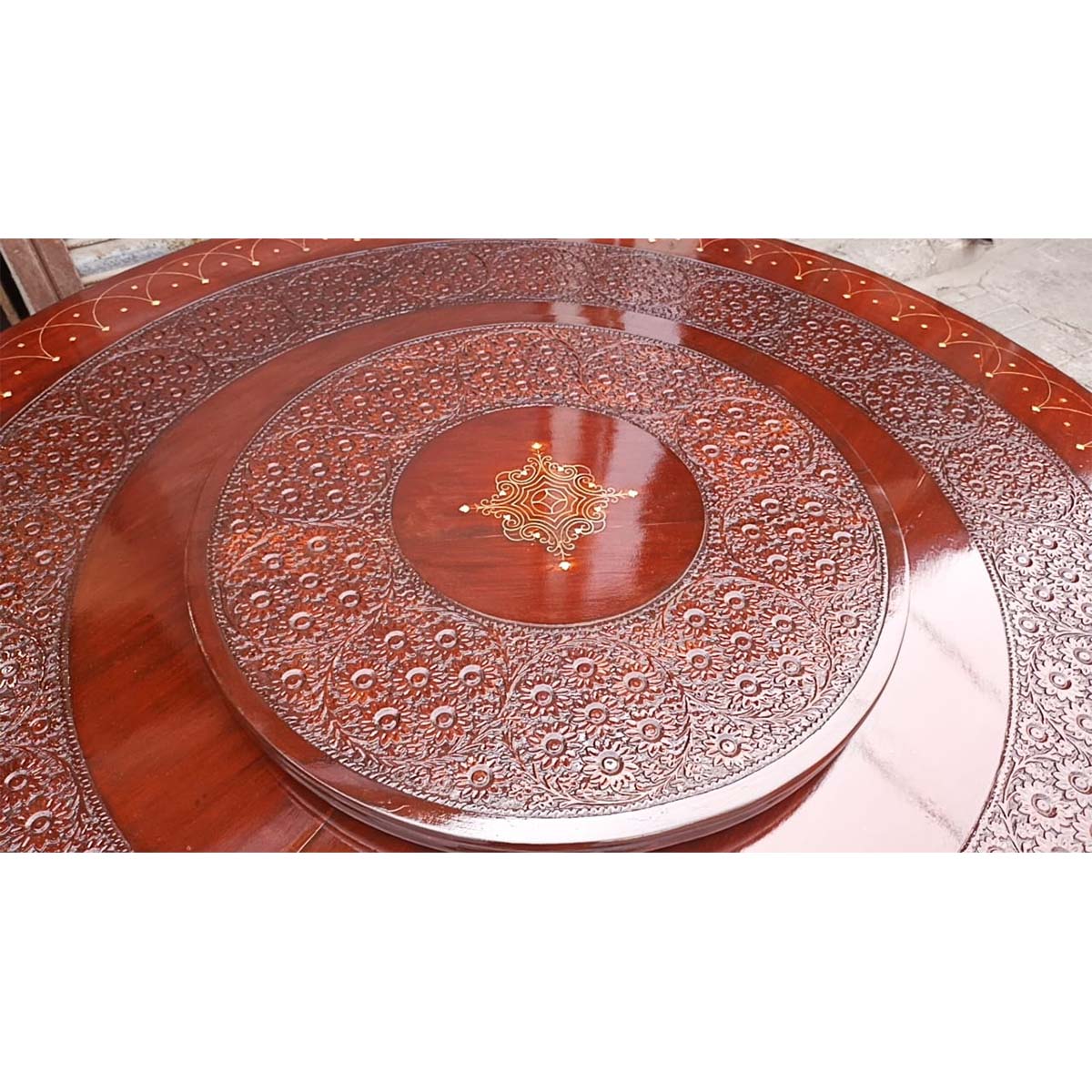 Sheesham wood round dining table in traditional design with rotating top. Hand crafted with carving and brass inlay work, comes with 6 chairs.