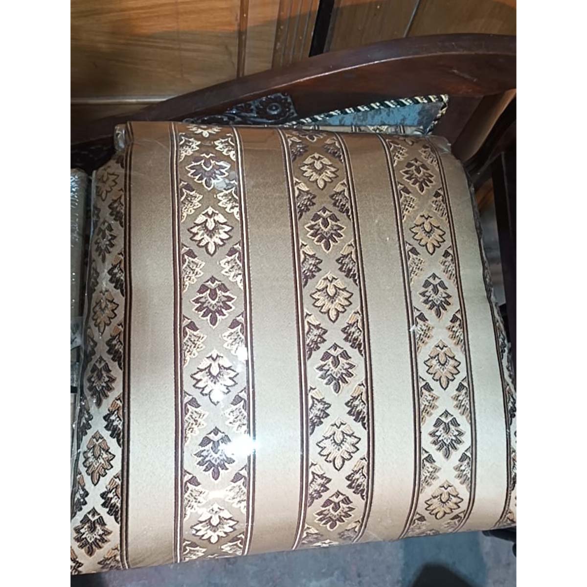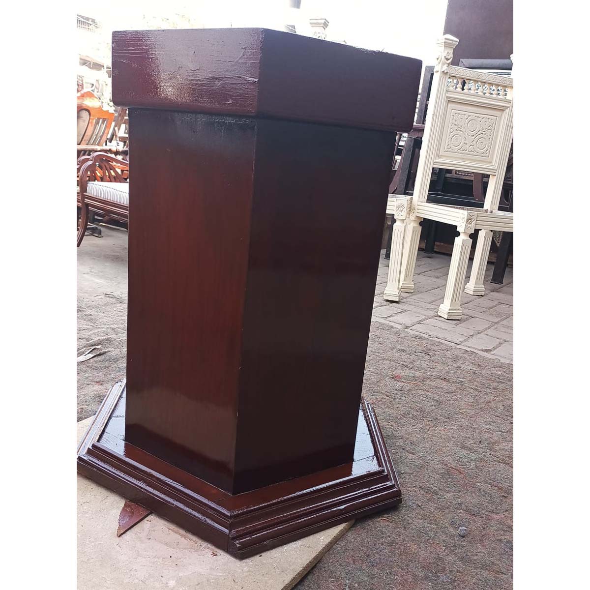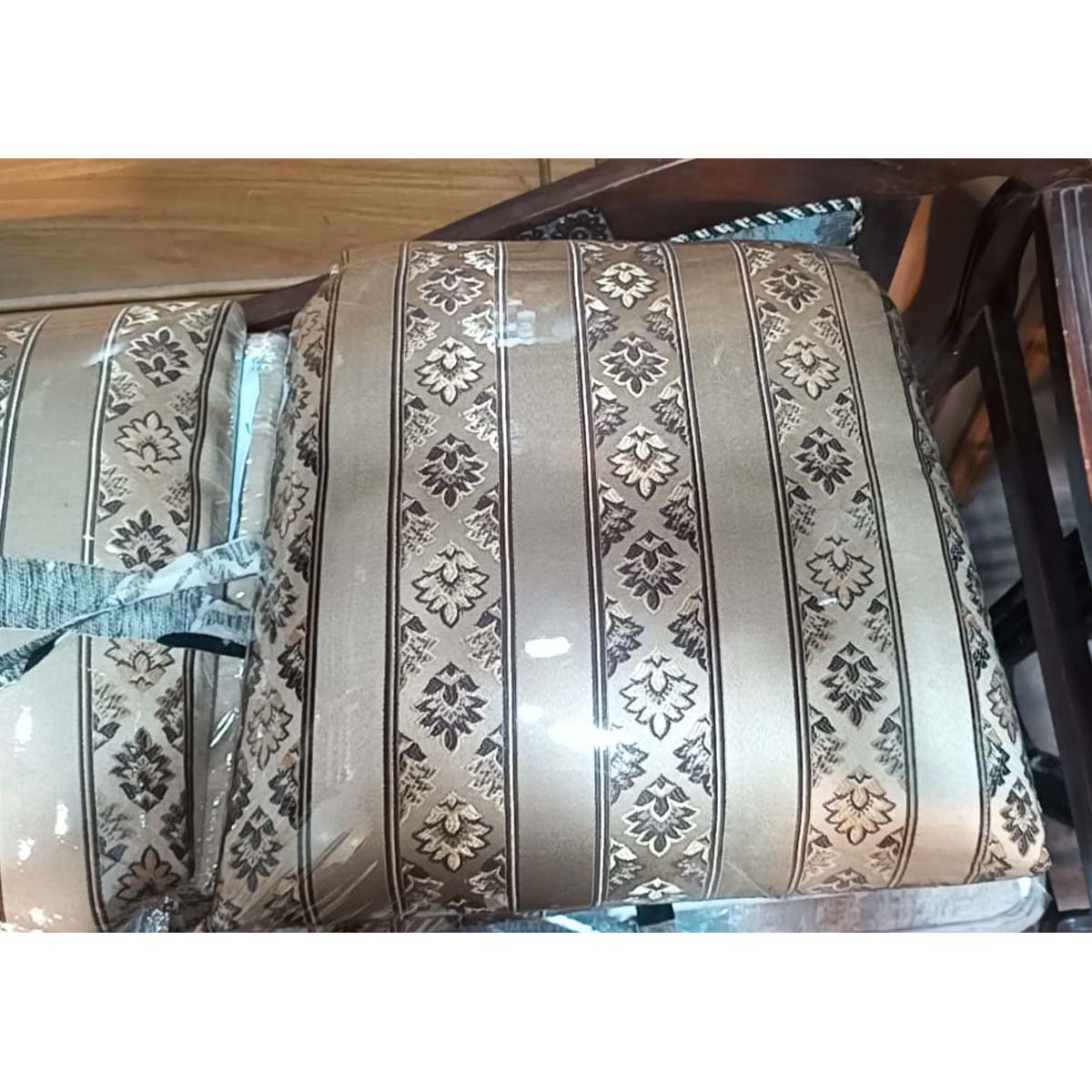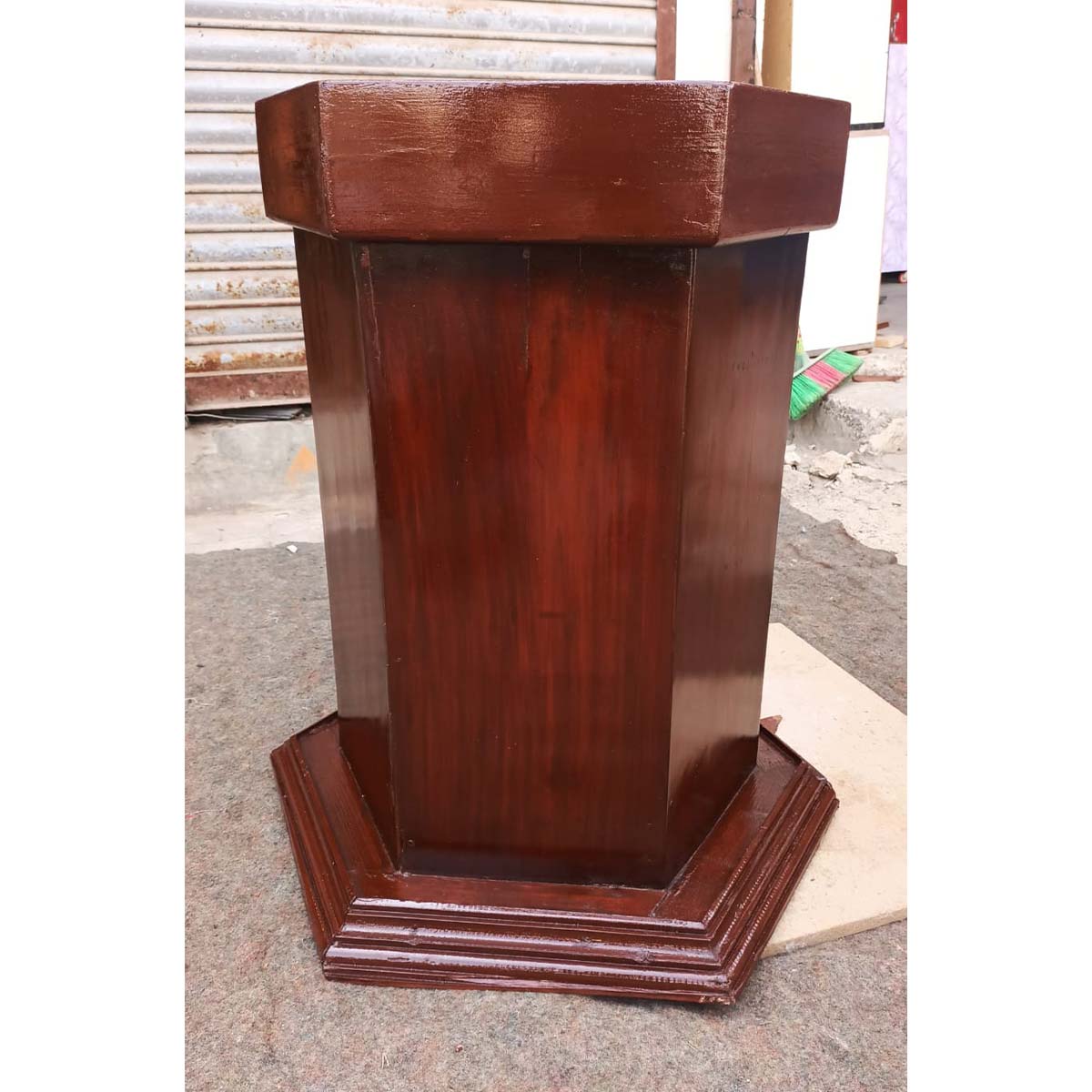 Sheesham wood round dining table in traditional design with rotating top. Hand crafted with carving and brass inlay work, comes with 6 chairs.