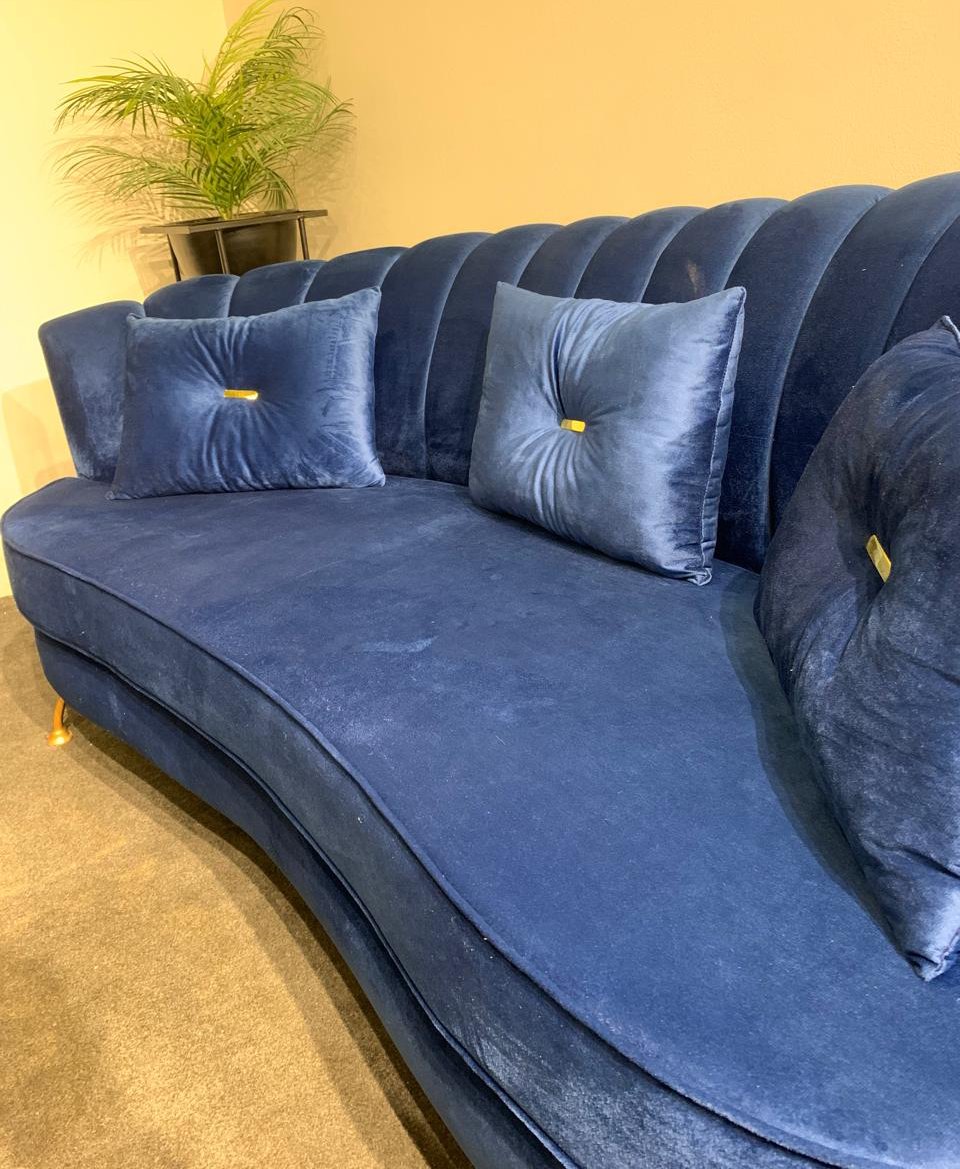 Plush 3 seater sofa upholstered in rich royal blue velvet fabric. This modern design sofa rests on gold deco metal legs with a neatly tufted back and 3 throw cushions.