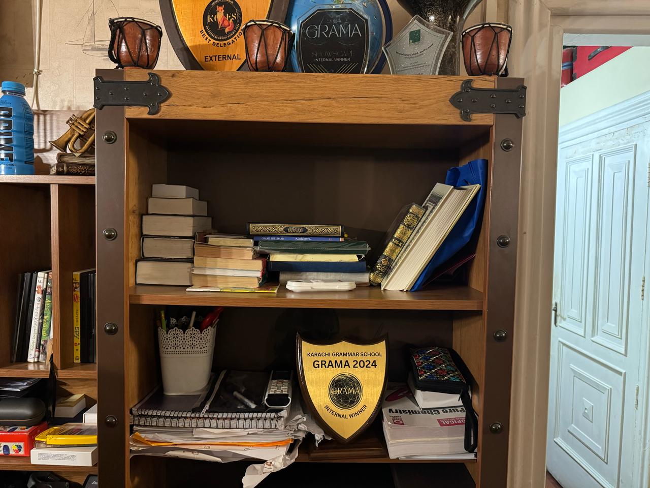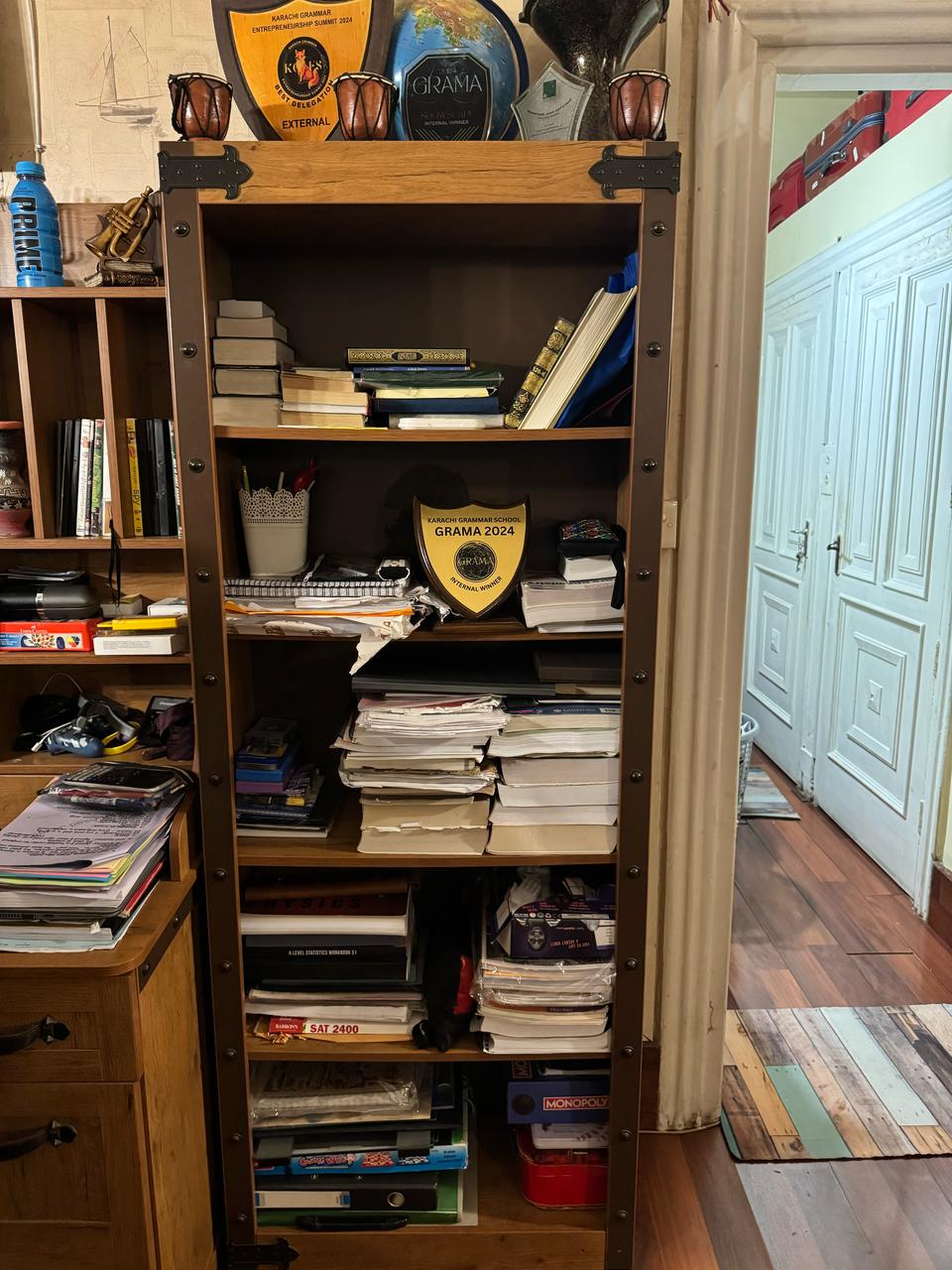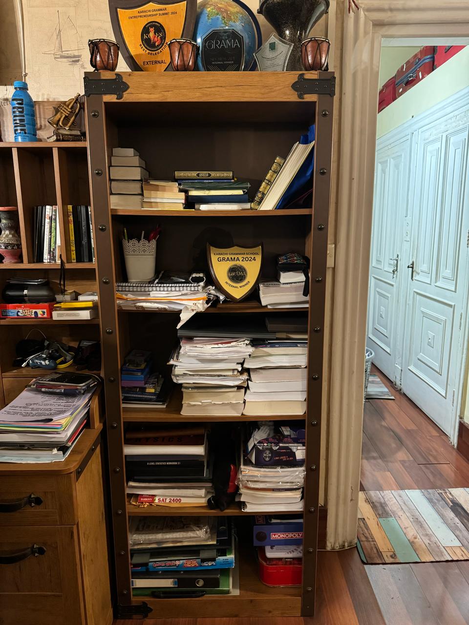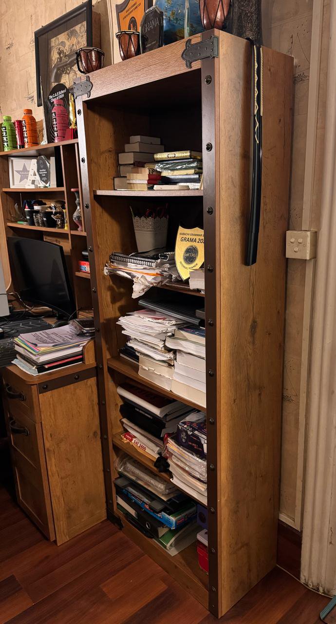 Imported bookshelf features a unique blend of rustic and industrial styles, with its medium-dark wooden construction and prominent metal corner brackets and straps.