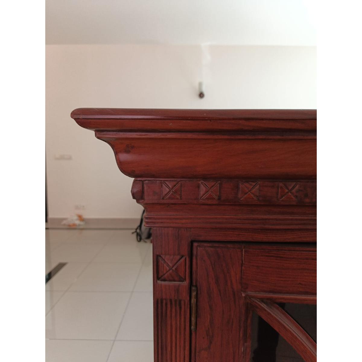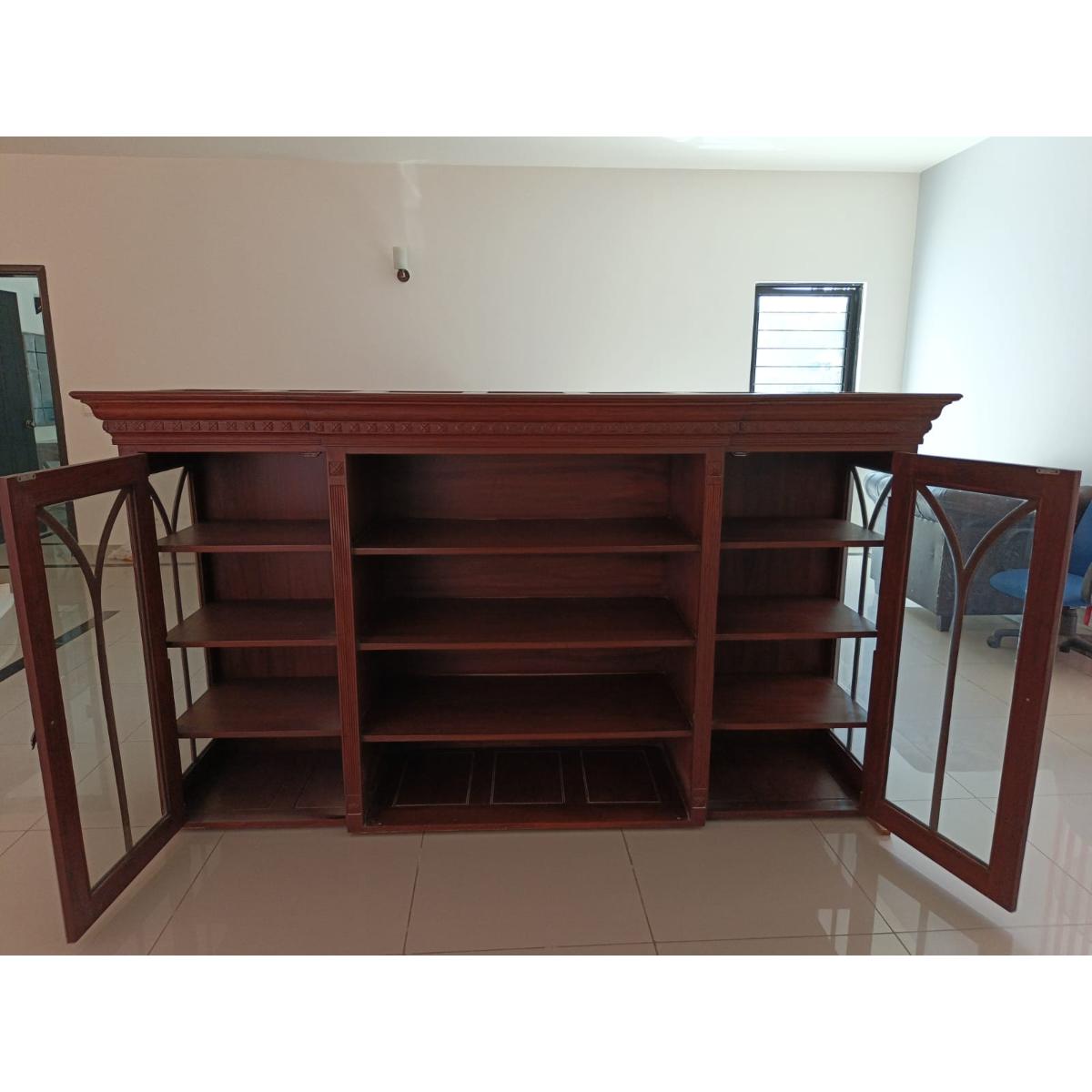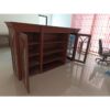 Elegant solid sheesham wood cabinet with central open shelves and two side glass-door display sections. Ideal as a TV console, bookcase, or decorative display unit for living rooms and offices.