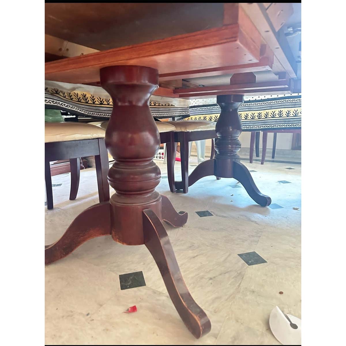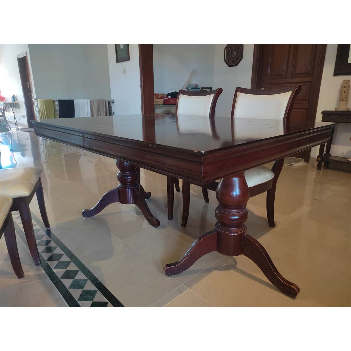 A beautifully crafted extendable dining table in a rich mahogany finish, perfect for family meals or formal gatherings. With its detailed pedestal legs and sturdy build, this table combines elegance with practicality. Easily extendable to accommodate more guests as needed. Seats 6 people.