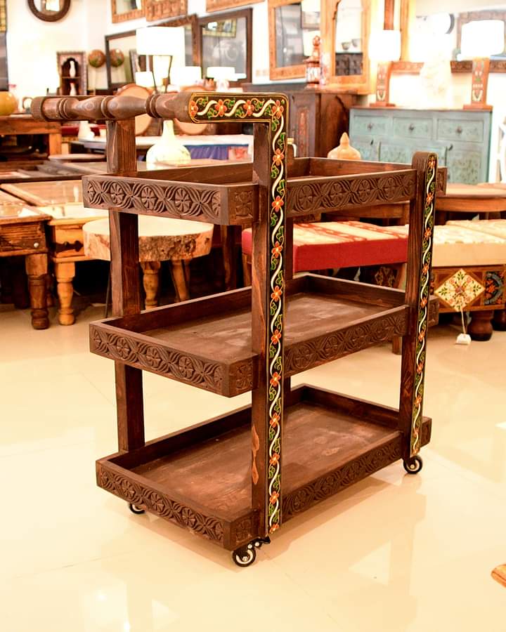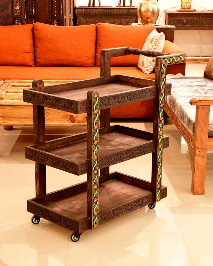 Experience the charm of a traditional Swati carved tea trolley crafted from premium pine wood and backed by a lifetime guarantee on the wood. This exquisite piece reflects the artistry of Royal handicraft e, blending heritage craftsmanship with lasting durability.