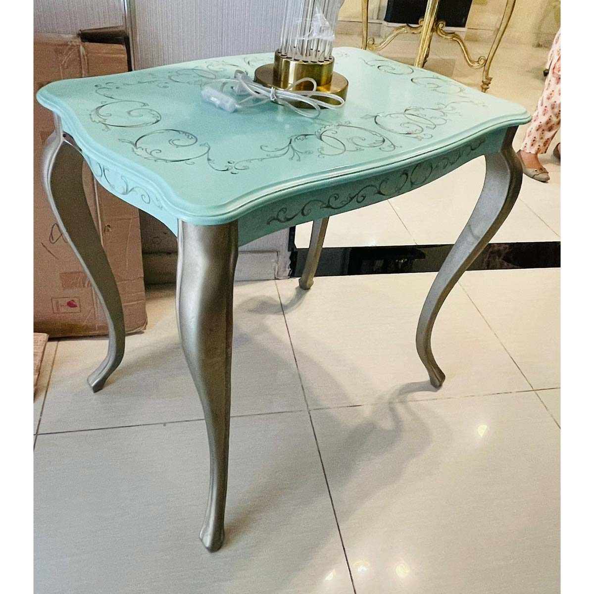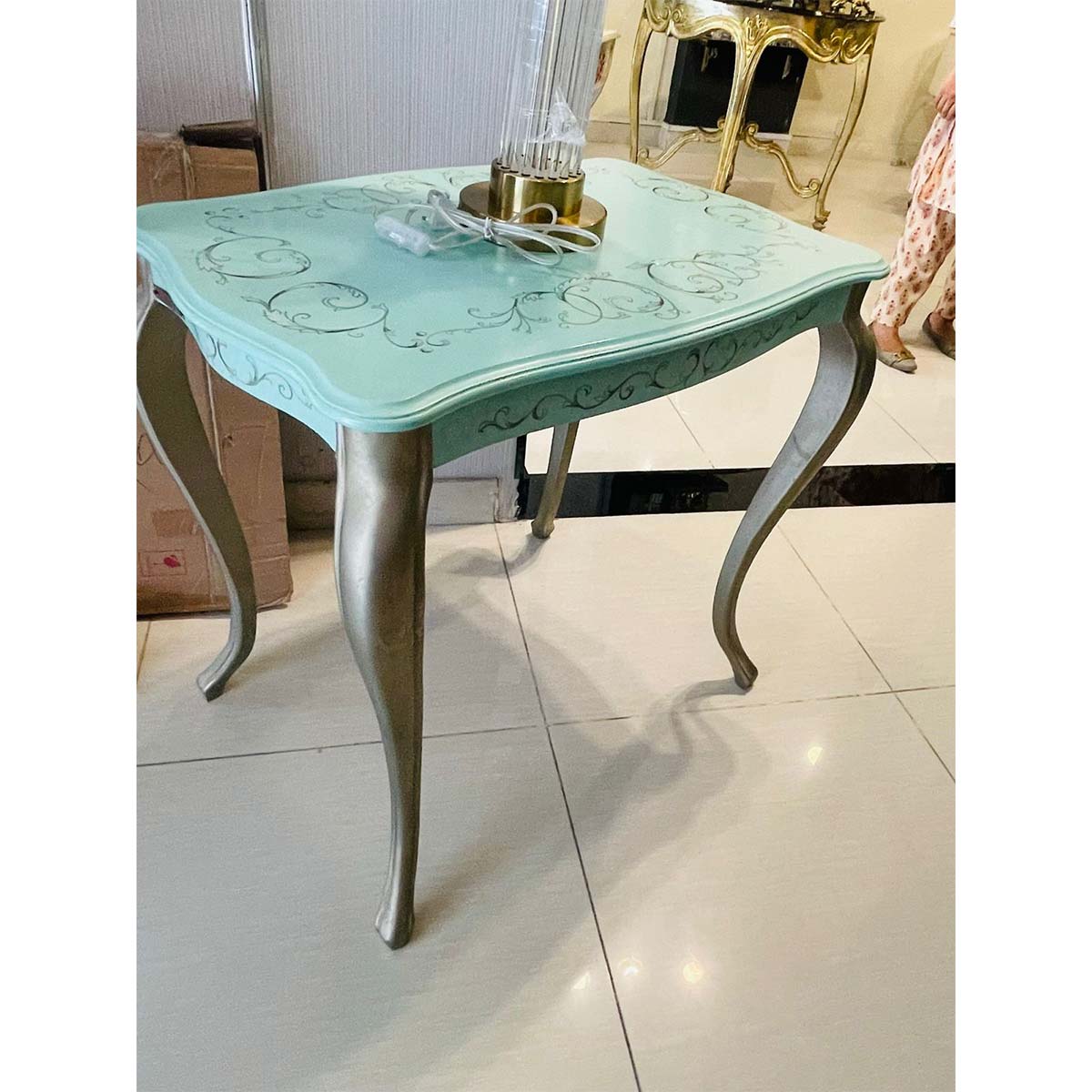 Single side table in Tiffany Blue with hand painted design on table top. Legs are painted in antique dull gold. This gorgeous designer piece will add pop of color to a drawing room.