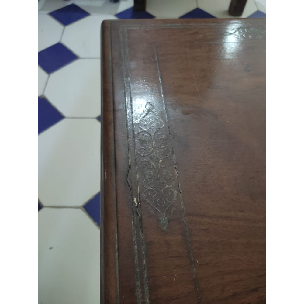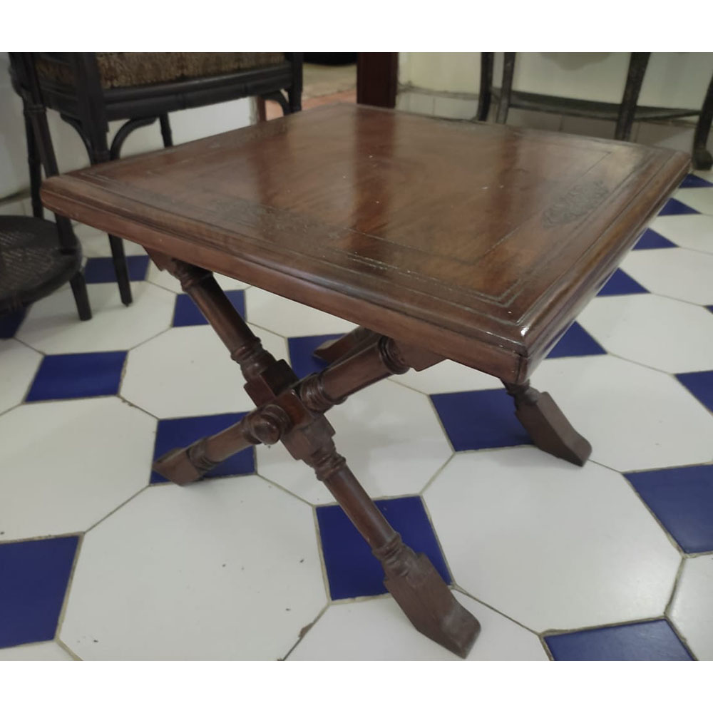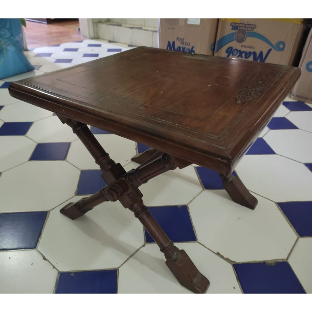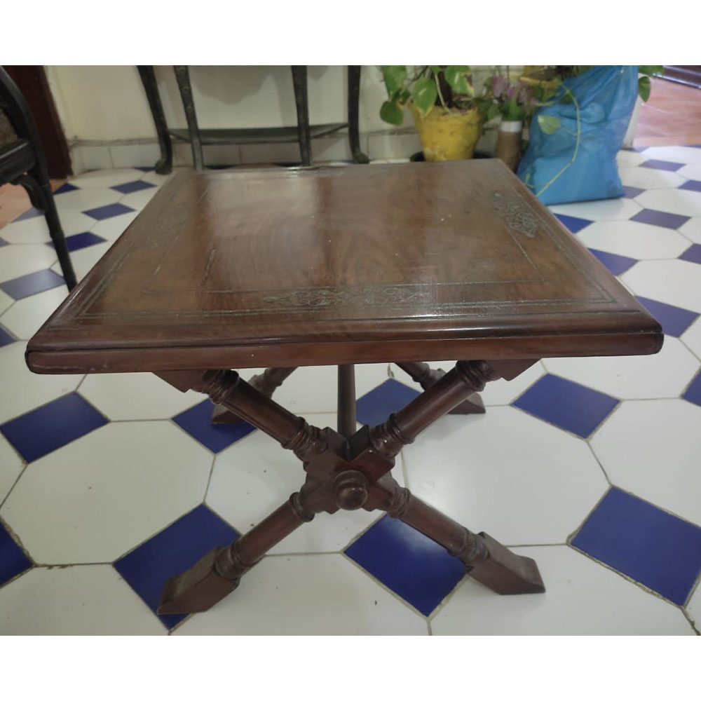 Solid Sheesham end table with cross legs in a traditional design and brass inlay on table top.