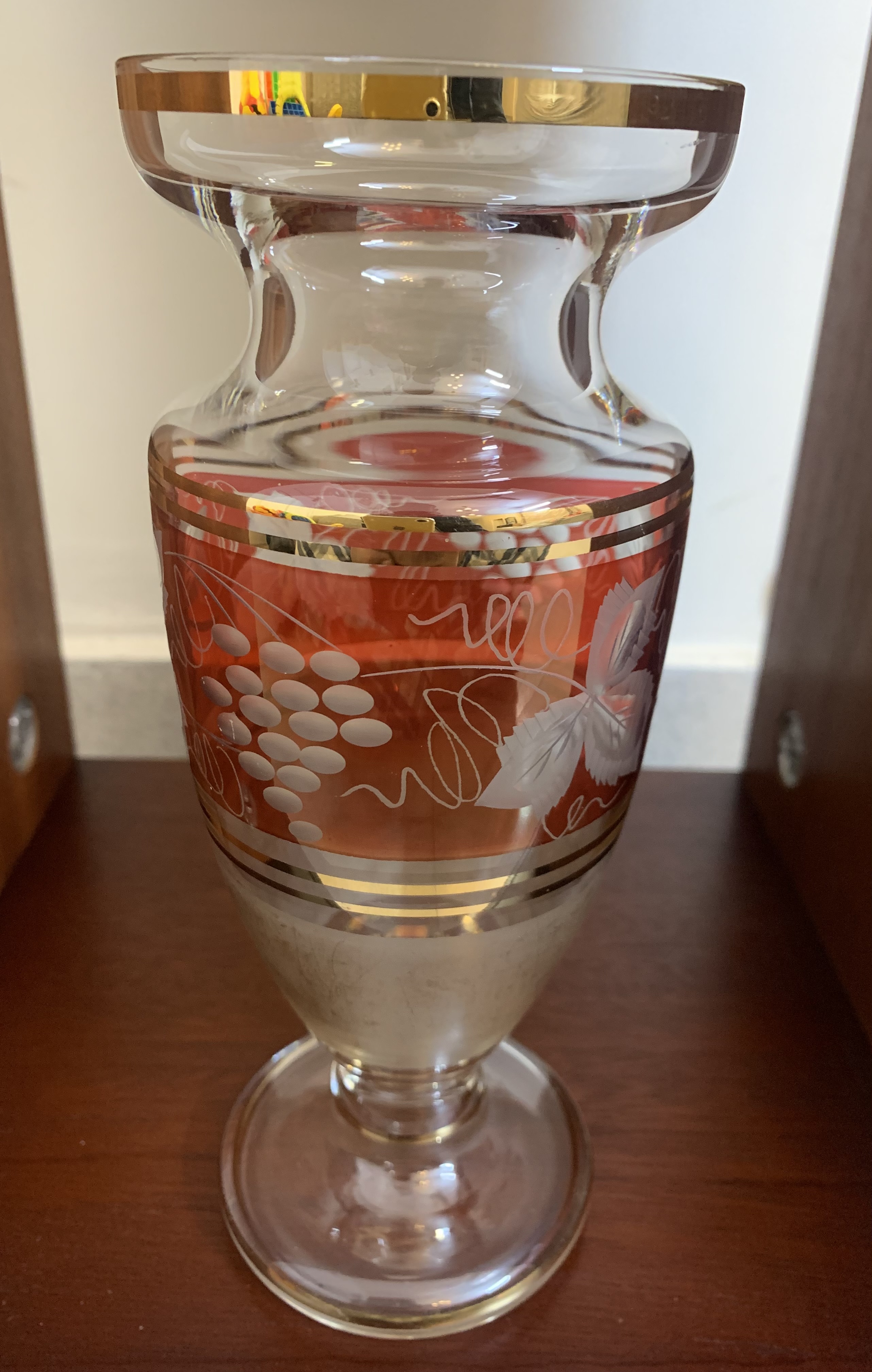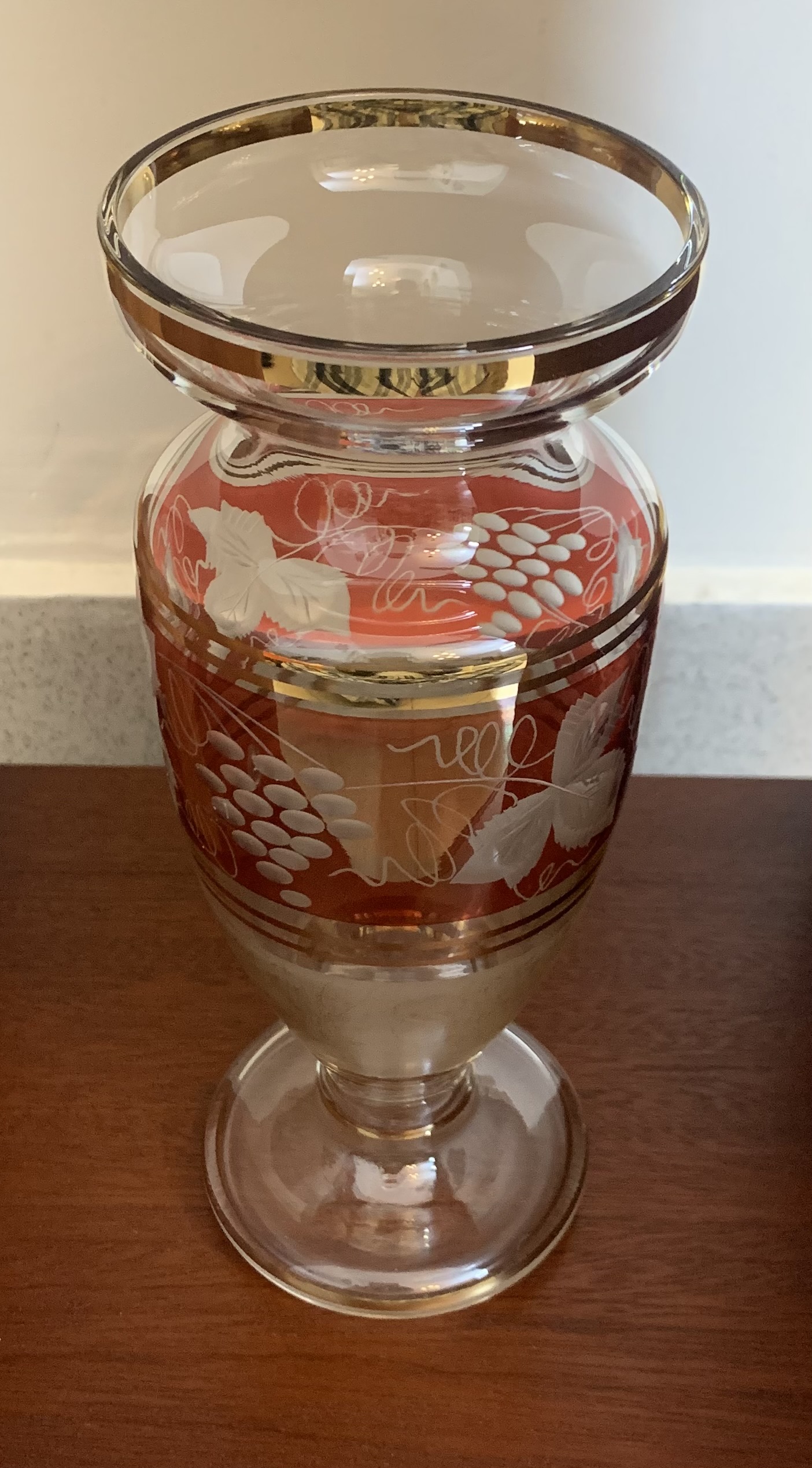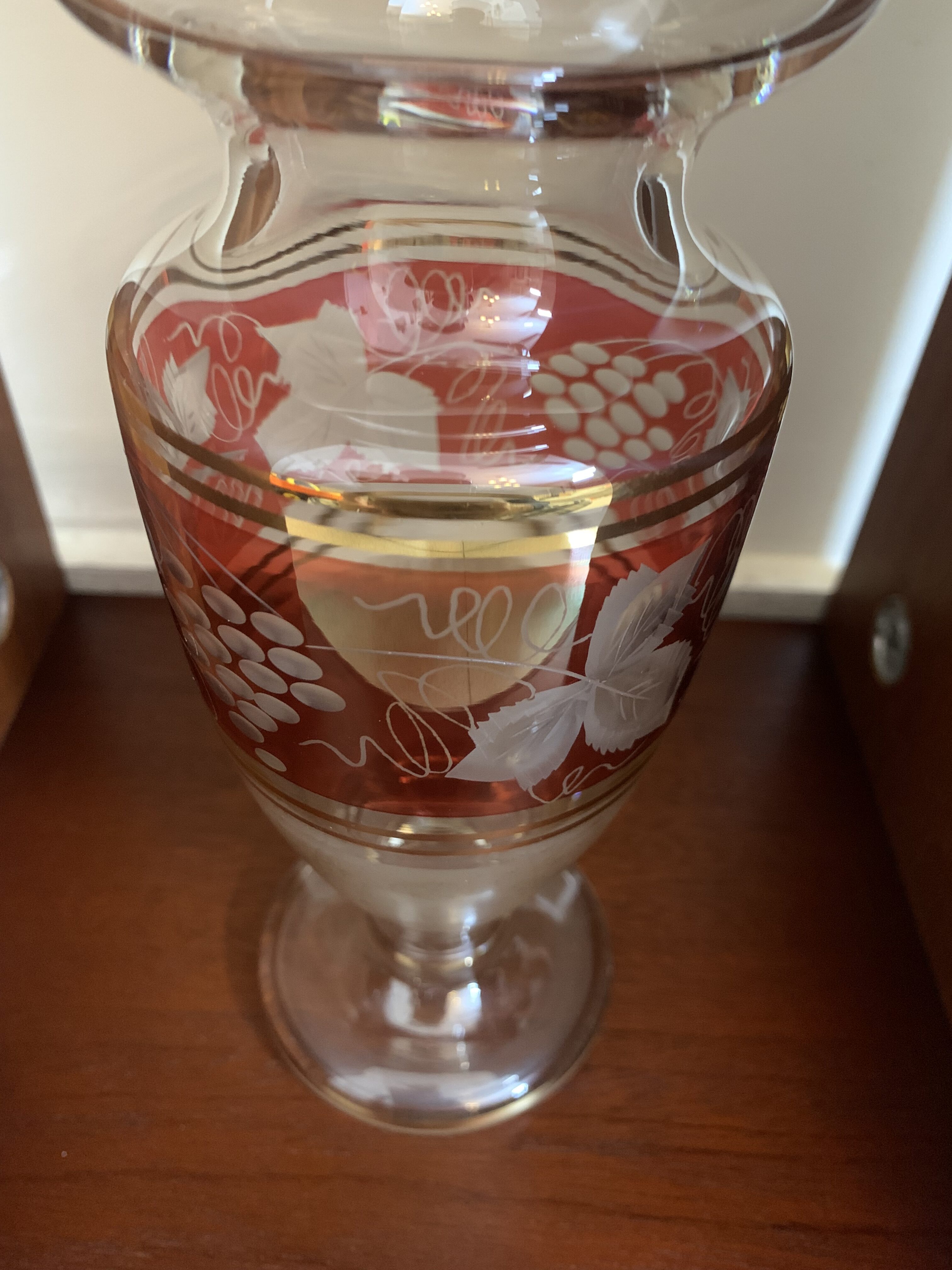 This lovely Bohemian Cranberry Cut to Clear Glass vase from the 1950s features etchings of grapes and leaves and is decorated in red and gold. Czech Republic-made.