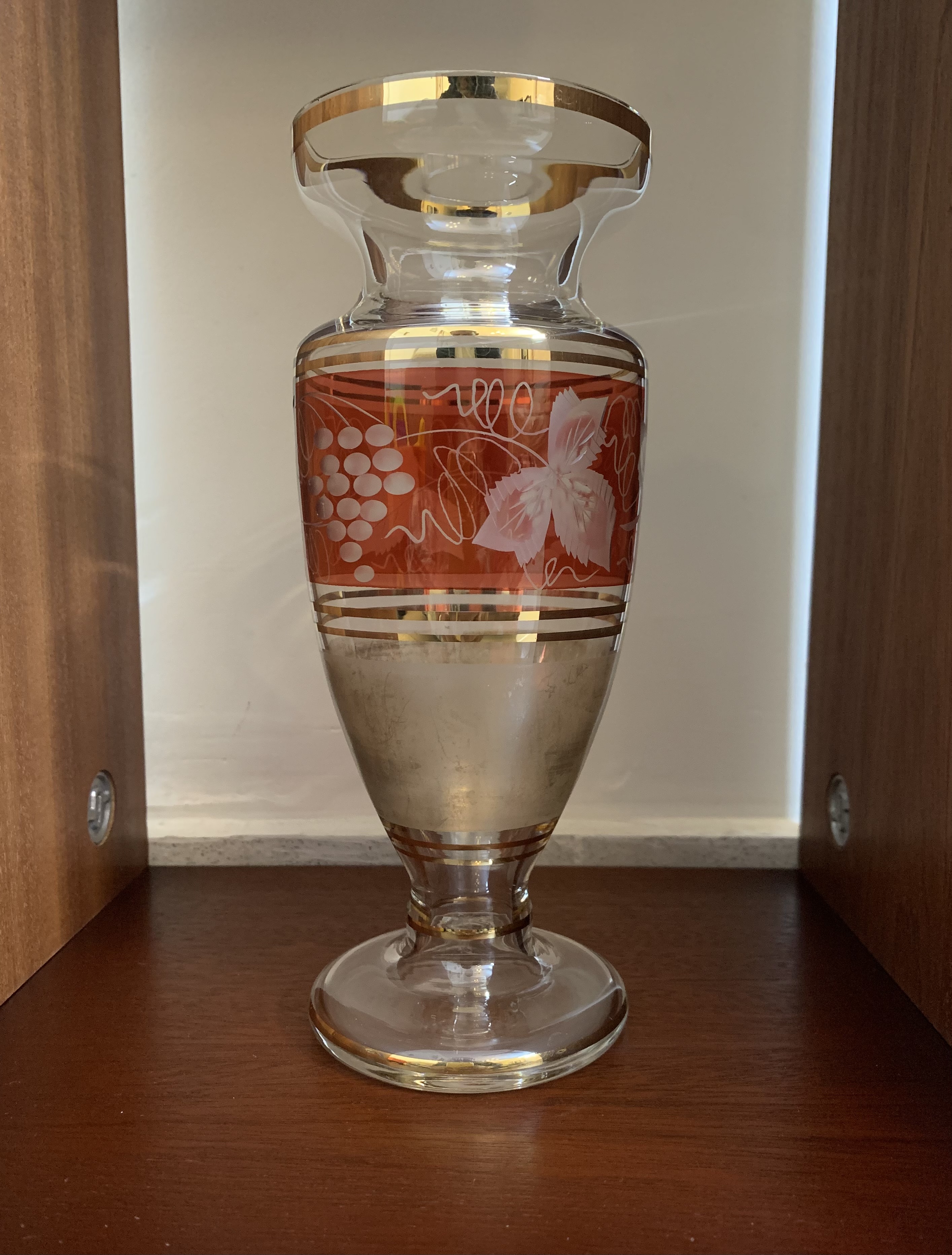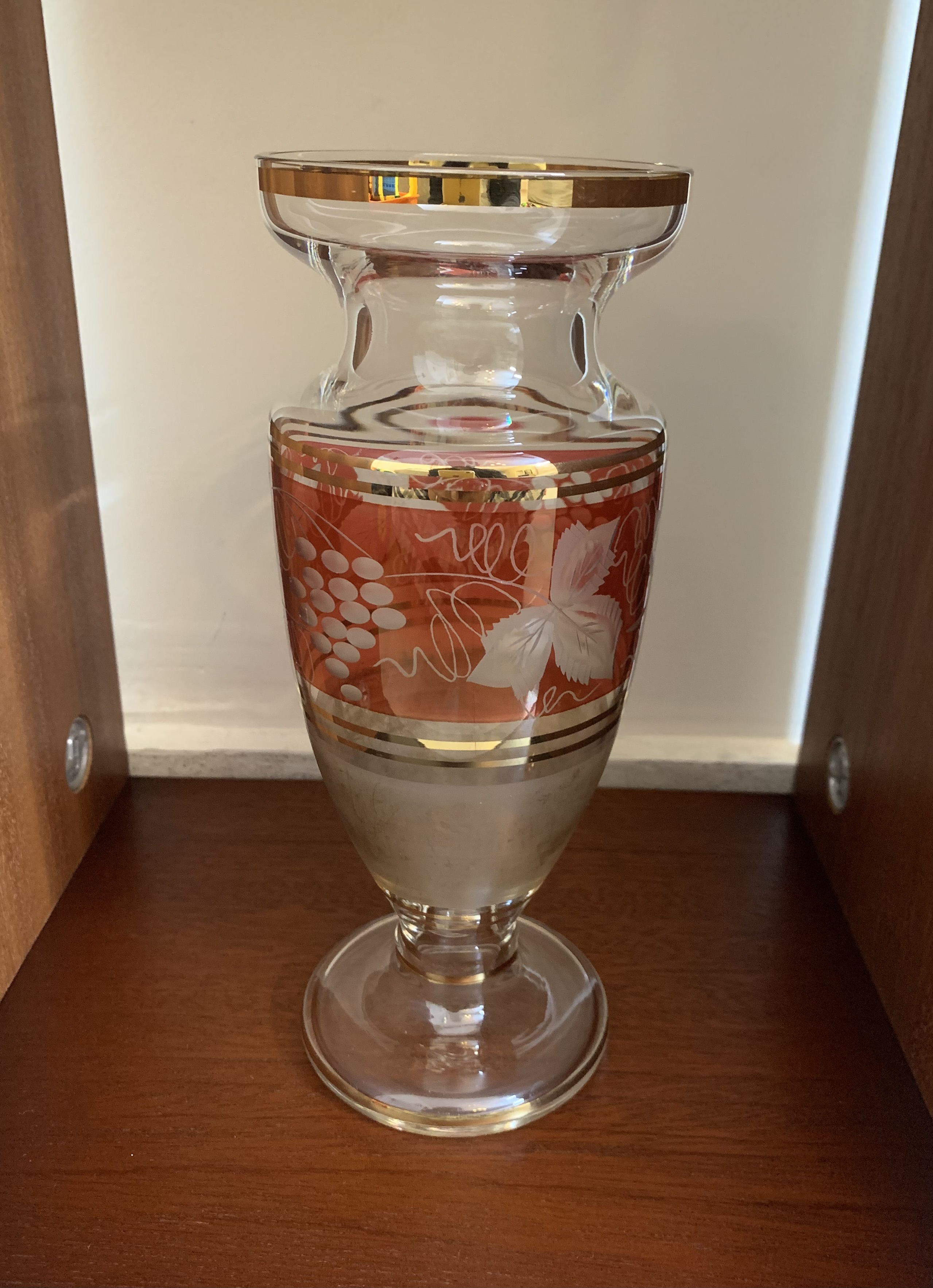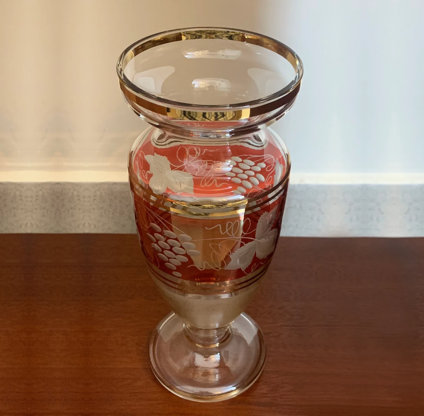 This lovely Bohemian Cranberry Cut to Clear Glass vase from the 1950s features etchings of grapes and leaves and is decorated in red and gold. Czech Republic-made.