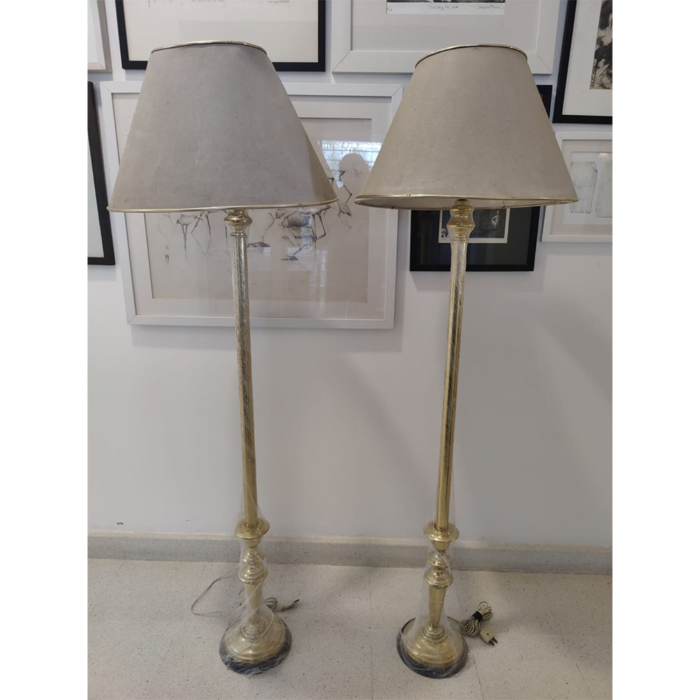 Vintage brass floor lamp, weighing over 15kg each. Freshly polished and lacquered with original shades.