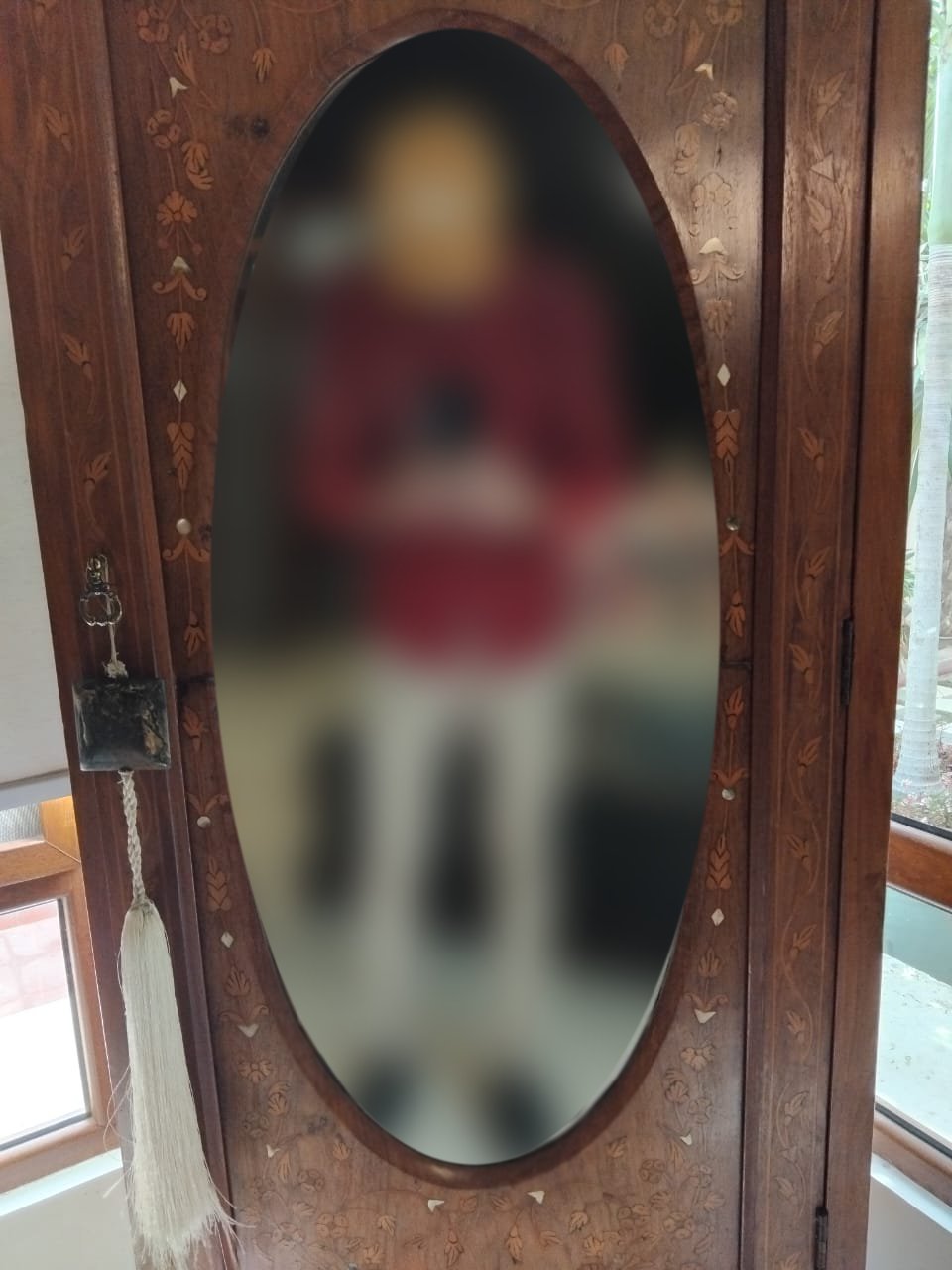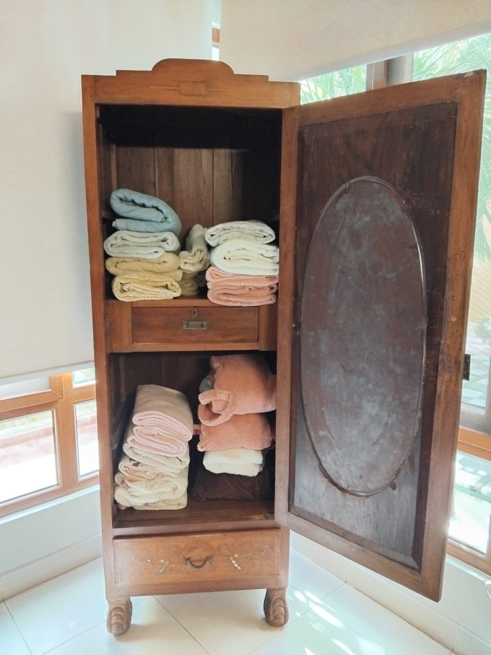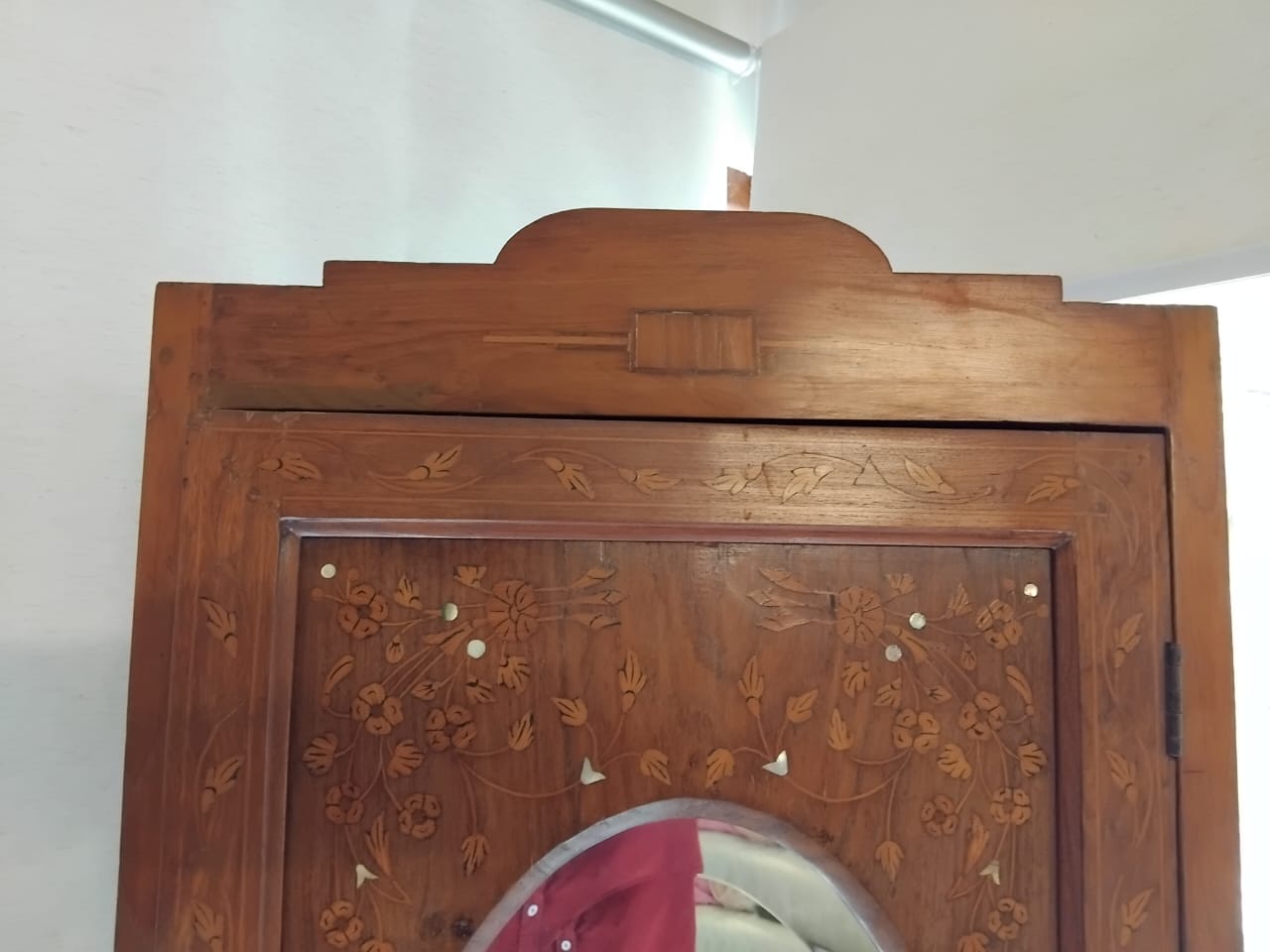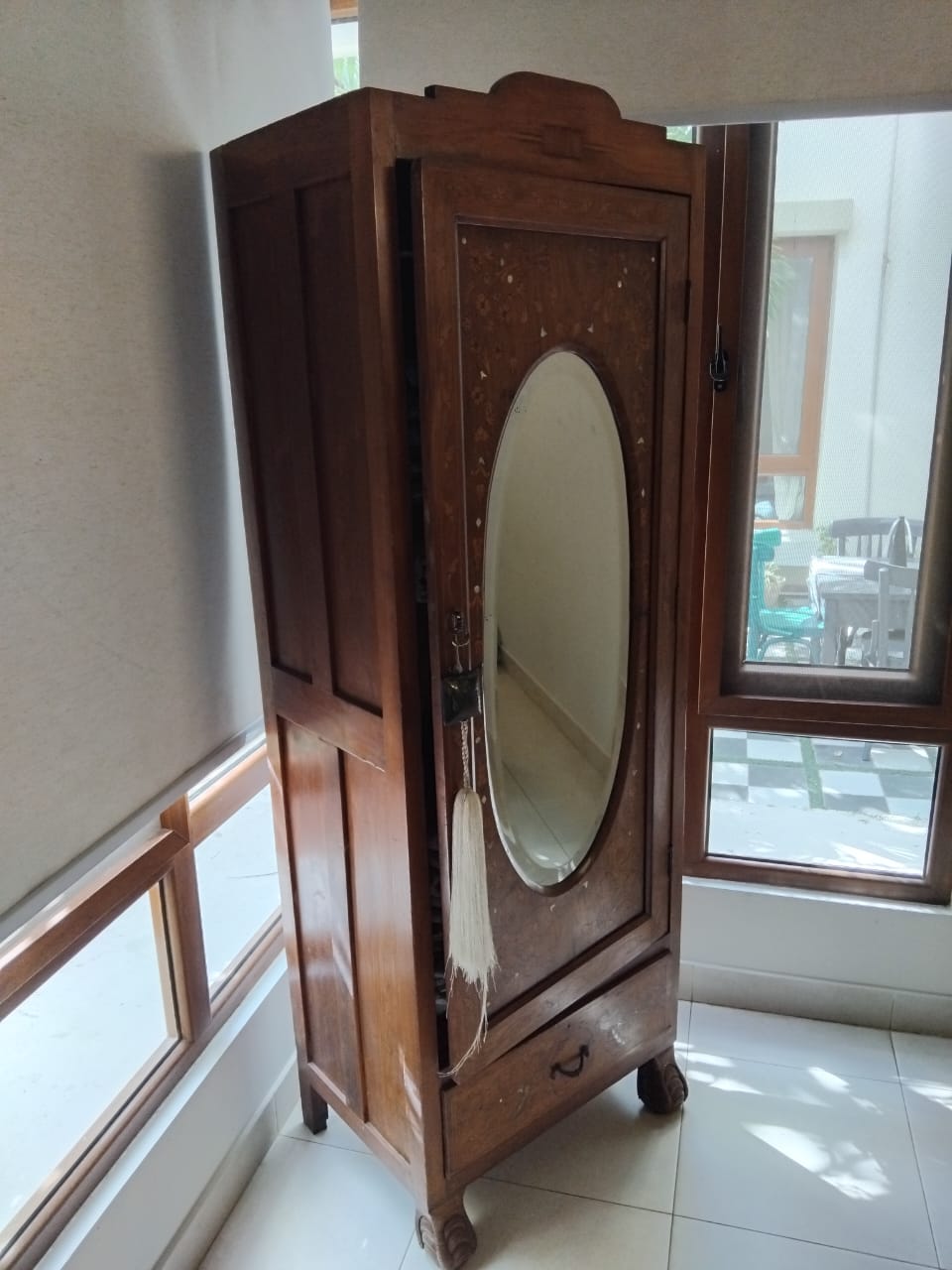 Add a touch of timeless charm to your bedroom with this lovely vintage Burma Teak wardrobe. Featuring a distinctive oval mirror inset on the door, accented by inlay decorative details, and a convenient bottom drawer for extra storage.