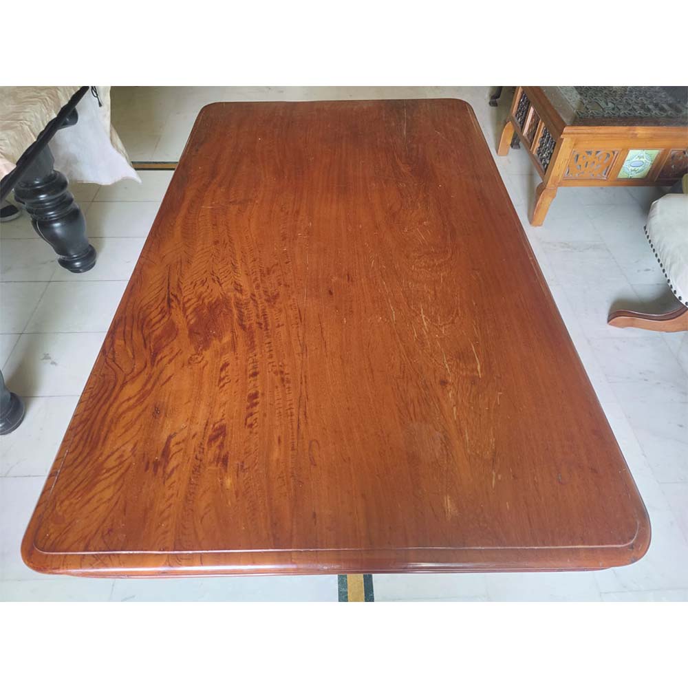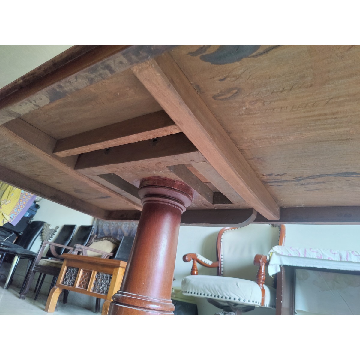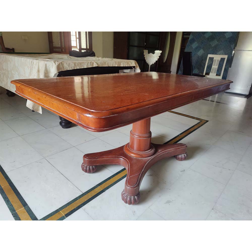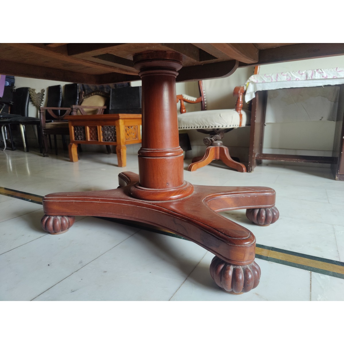 Vintage dining table in Cherry wood which is prized for its rich, reddish-brown color and smooth grain.Carved 4-footed pedestal adds an elegant touch and provides sturdy support for the table. his timeless piece seats 6 people.