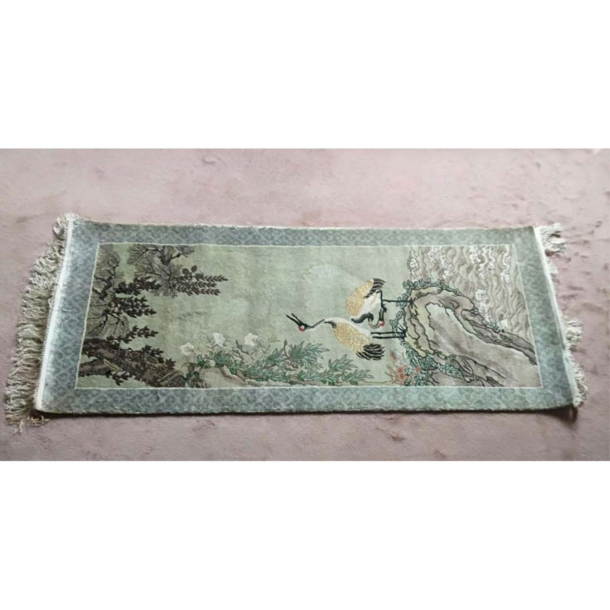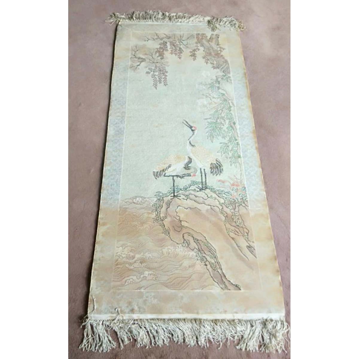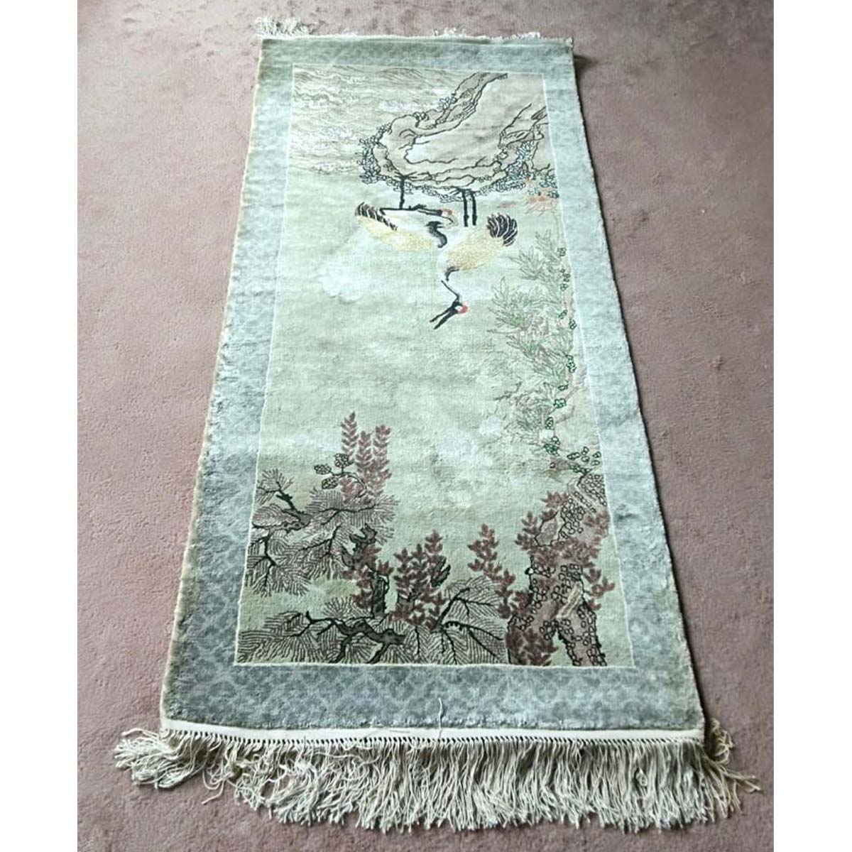 Vintage Chinese hand knotted carpet in silk, with Red Crested Manchurian Cranes. This landscape carpet is for wall hanging.