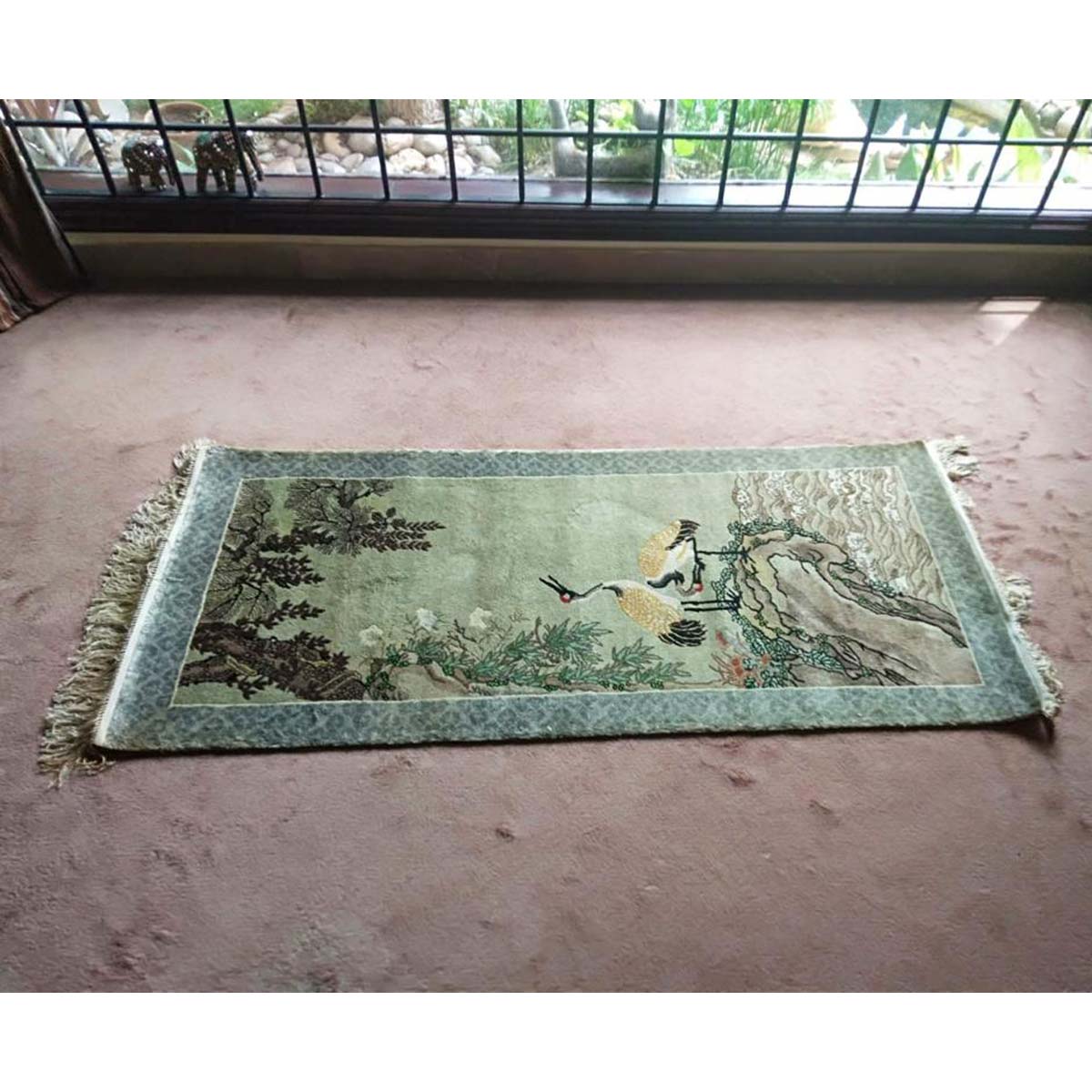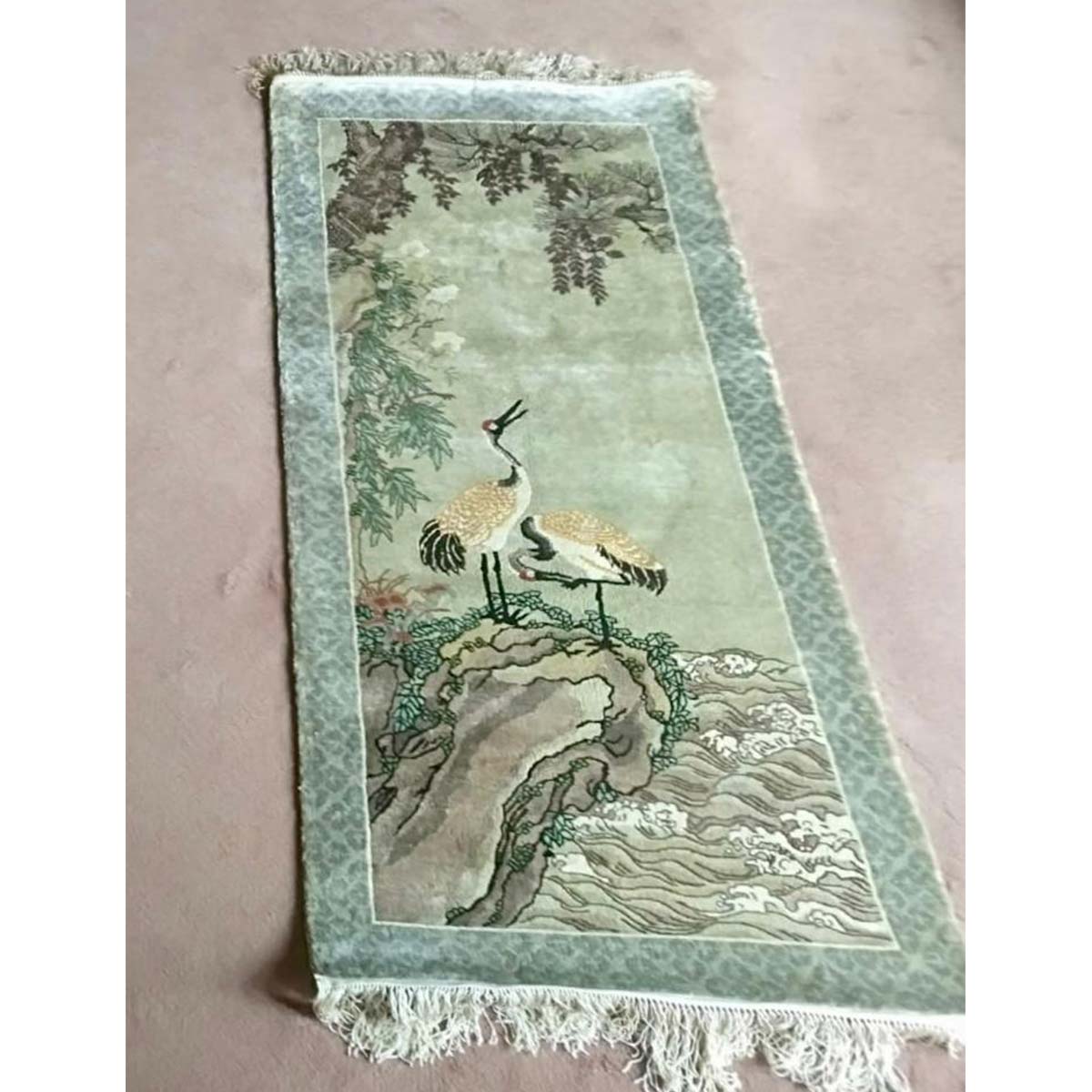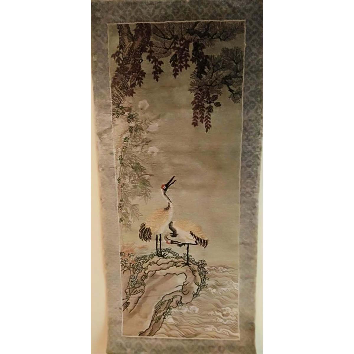 Vintage Chinese hand knotted carpet in silk, with Red Crested Manchurian Cranes. This landscape carpet is for wall hanging.