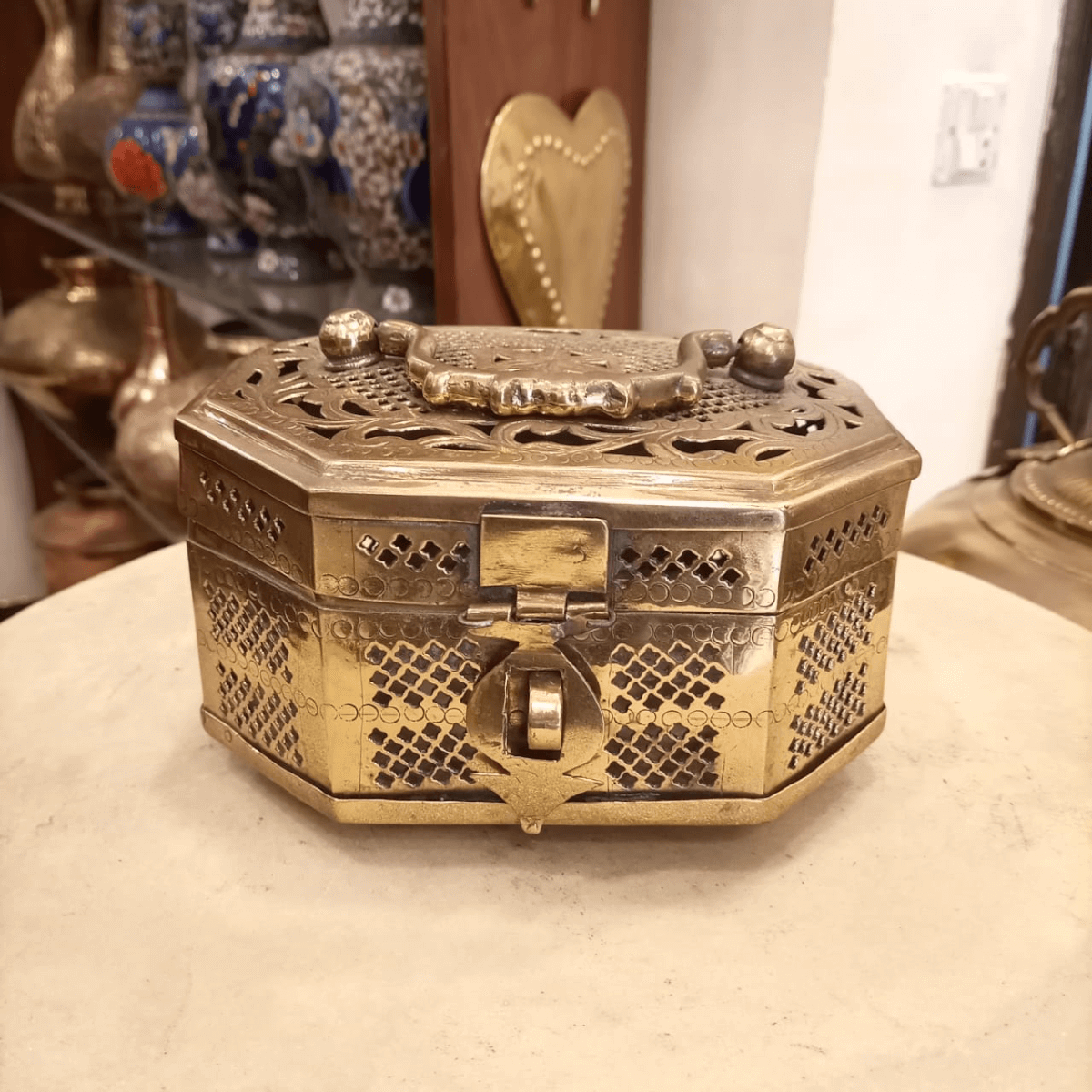 Vintage jewelry box with filigree carving in hexagon shape in brass.