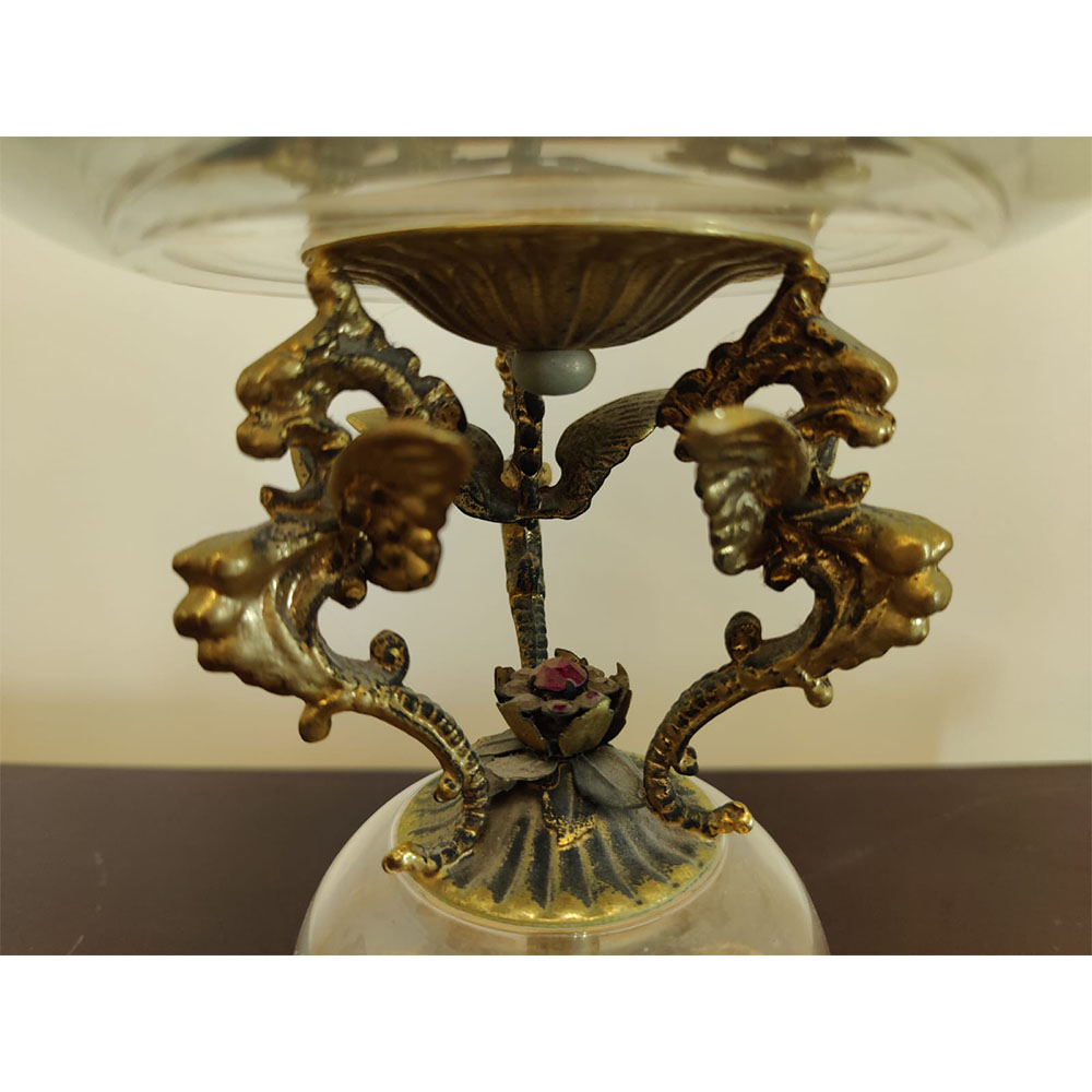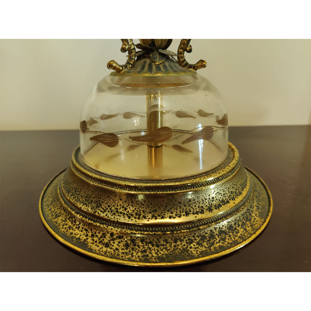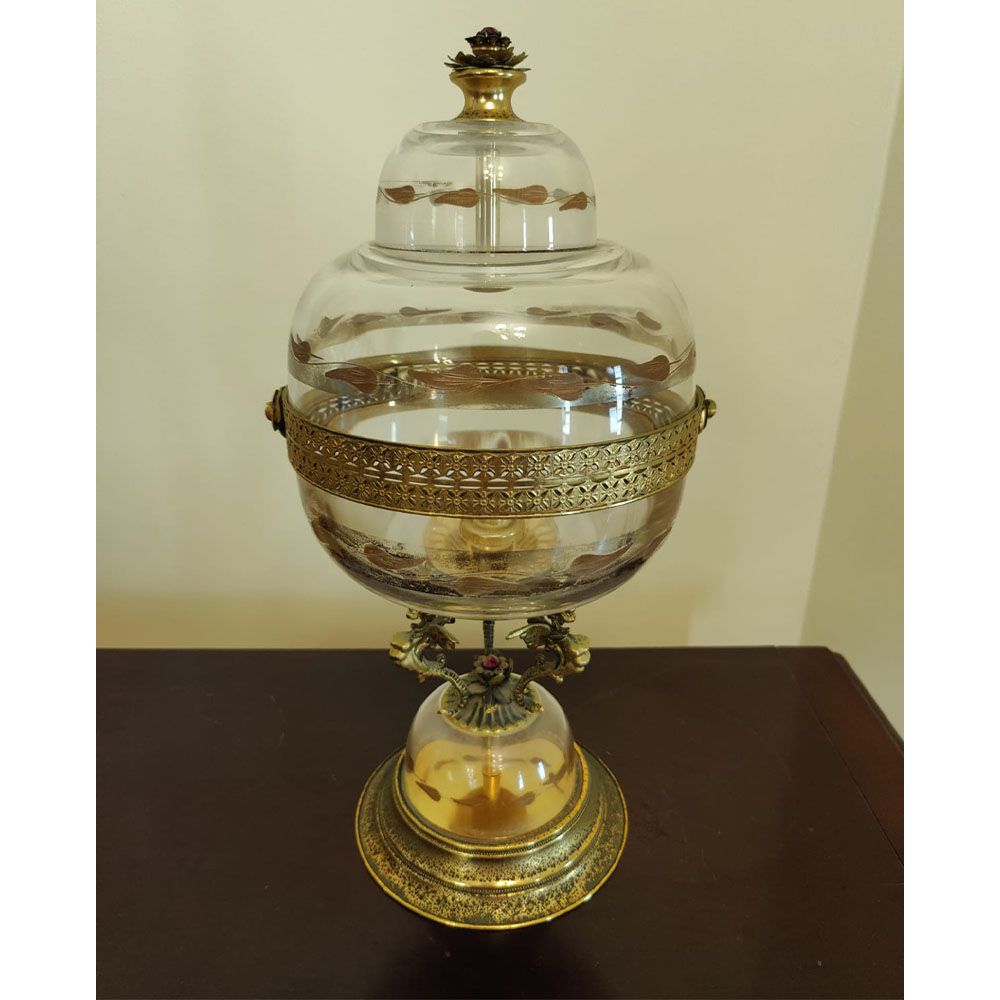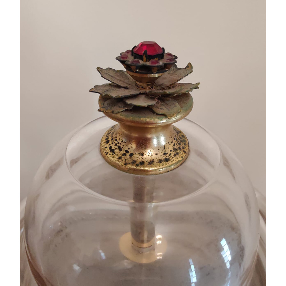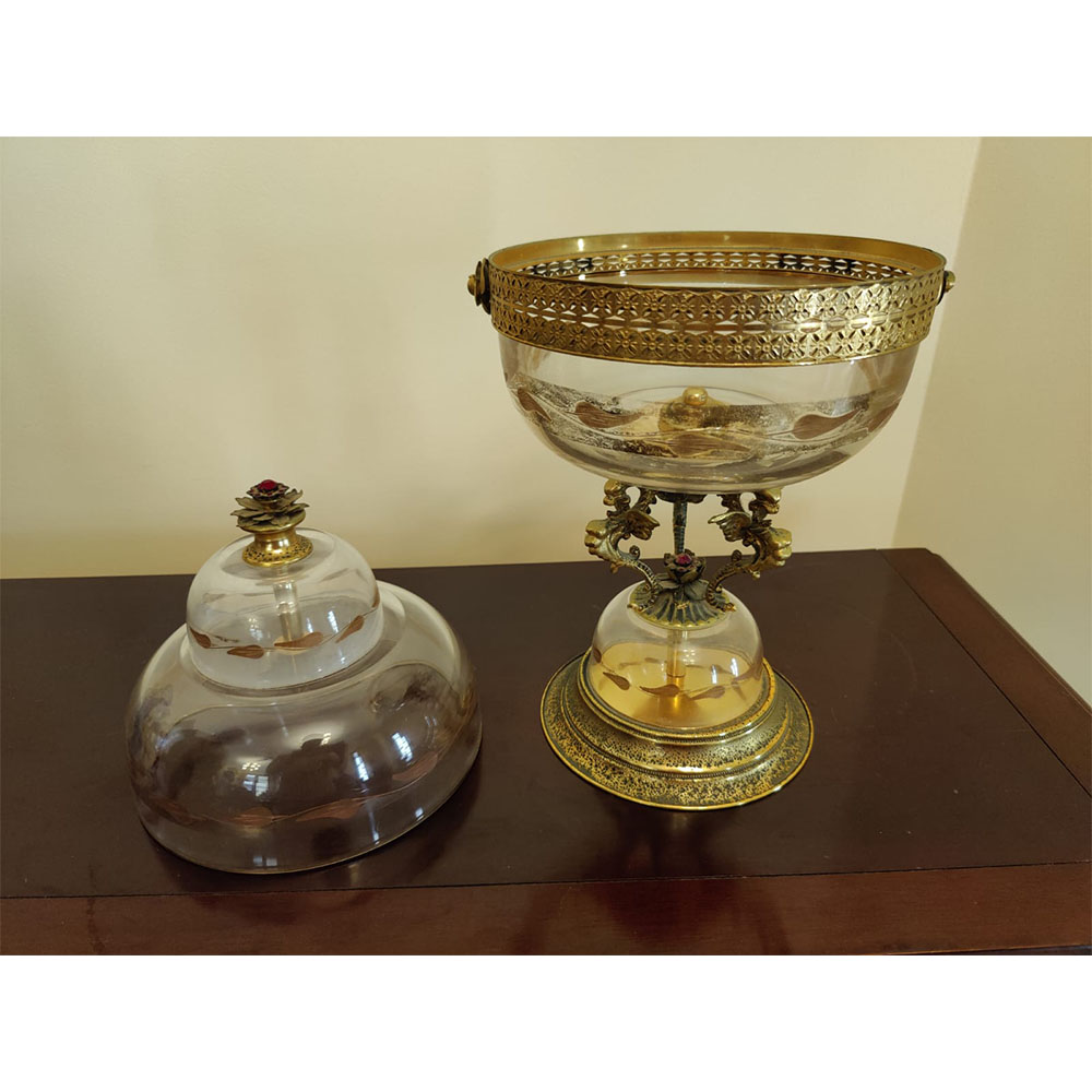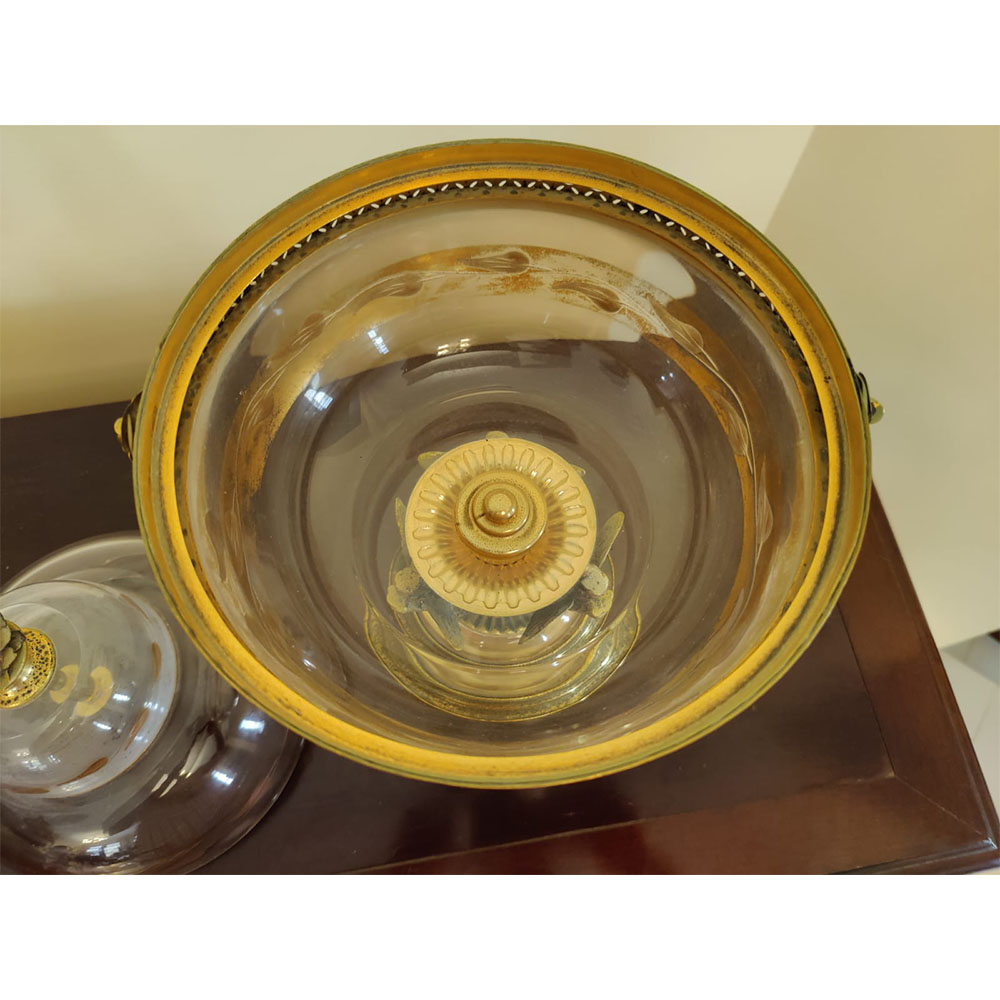Vintage glass bonbonniere is a beautiful centerpiece or decorative accessory. The round body is adorned with intricate gold-toned metal bands and features delicate etched details. A domed lid with a gold-toned finial sits atop the jar, securely closing it. The base is a matching gold-toned metal stand with a decorative motif. This piece is perfect for displaying candies, chocolates, or other small treats.