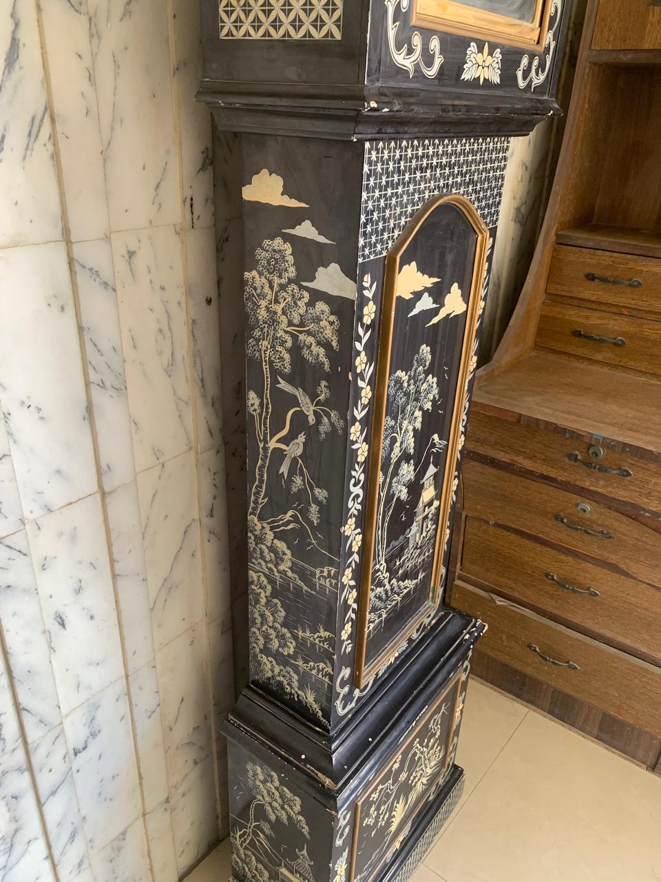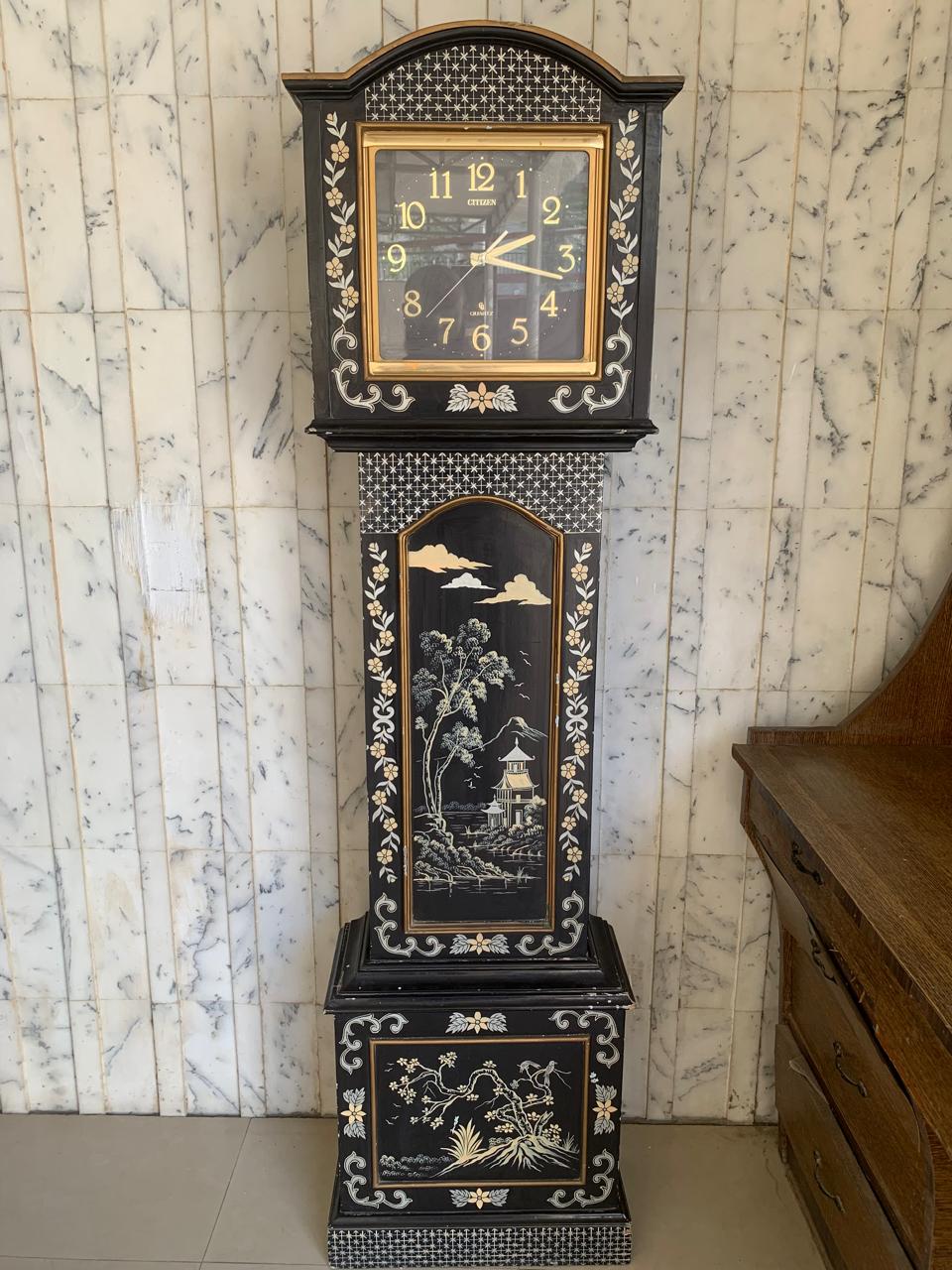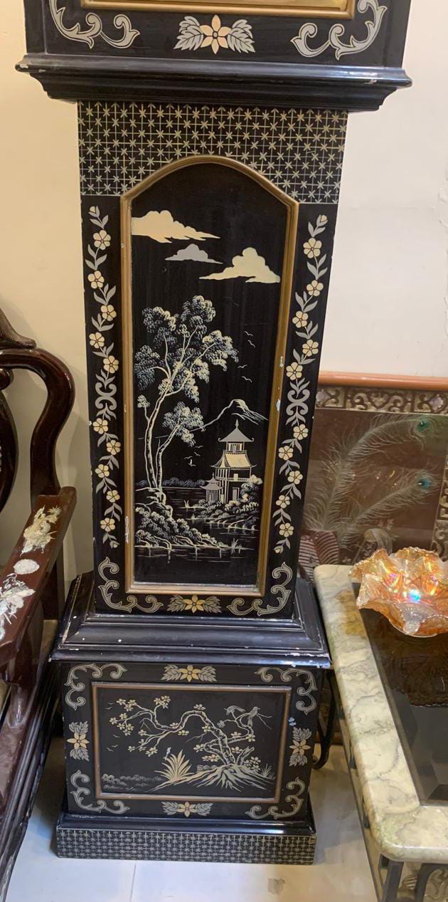 This striking grandfather clock is a unique blend of traditional artistry and modern convenience. The tall wooden frame showcases exquisite vintage Chinese hand-painted details, featuring delicate floral motifs and serene landscapes. The clock face has been thoughtfully updated with a battery-operated mechanism, ensuring accurate, low-maintenance timekeeping.
