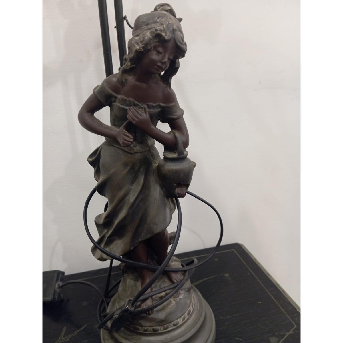 | Material | Cold cast resin (figures) Metal (frame and detailing) Hand-blown floral glass shades |