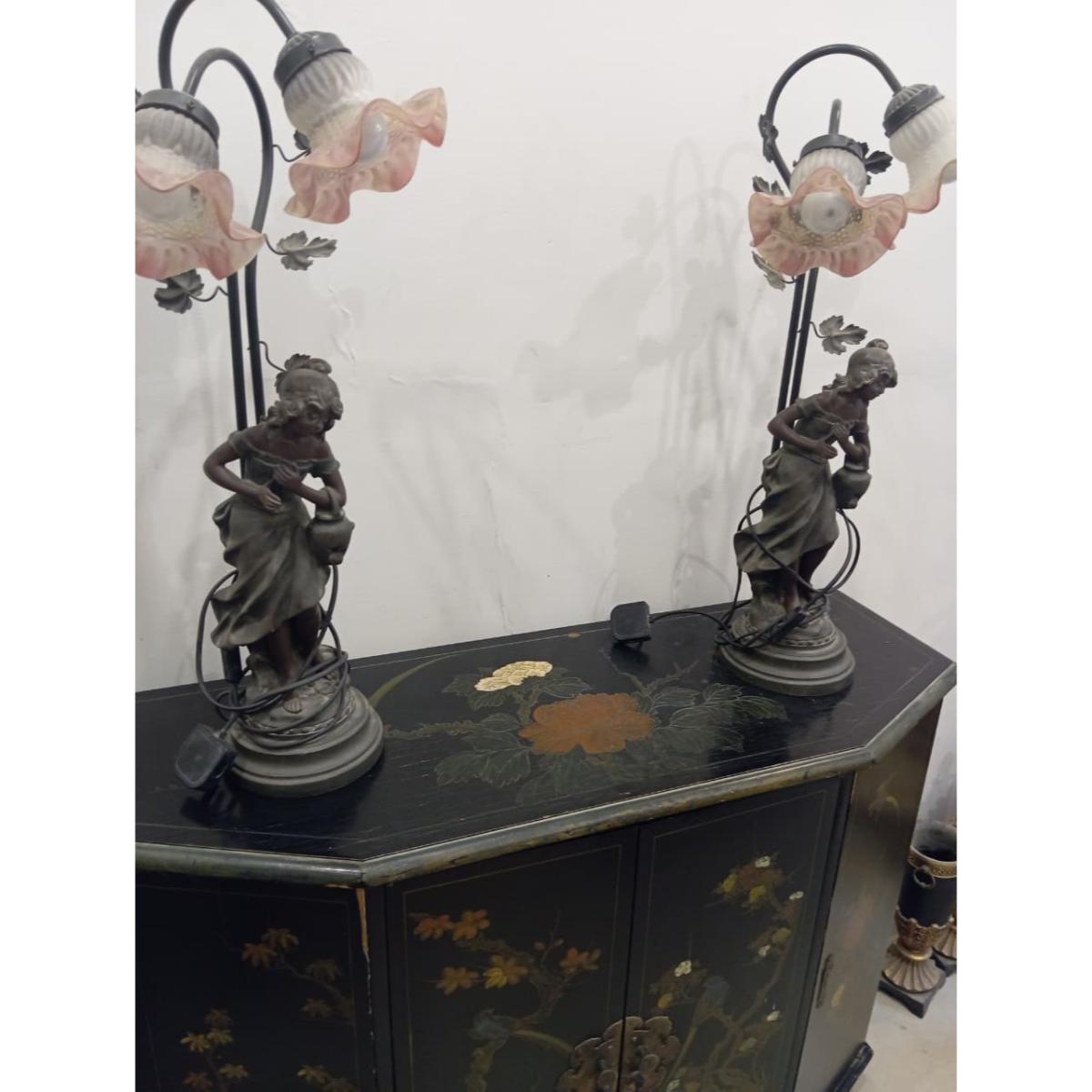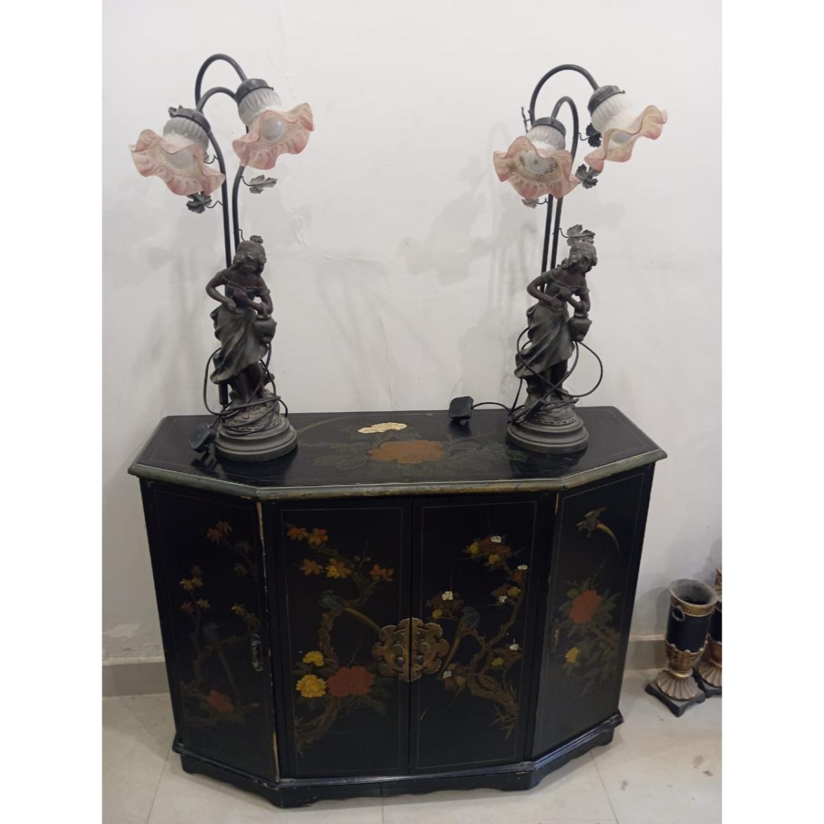 A stunning pair of vintage Italian lamps crafted from gold cast resin and metal, featuring elegant female figures and floral glass shades. These lamps are a true collector’s item, blending fine craftsmanship with timeless European charm. Perfect for display in a living room, study, or as statement bedside pieces.
