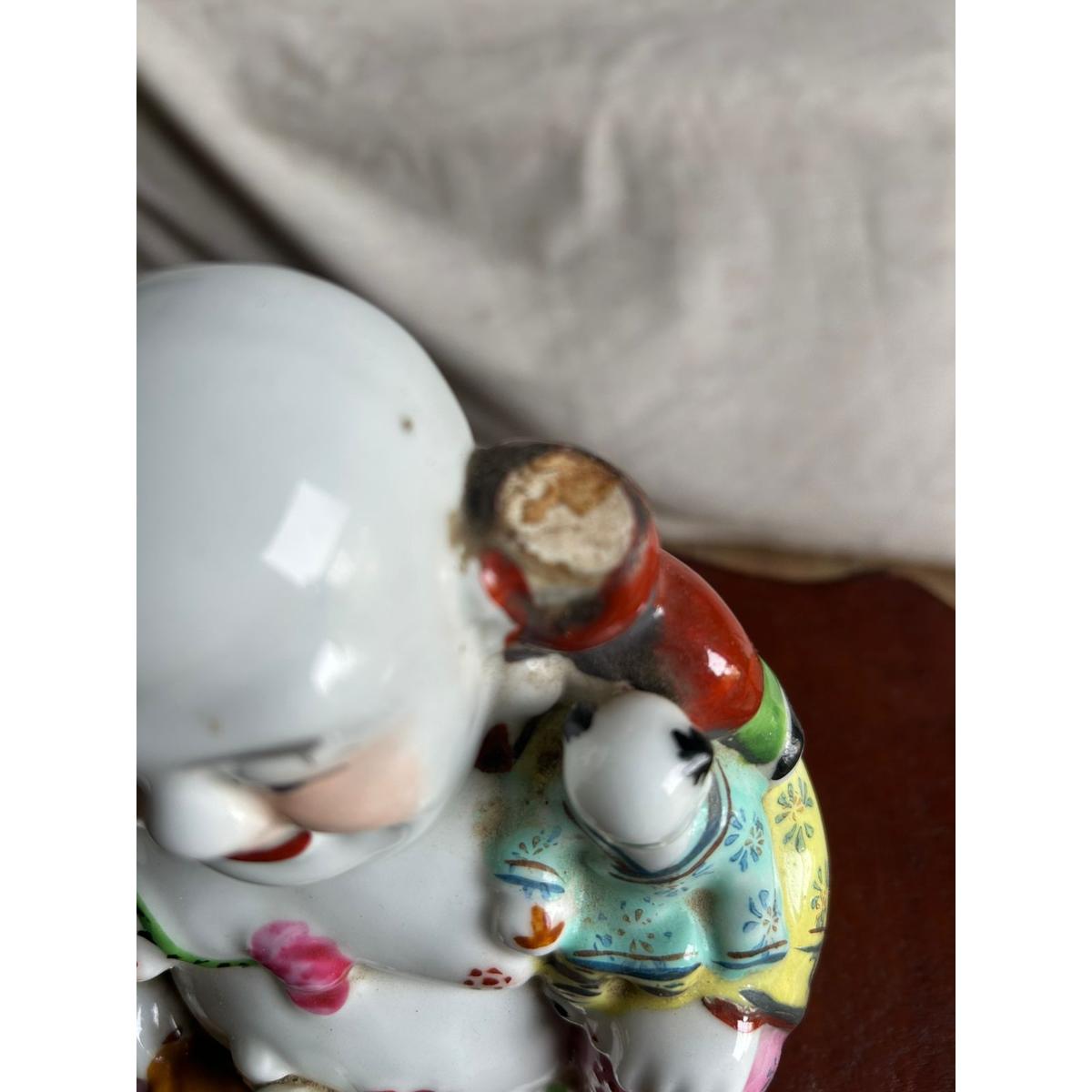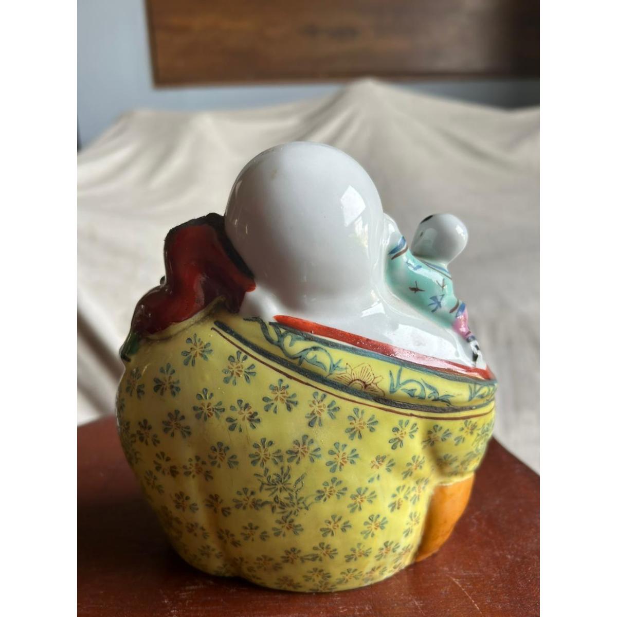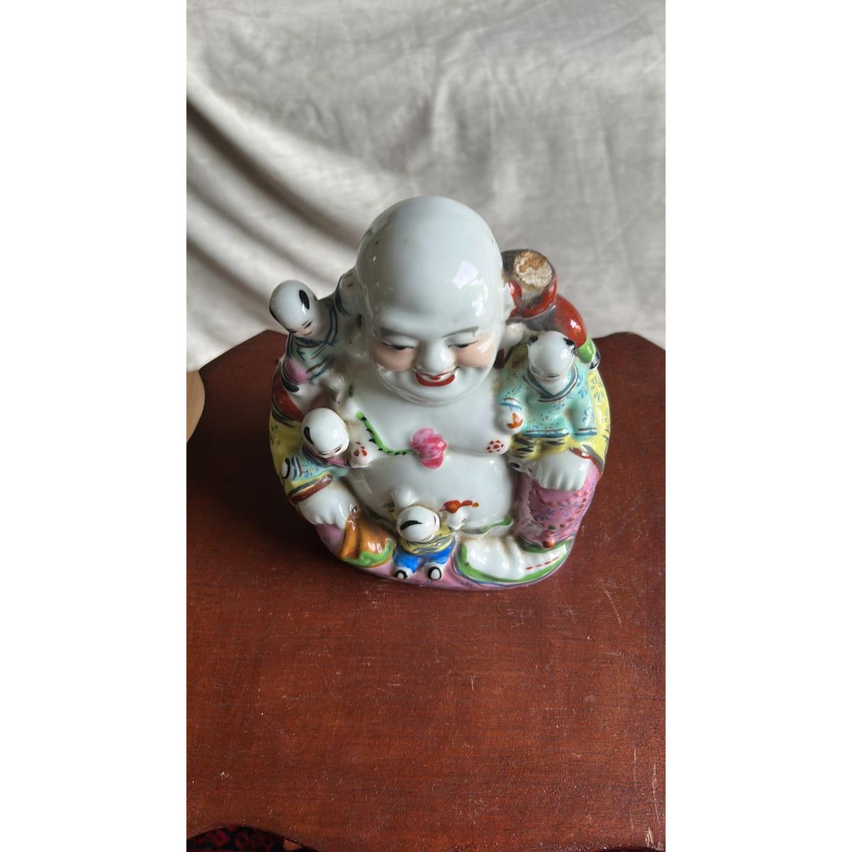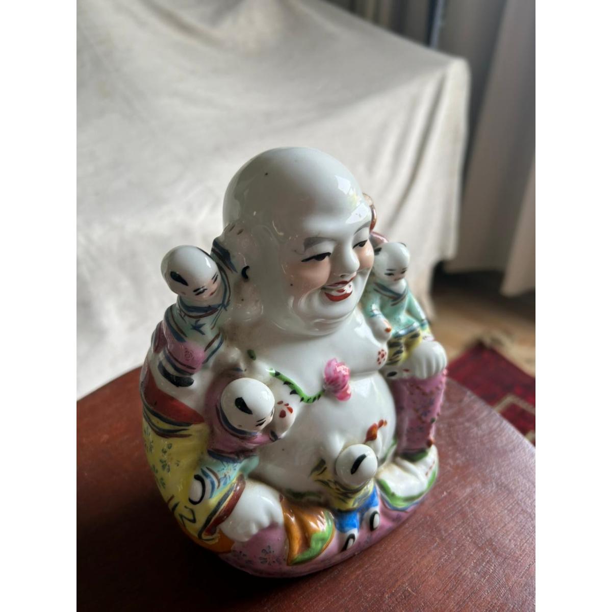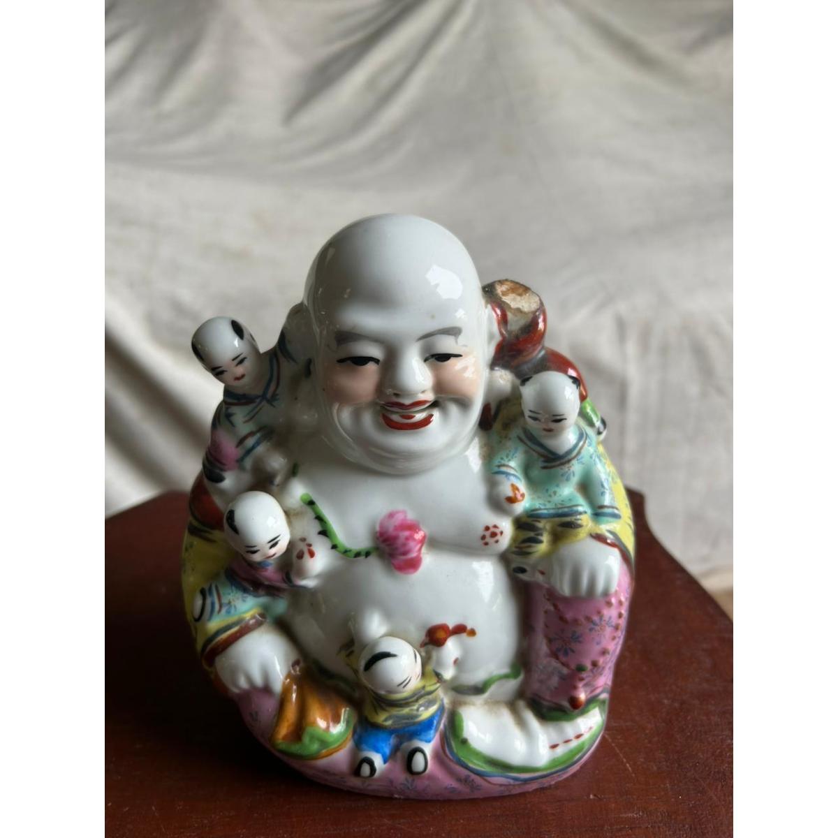 Vintage hand-painted porcelain statue depicting the Laughing Buddha surrounded by five joyful children, symbolizing happiness, abundance, and good fortune. This vintage collectible showcases vibrant colors and intricate detailing, perfect for collectors of decorative piece.