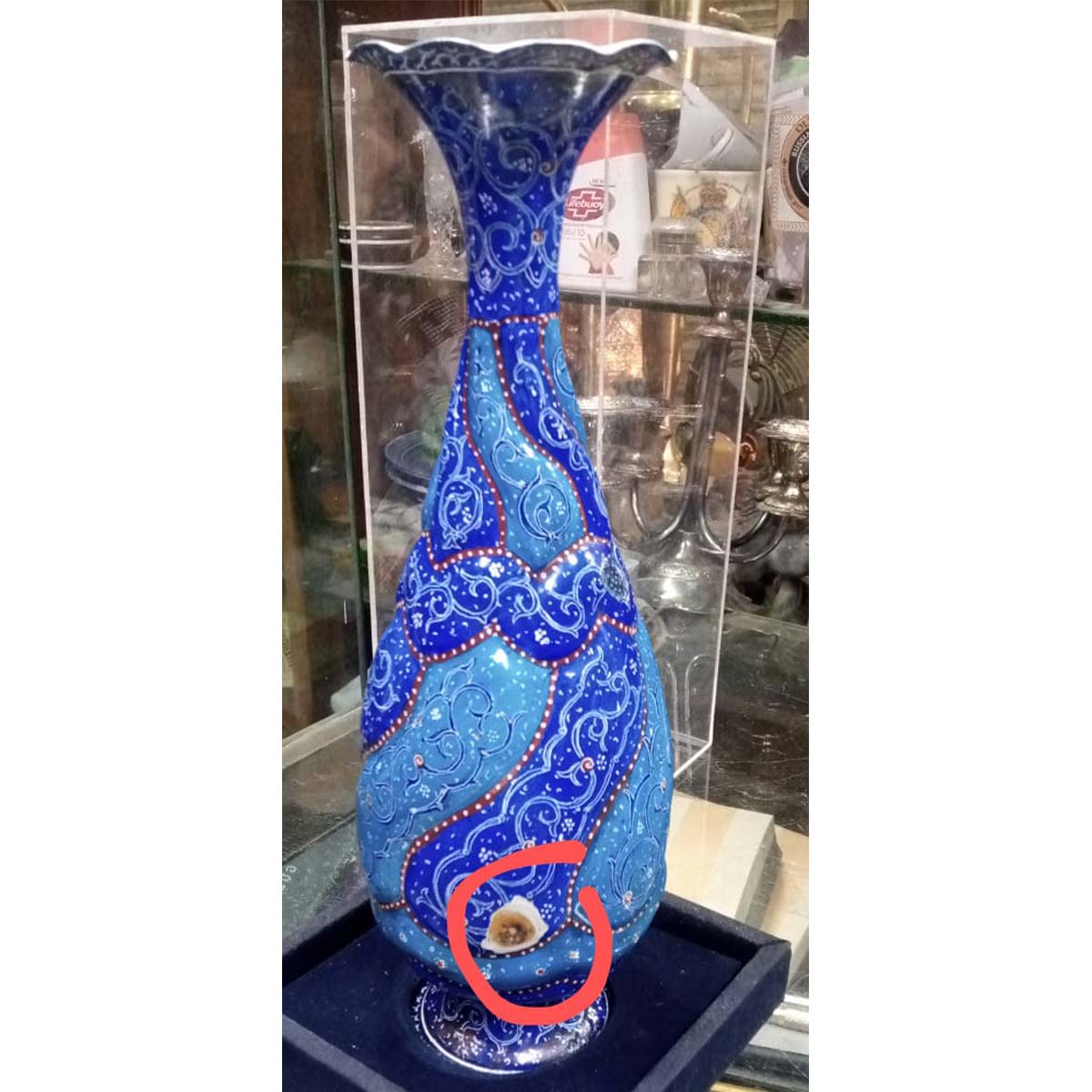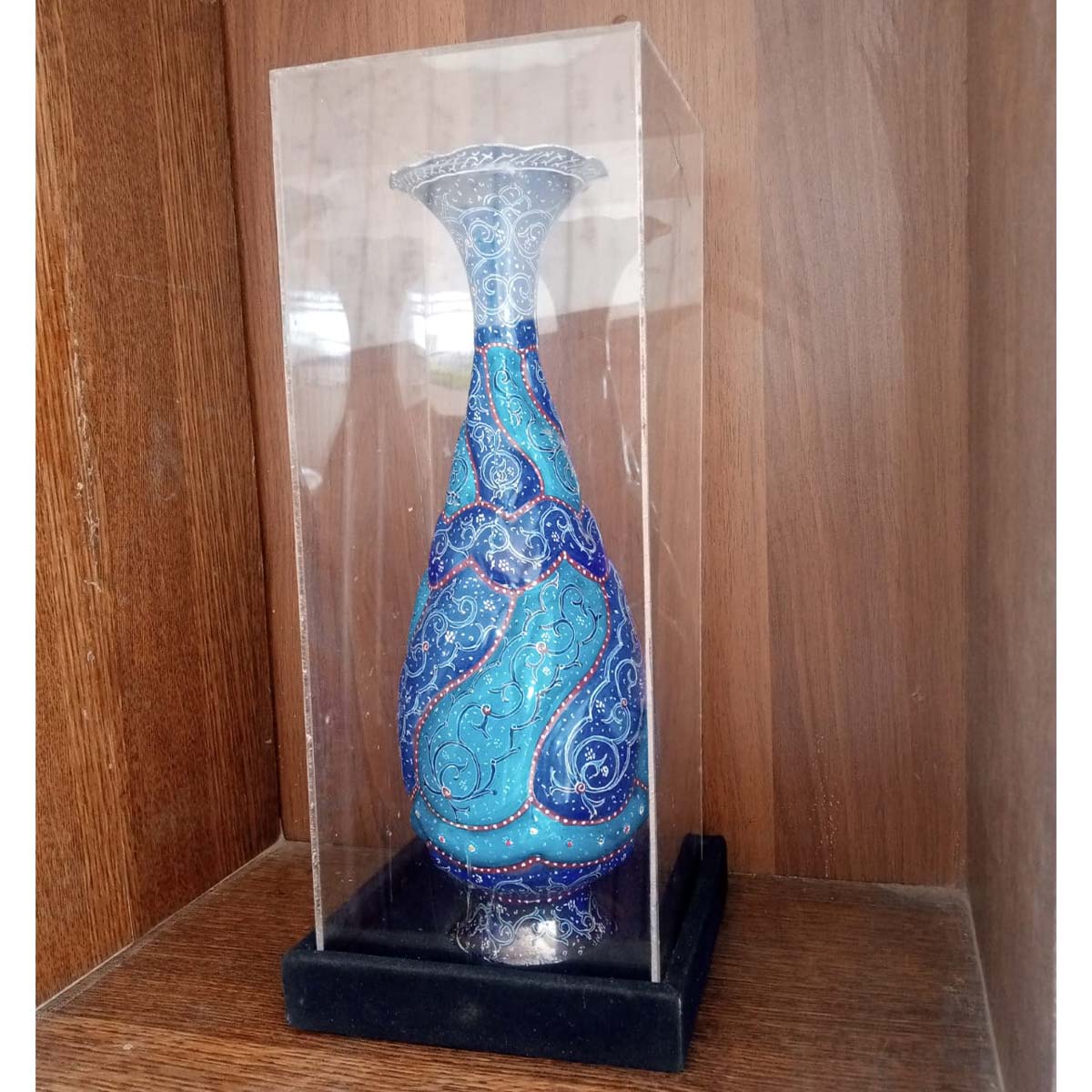Vintage Persian vase in copper with enamel hand work in quintessential Iranian colors of Cobalt and Azure blue. Available in a clear box.