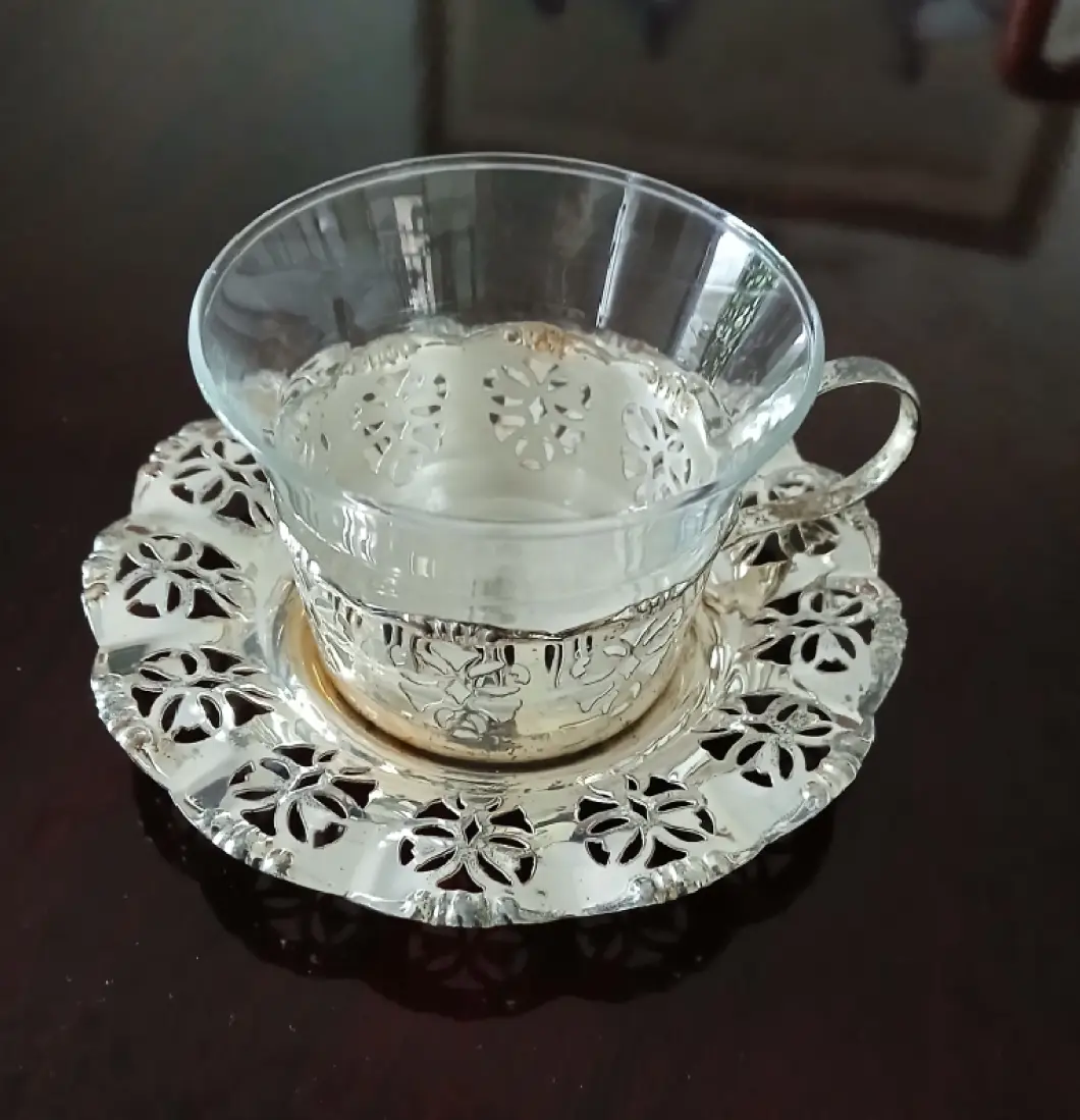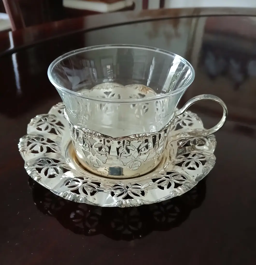Vintage silver plated Queen Anne teacup with a glass insert and saucer. Can be used as a condiments server. Made in England.