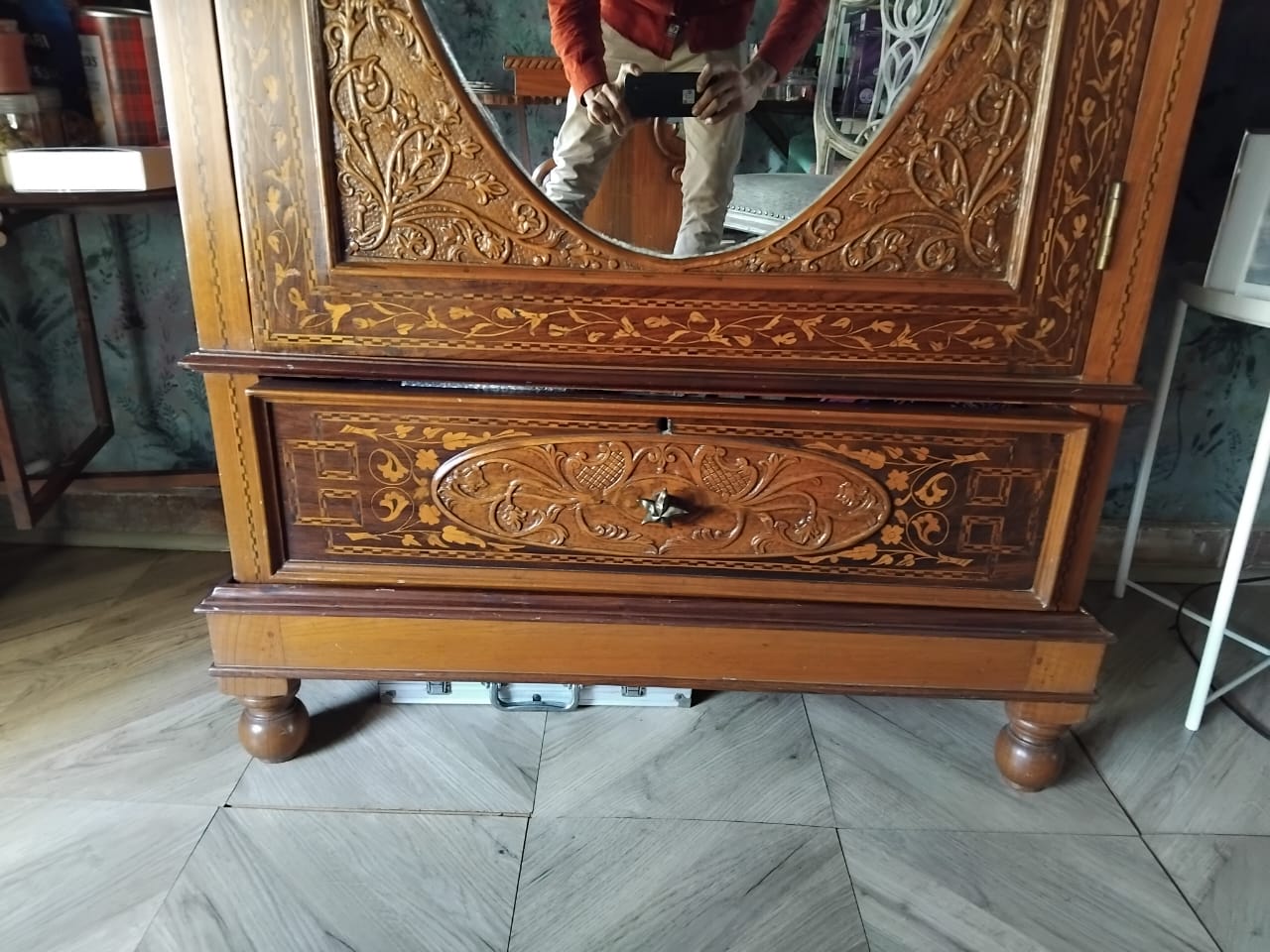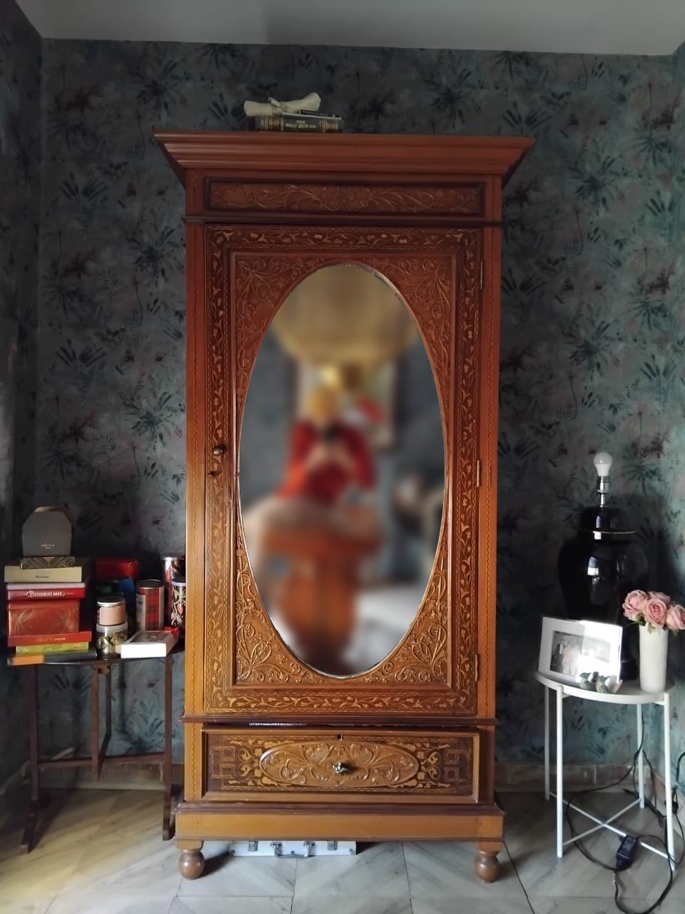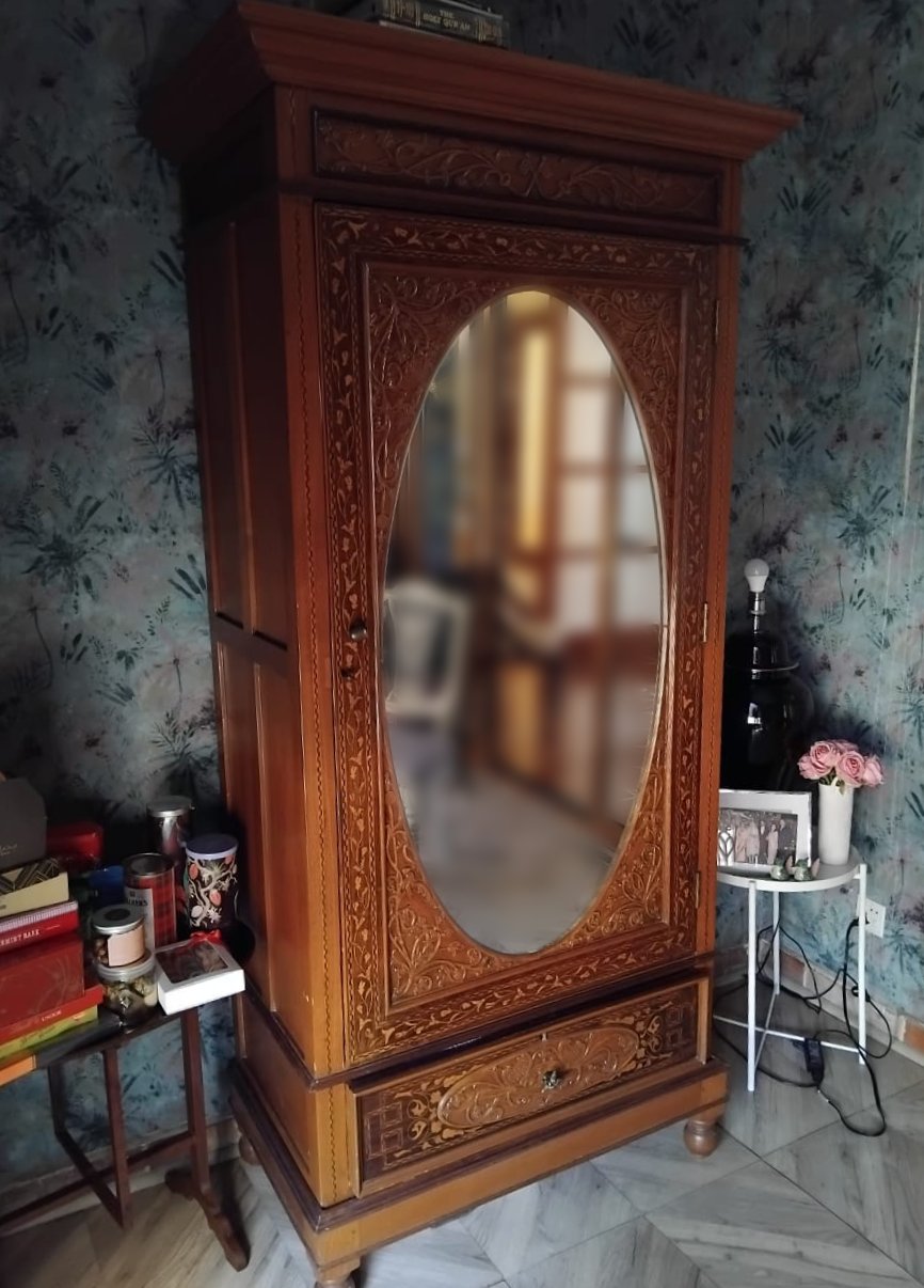 Embrace classic charm with this vintage wardrobe crafted from Sheesham featuring beautiful carved and inlay detailing throughout and a gracefully shaped beveled oval mirror, this armoire exudes old-world sophistication.